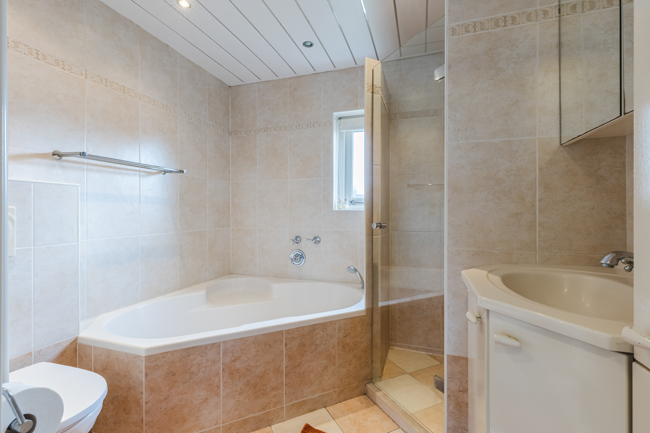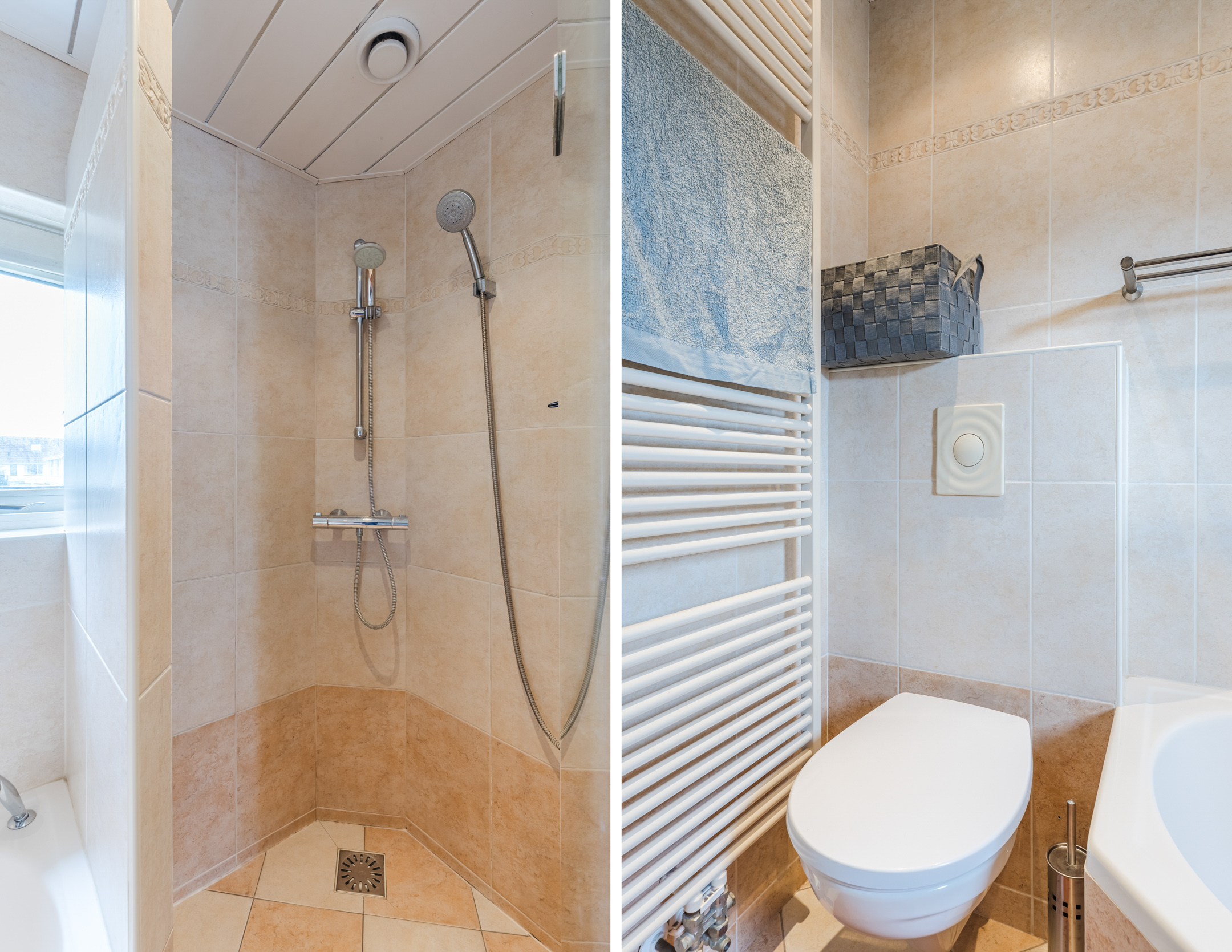 The landing provides access to 3 bedrooms and the bathroom. All bedrooms are neatly finished with a laminate floor; the bathroom has recessed spotlights, a second toilet, a washbasin with vanity unit, a bathtub and a separate walk-in shower.