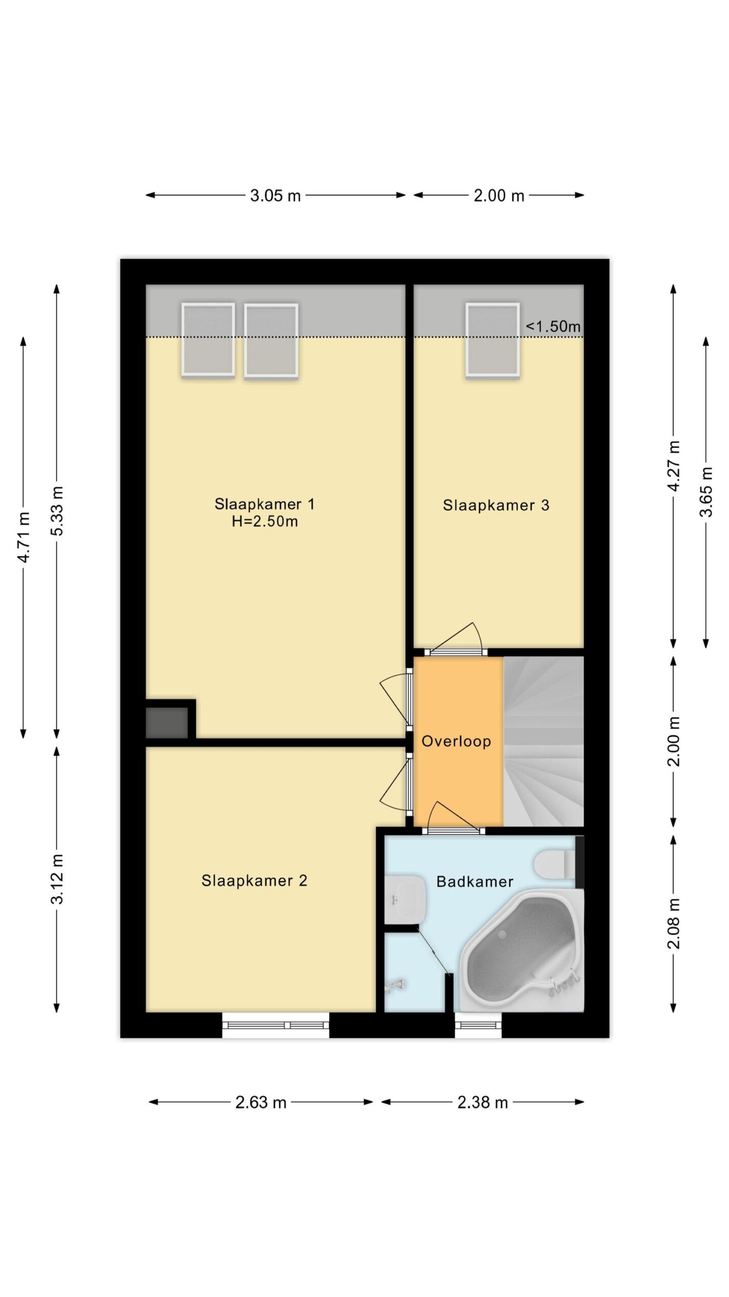 Vanaf de overloop is er toegang tot 3 slaapkamers en de badkamer. Alle slaapkamers zijn keurig afgewerkt met een laminaatvloer; de badkamer is voorzien van inbouwspots, een tweede toilet, een wastafel met meubel, een ligbad en een aparte inloopdouche.