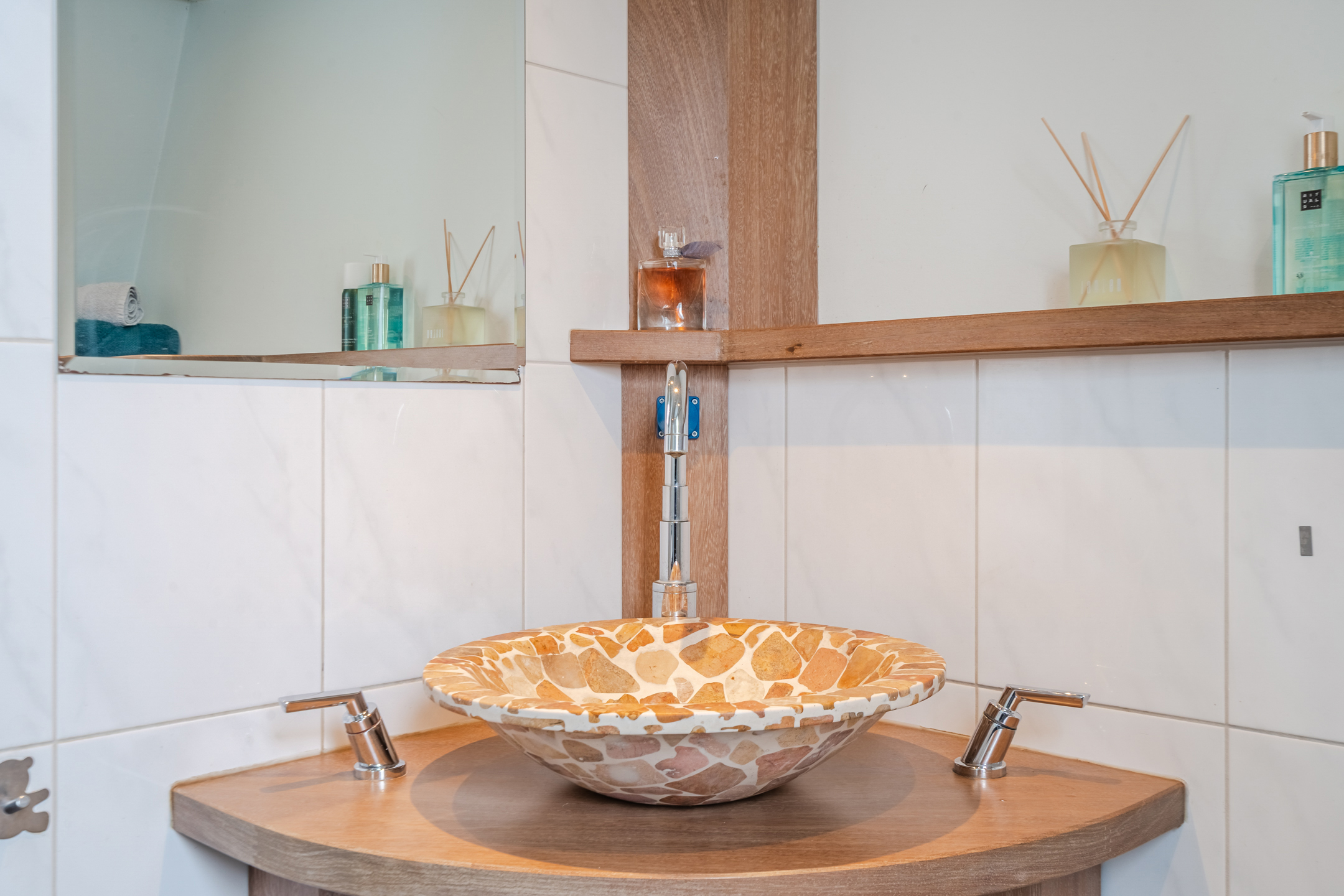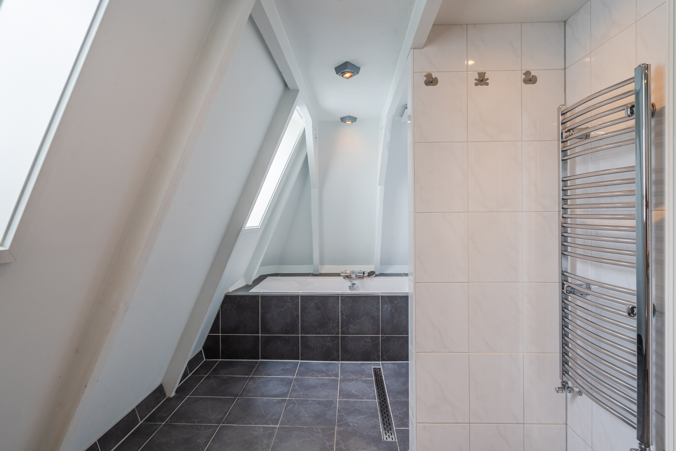 De badkamer is compleet uitgevoerd met douche, wastafel met meubel, ligbad en toilet.