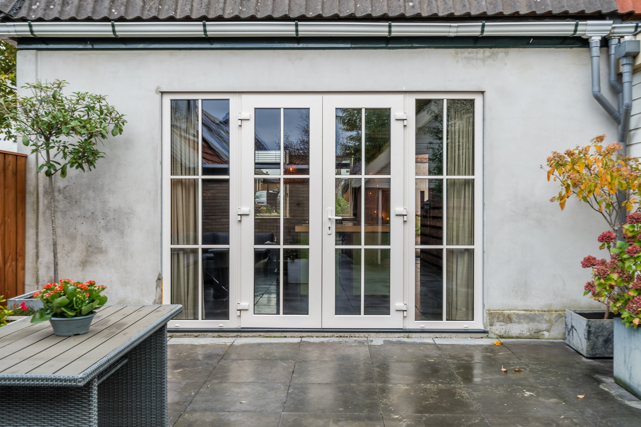 Openslaande deuren naar de achtertuin voorzien van triple glas en geĆÆntegreerde zonwering.