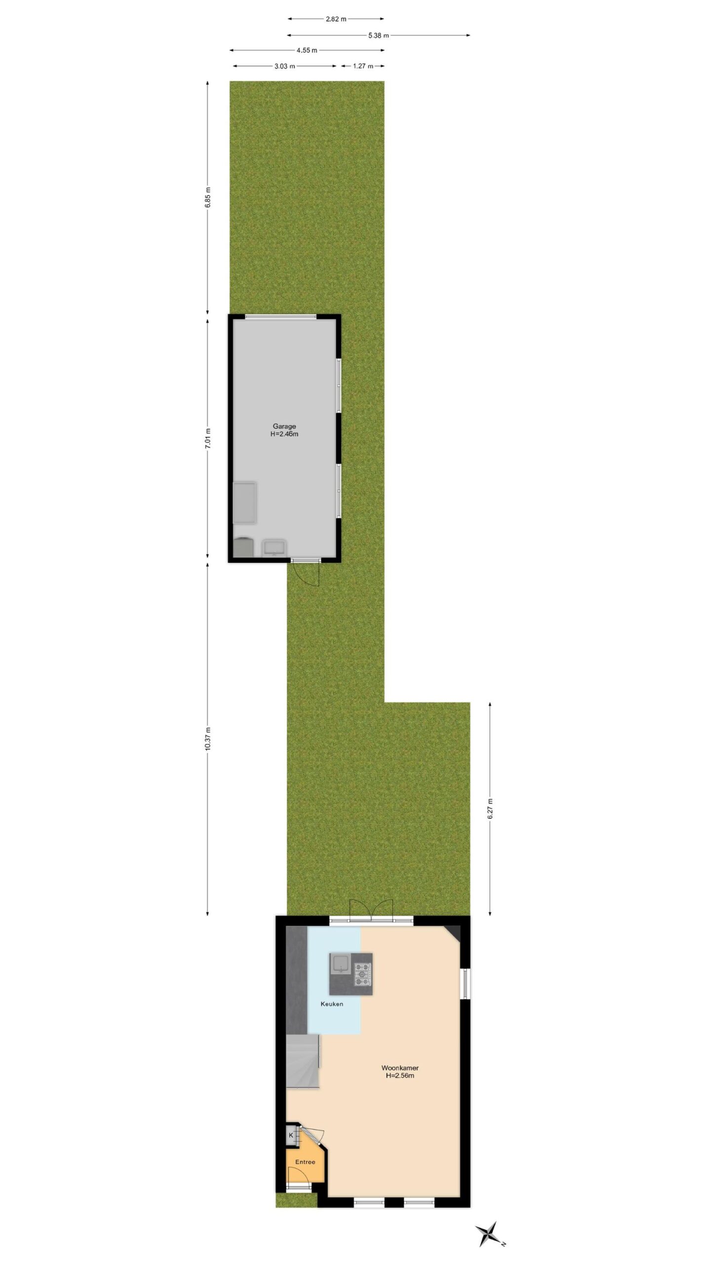 De indeling van de begane grond is efficiĆ«nt en gericht op comfortabel wonen, met veel leefruimte en direct contact met de tuin. De garage (32 m²) met vliering is bereikbaar via de oprit en voorzien van een elektrische garagedeur, wateraansluiting en aansluitingen voor wasmachine en droger. Een ideale plek voor hobbyās, klussen of extra opslagruimte.