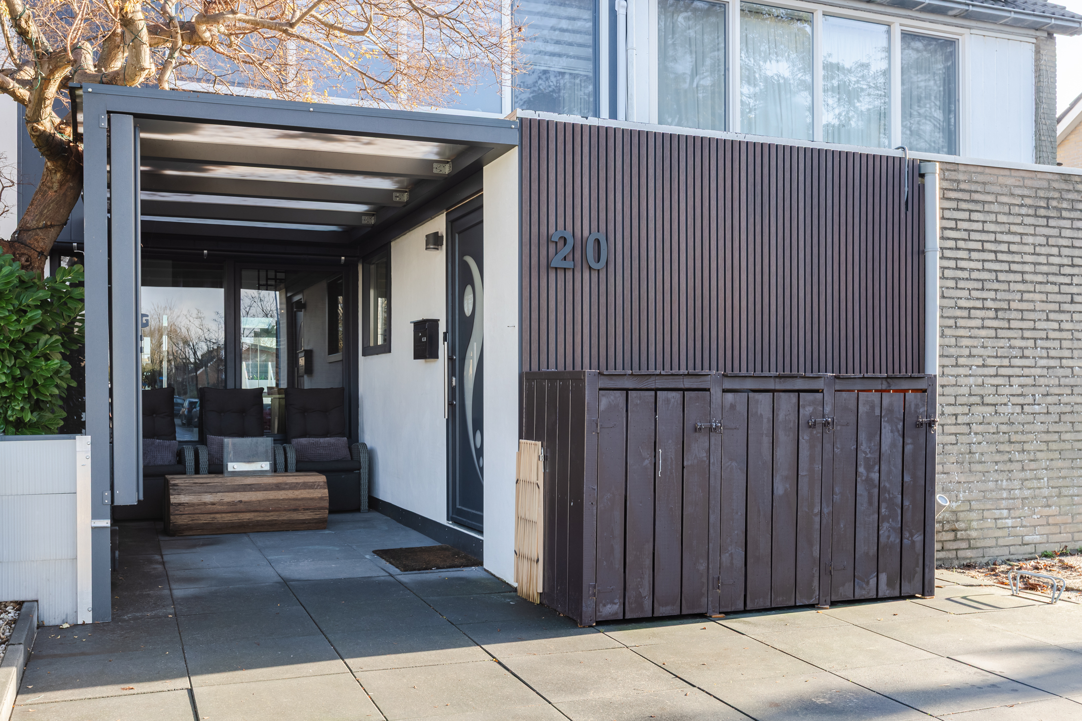 Via de ruime voortuin met oprit en overkapping, komen we aan bij de voordeur van de woning.