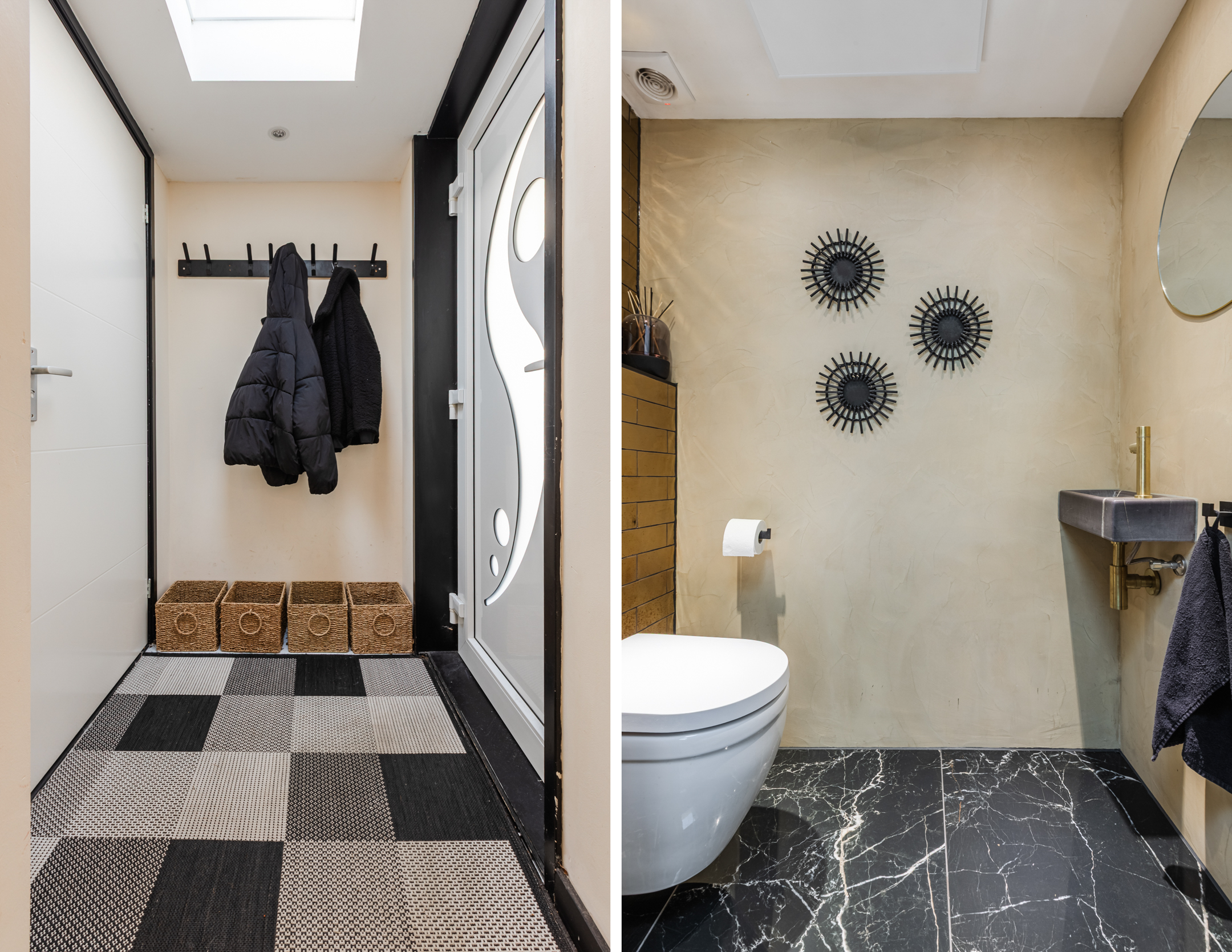 Achter de voordeur vinden we de entree met garderobe, gastentoilet met fonteintje, en toegang tot de woonkamer met open keuken.