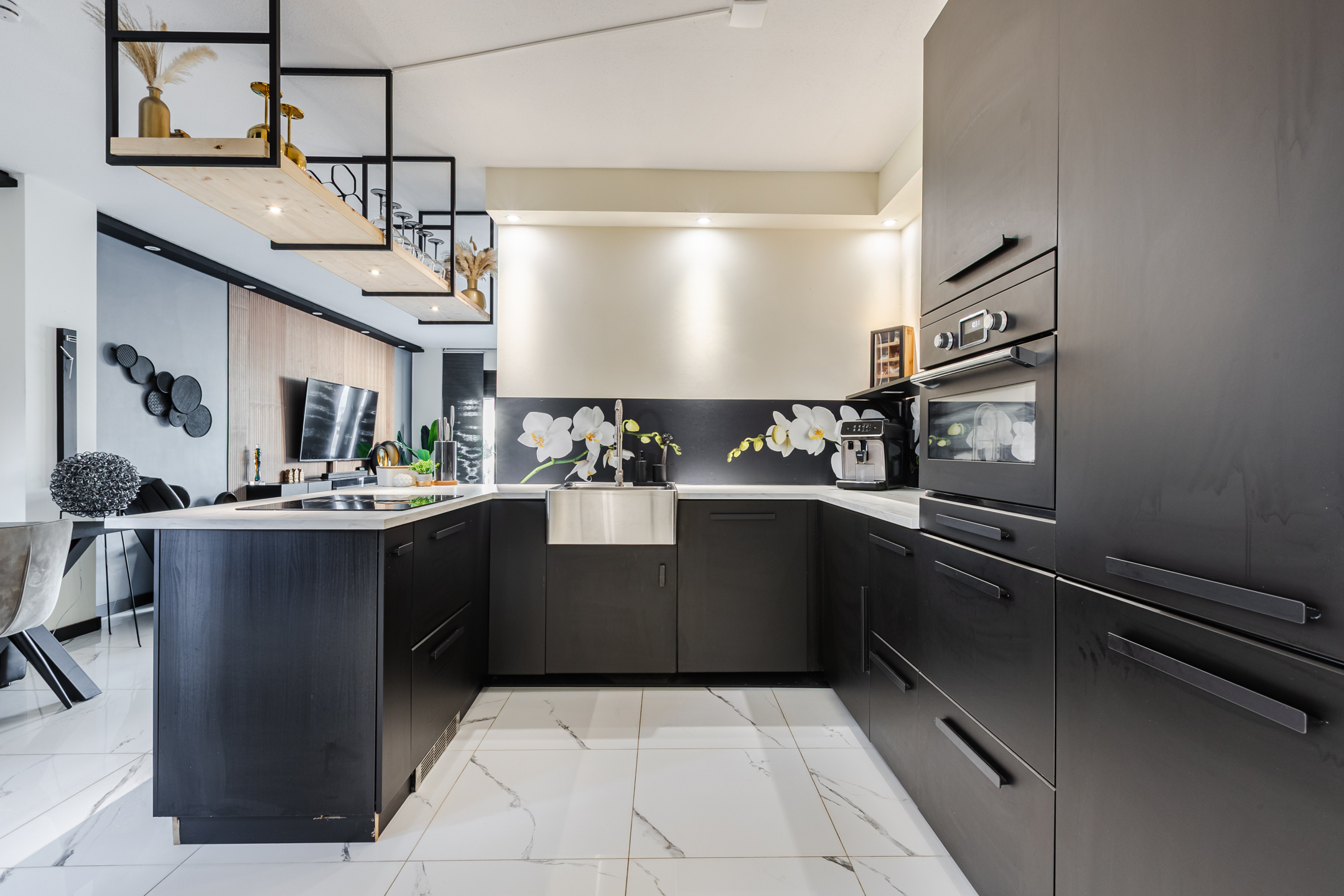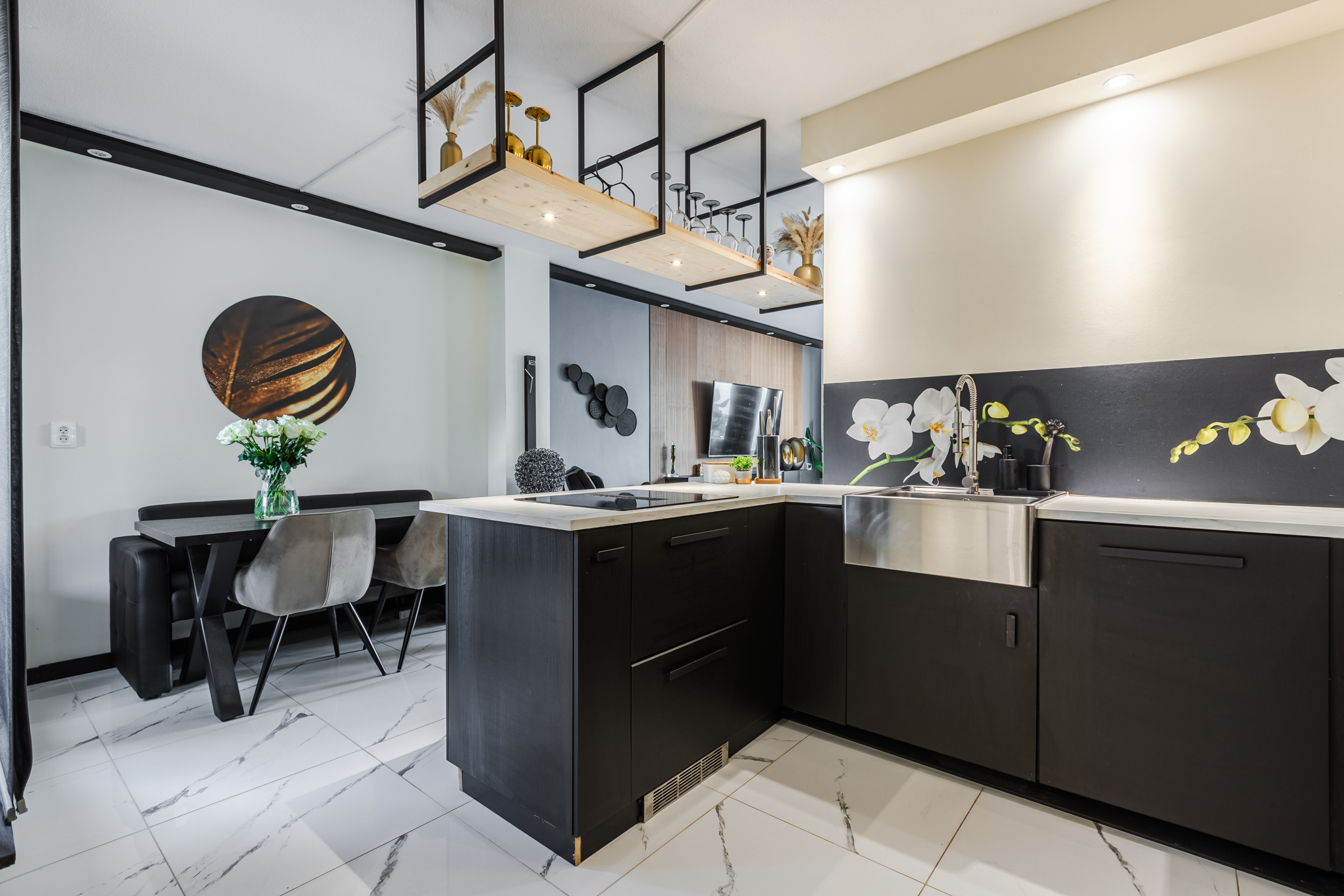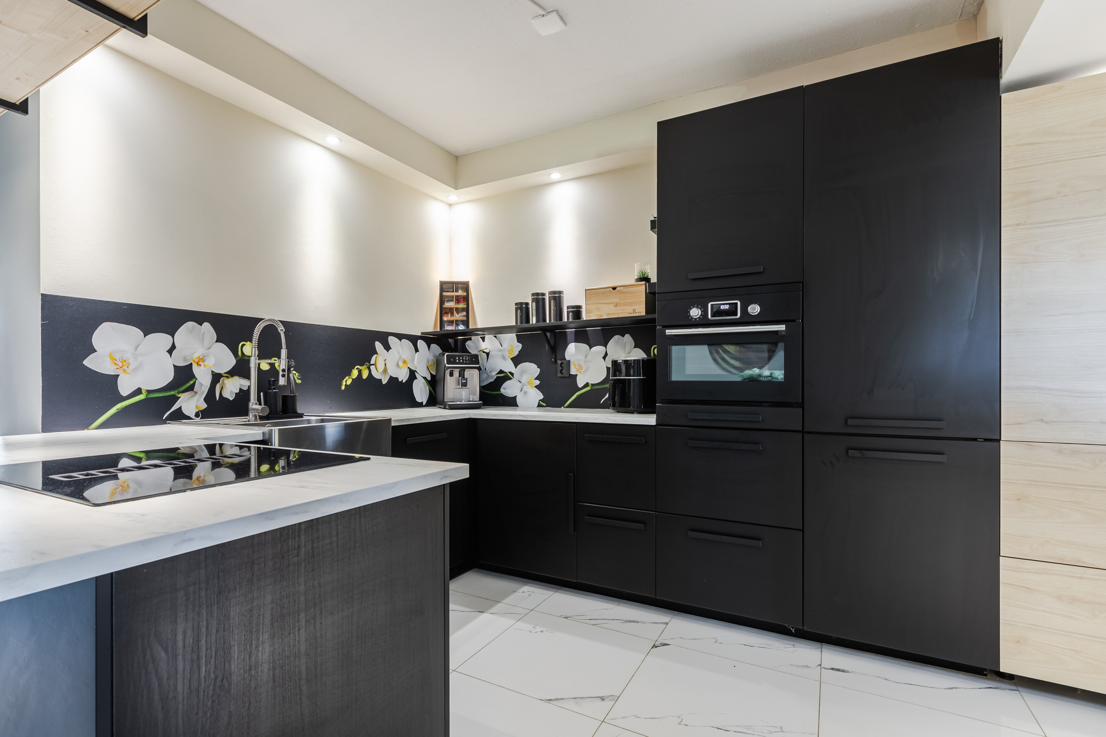 De keuken bevindt zich aan de voorzijde van de woning en is voorzien van een inductiekookplaat, oven, magnetron, koelkast, vriezer en een vaatwasser.