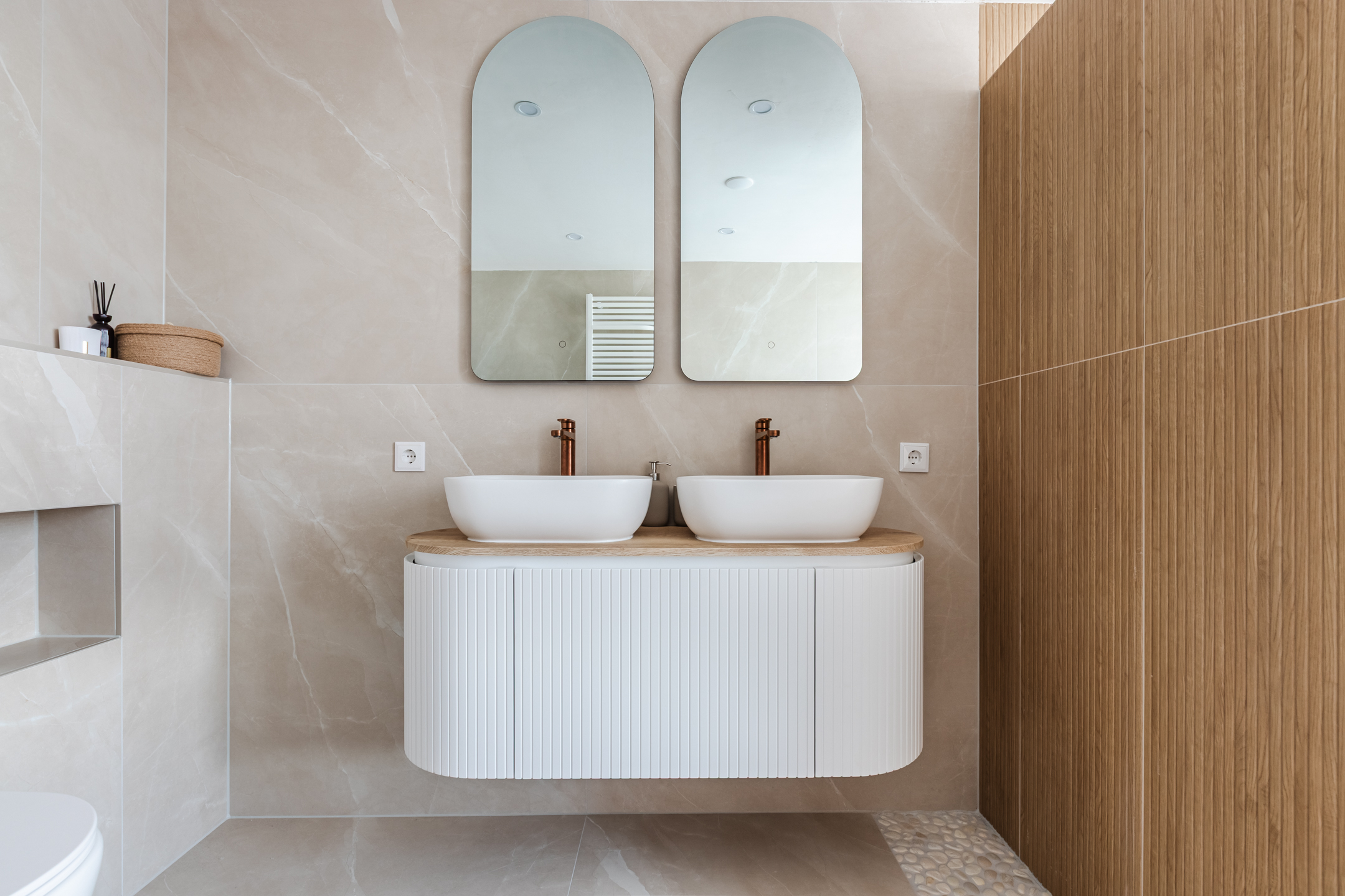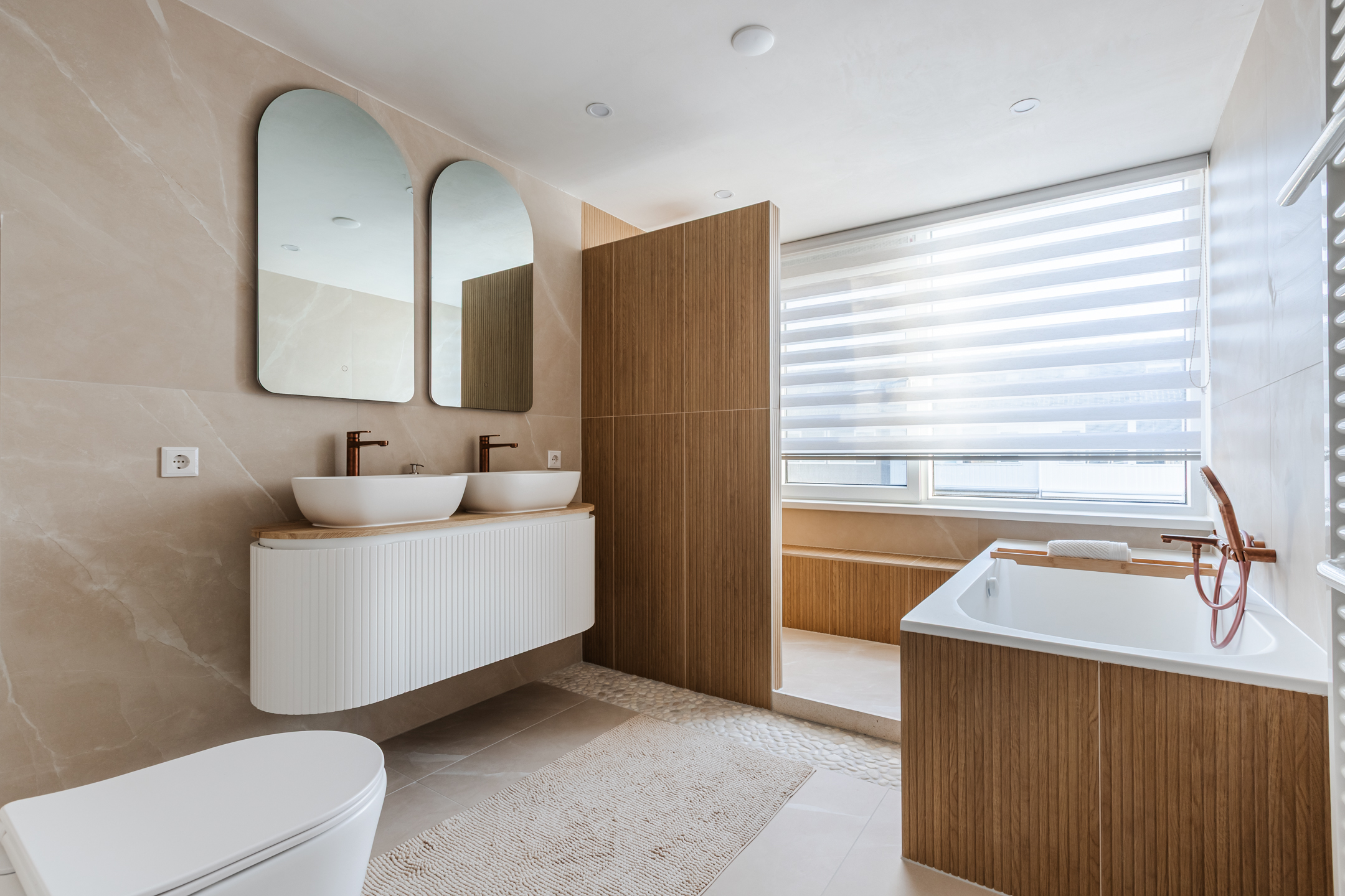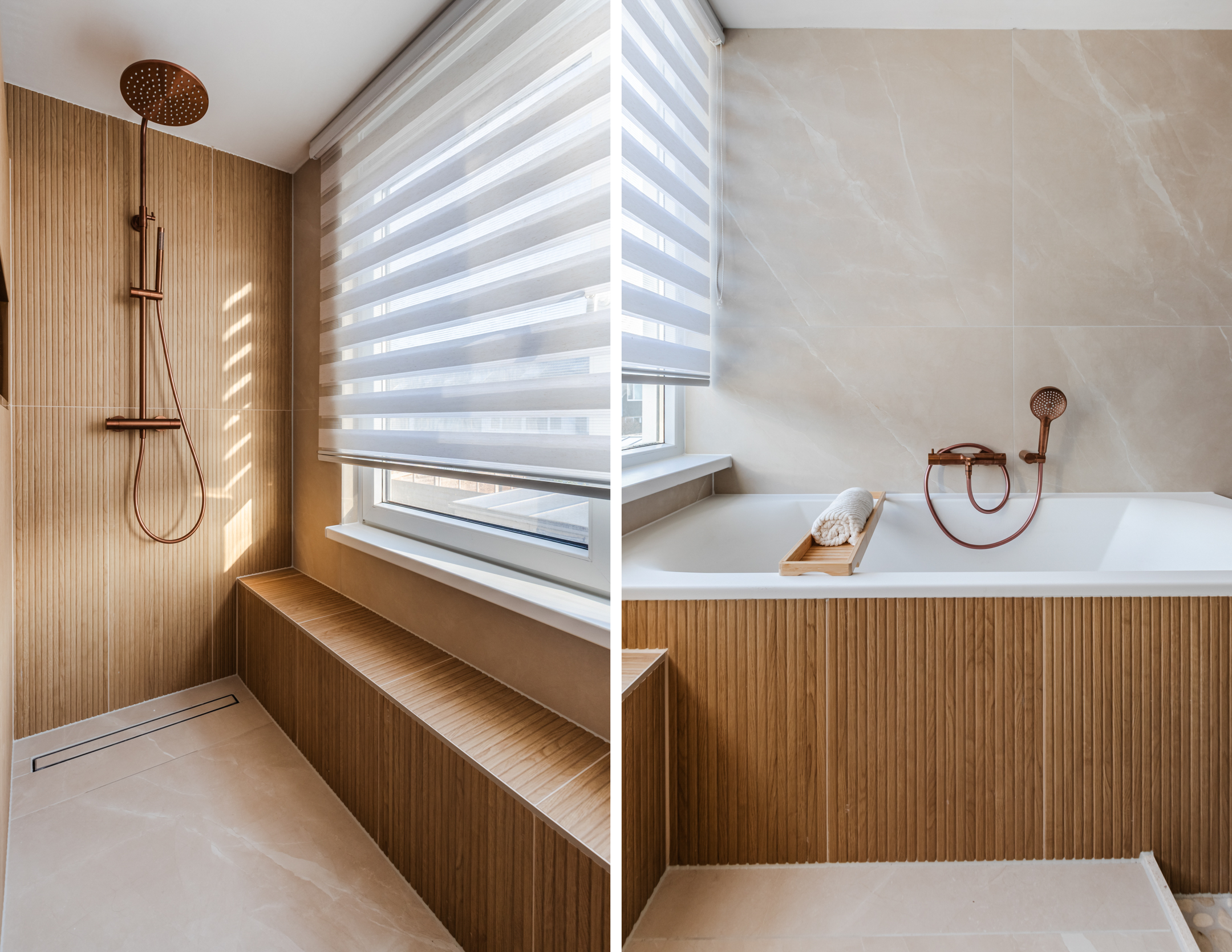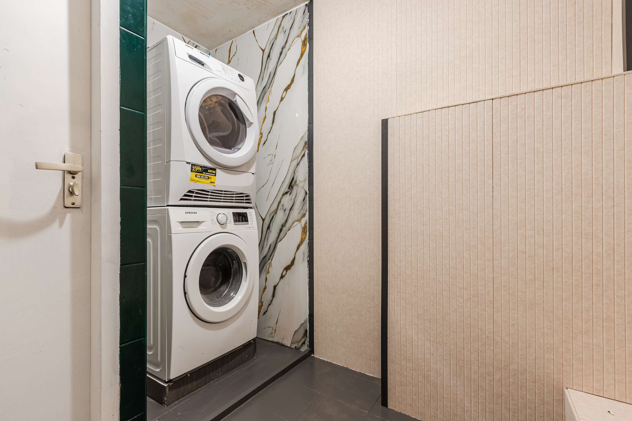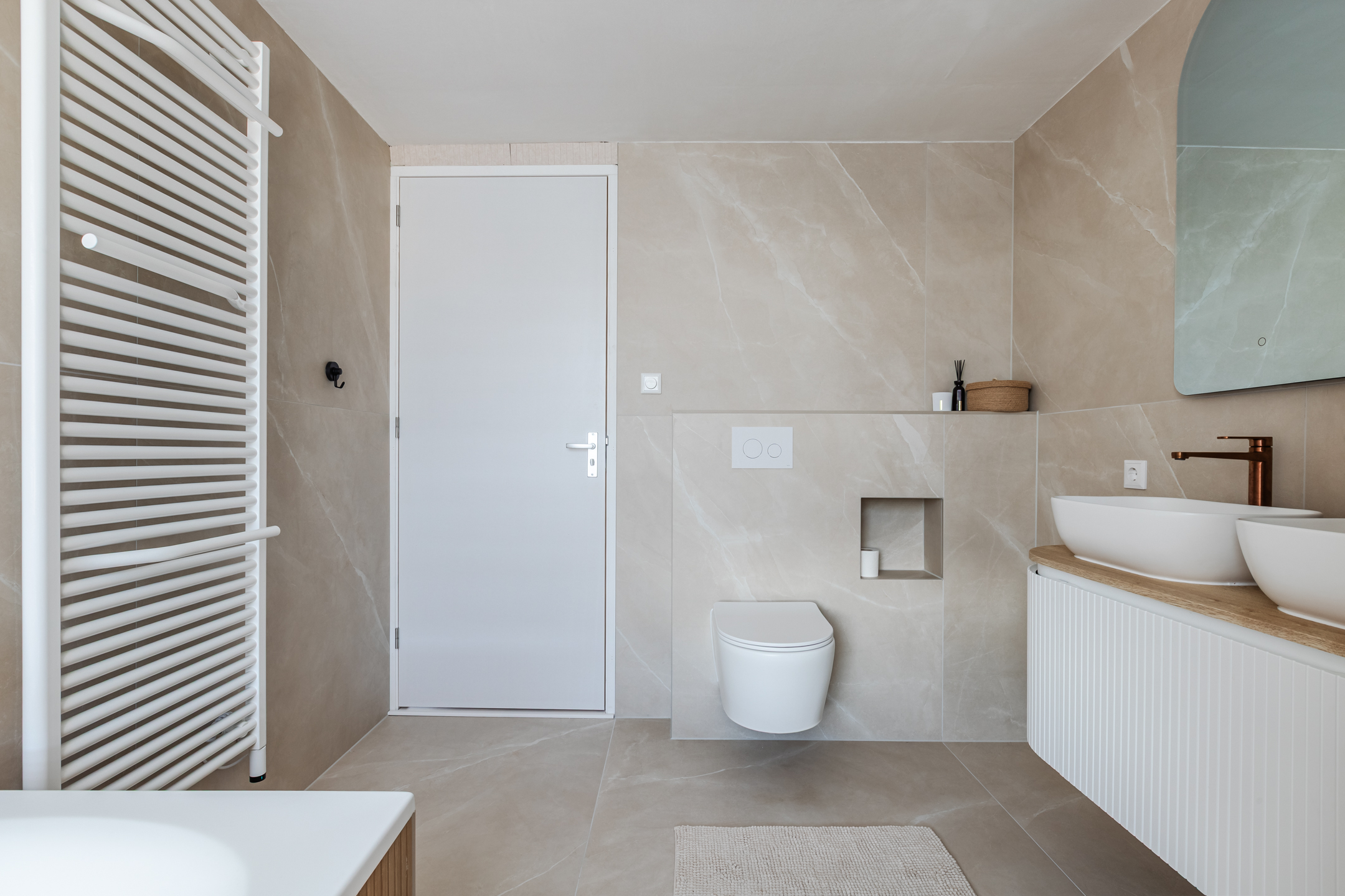 The landing provides access to 2 bedrooms, the laundry room, and the luxurious bathroom. Both bedrooms are a good size and neatly finished with a laminate floor. The new bathroom was completed just two weeks ago and features recessed spotlights, a second toilet, double washbasin with vanity unit, bathtub, and a separate walk-in rain shower.