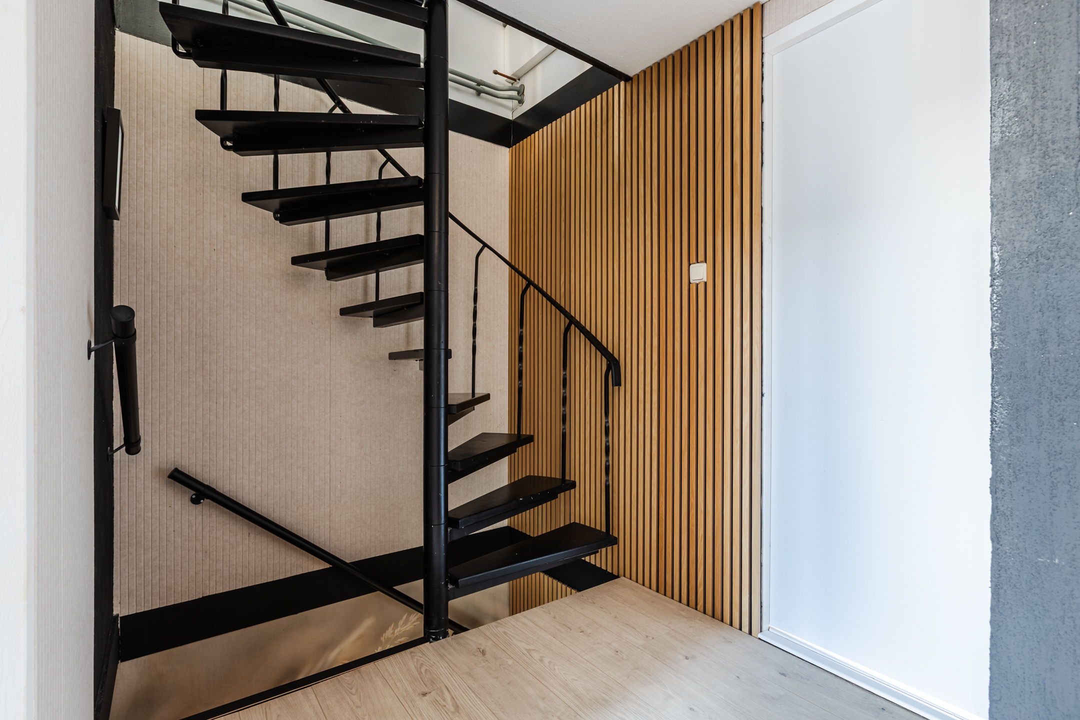 The finish is very neat, with a tiled floor and underfloor heating. The staircase to the first floor is concealed behind an access door with a small hall.