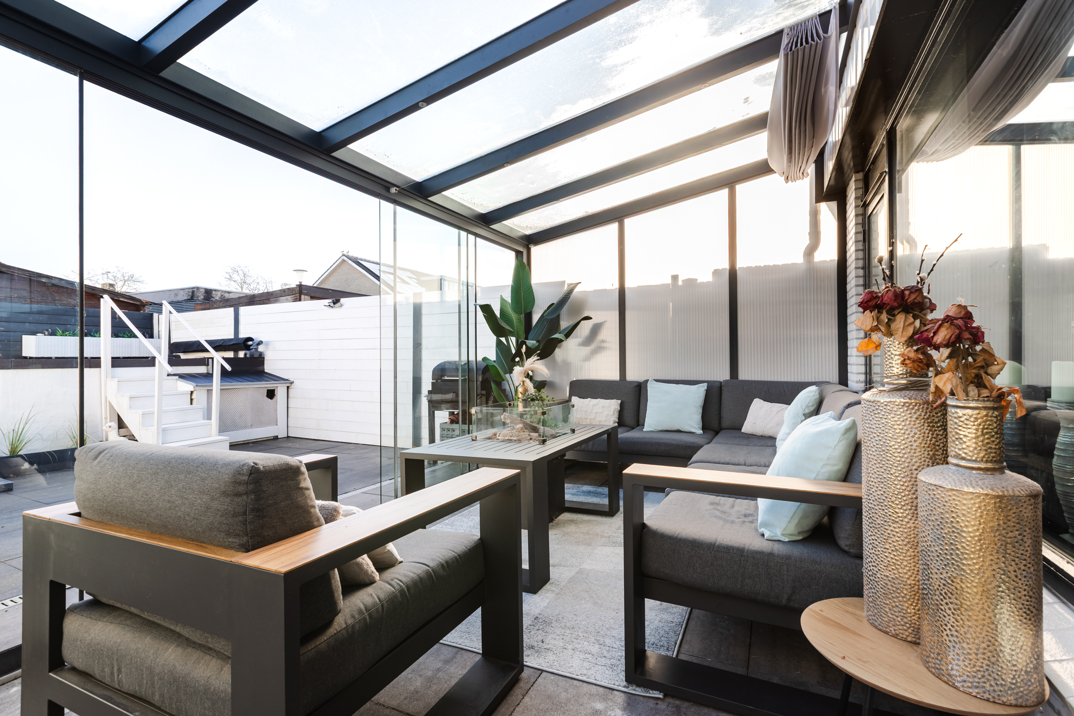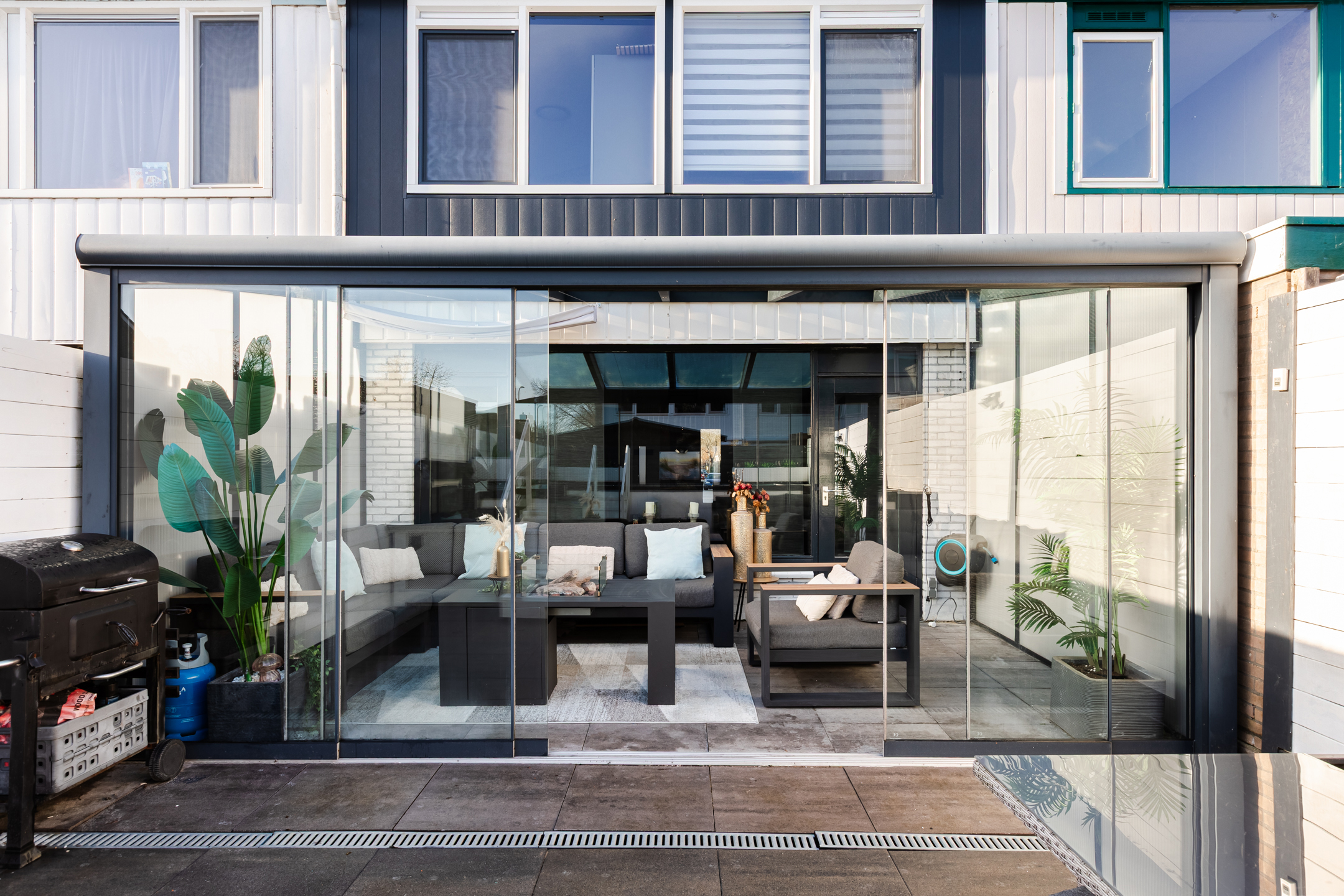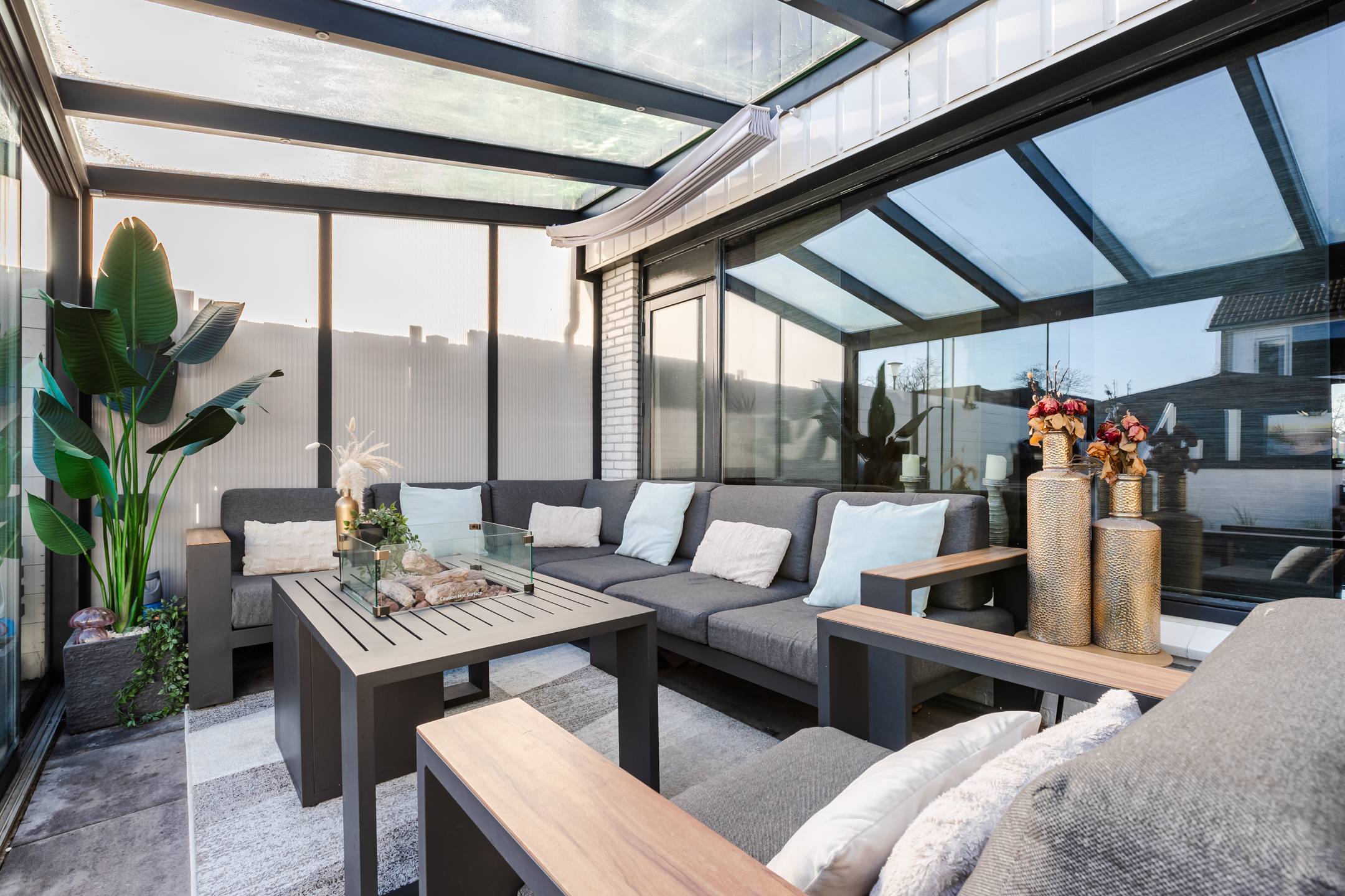 De woonkamer is tuingericht en de grote raampartijen voorzien de ruimte van lekker veel lichtinval. Een achterdeur in de glazen pui biedt toegang tot de glazen serre die een fijn verlengstuk vormt op de leefruimte.