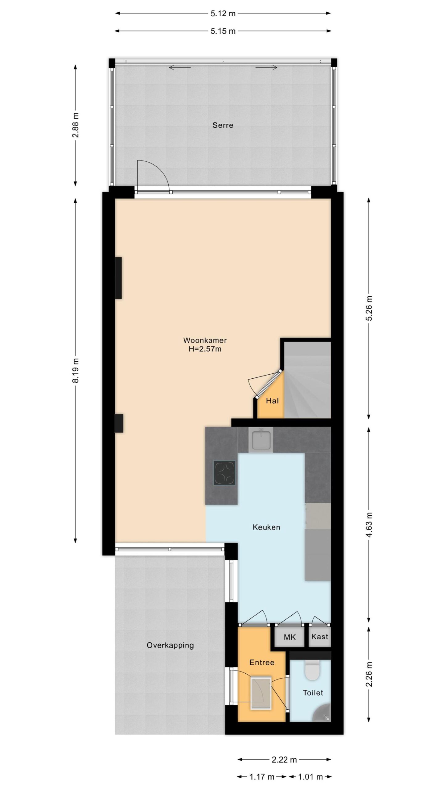 Er is sprake van een nette afwerking met een tegelvloer met vloerverwarming. De trapopgang naar de eerste verdieping is weggewerkt achter een toegansdeur met kleine hal.