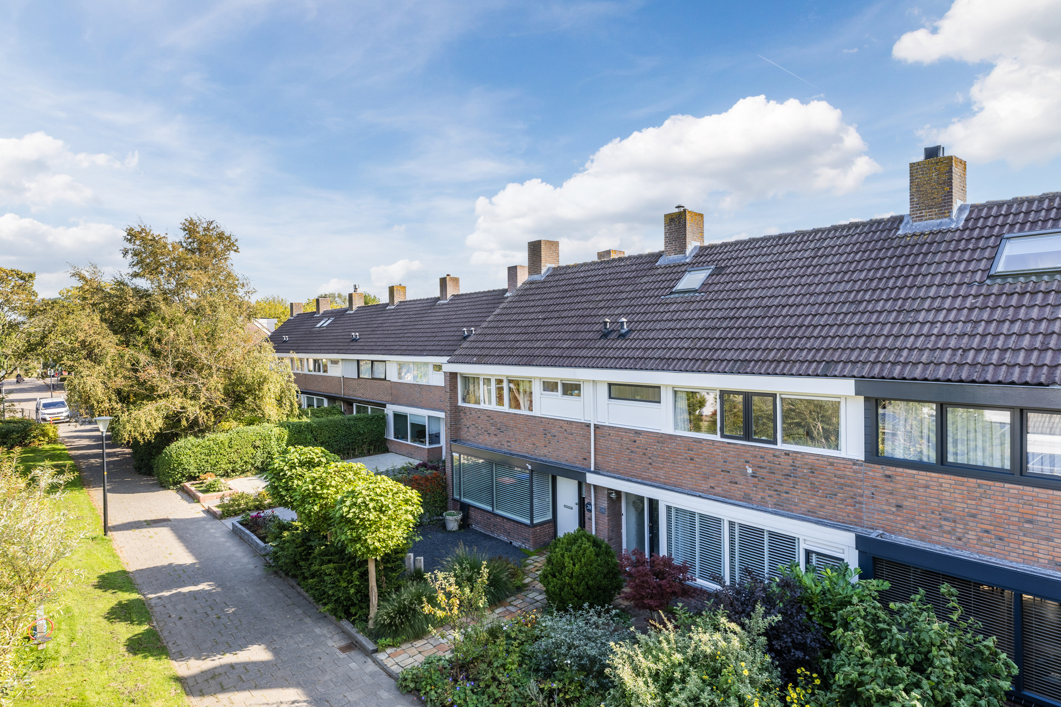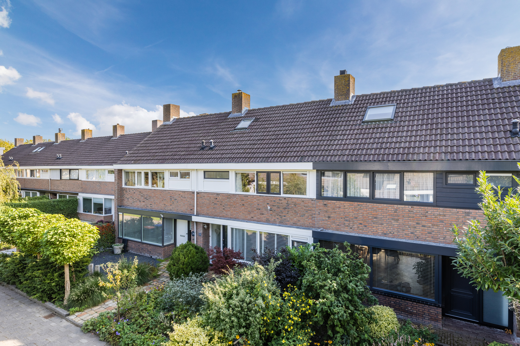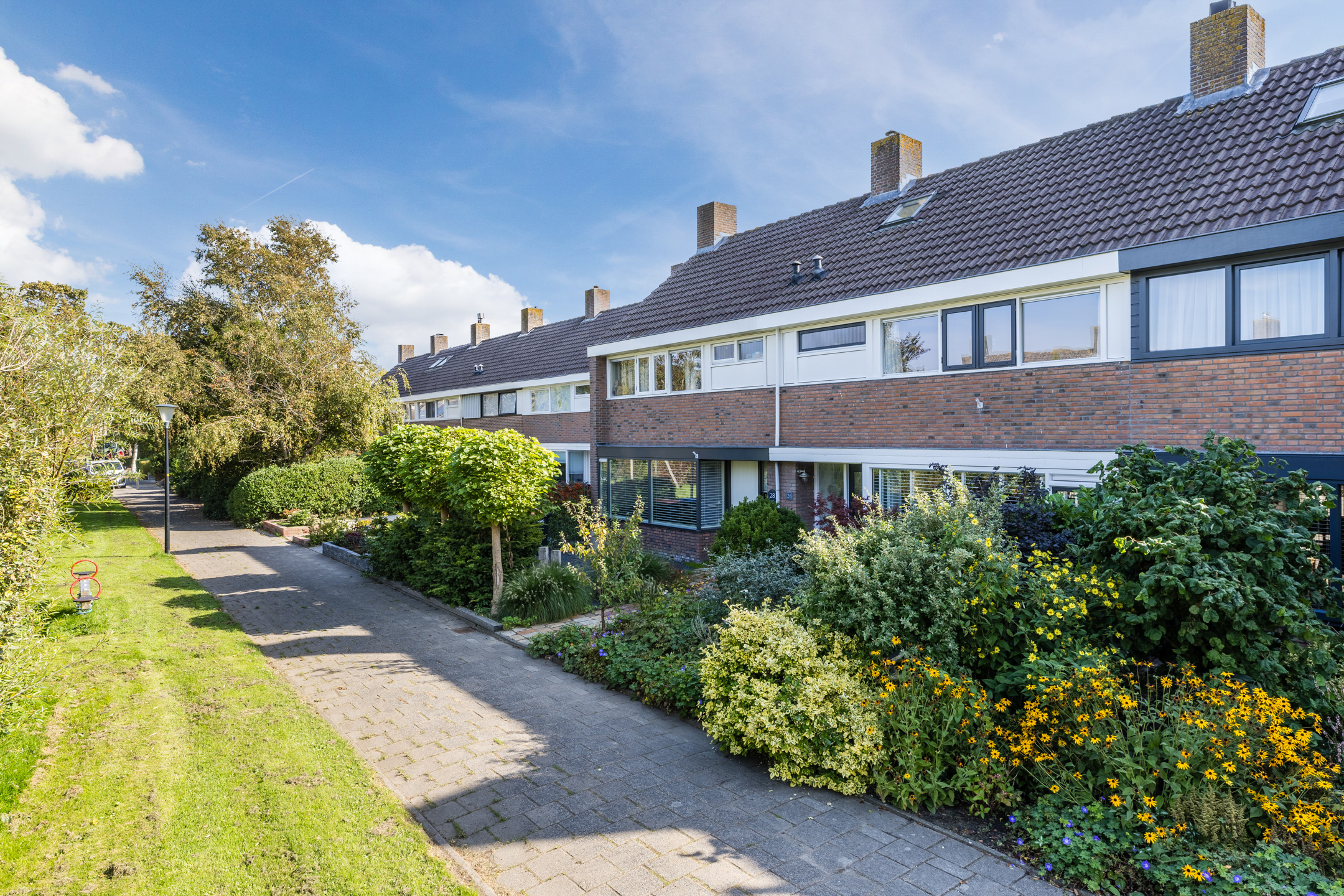 Via de ruime voortuin met betegeld paadje bereiken we de voordeur van de woning.