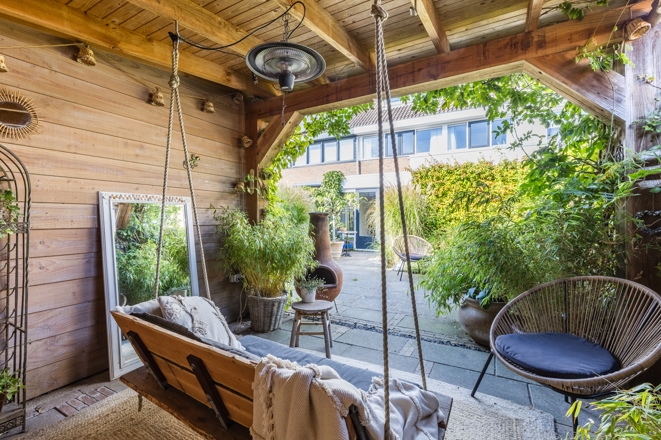 De tuin beschikt over een betegeld terras dat wordt omlijst door groene borders. Achterin de tuin is een gezellig verandaterras onder een houten overkapping gerealiseerd en daaraan geschakeld een handige berging van Douglas hout welke voorzien is van elektriciteit.