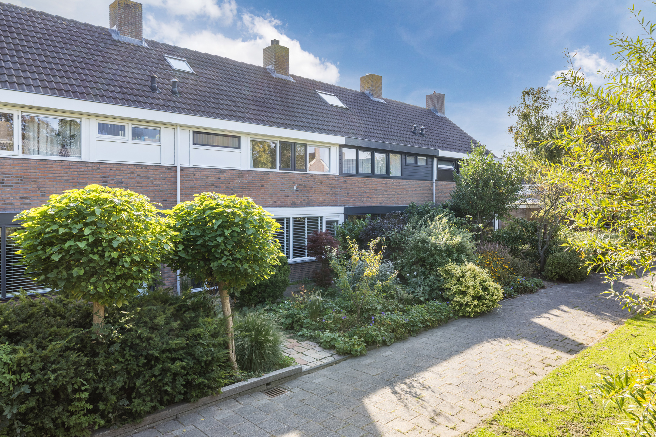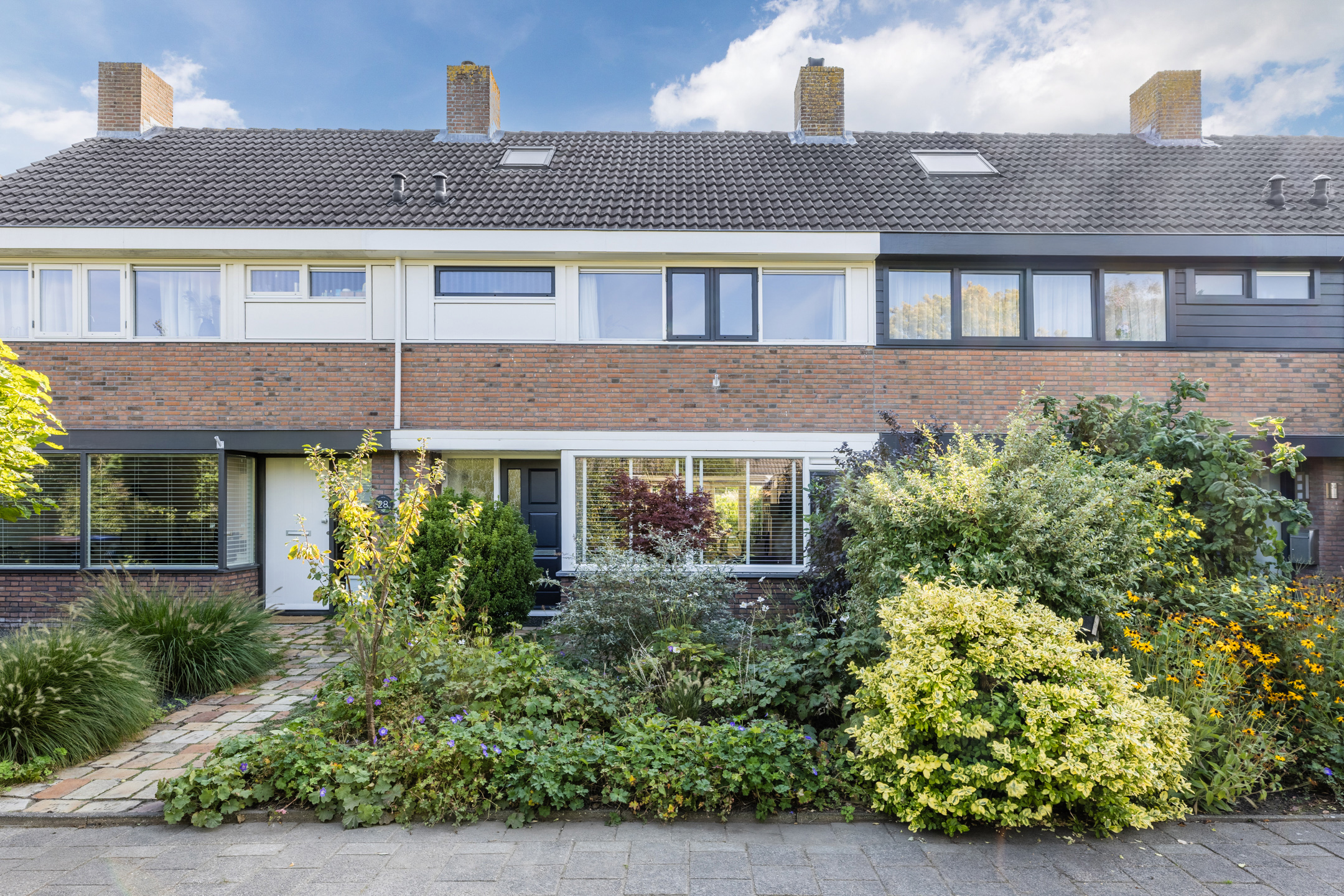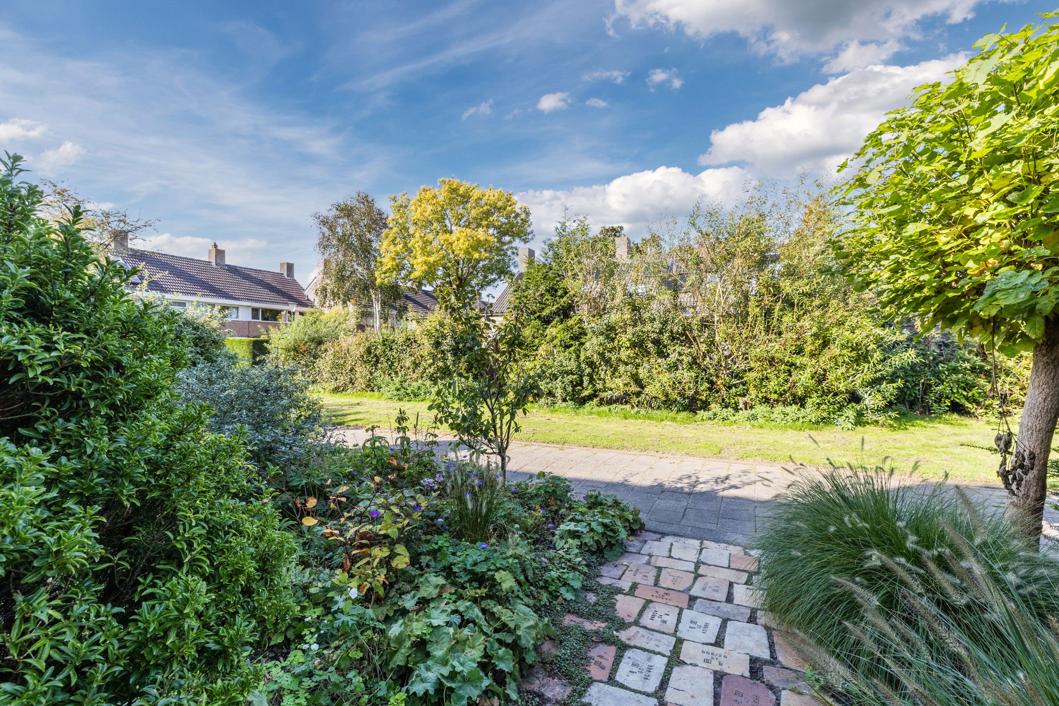 Via de ruime voortuin met betegeld paadje bereiken we de voordeur van de woning.