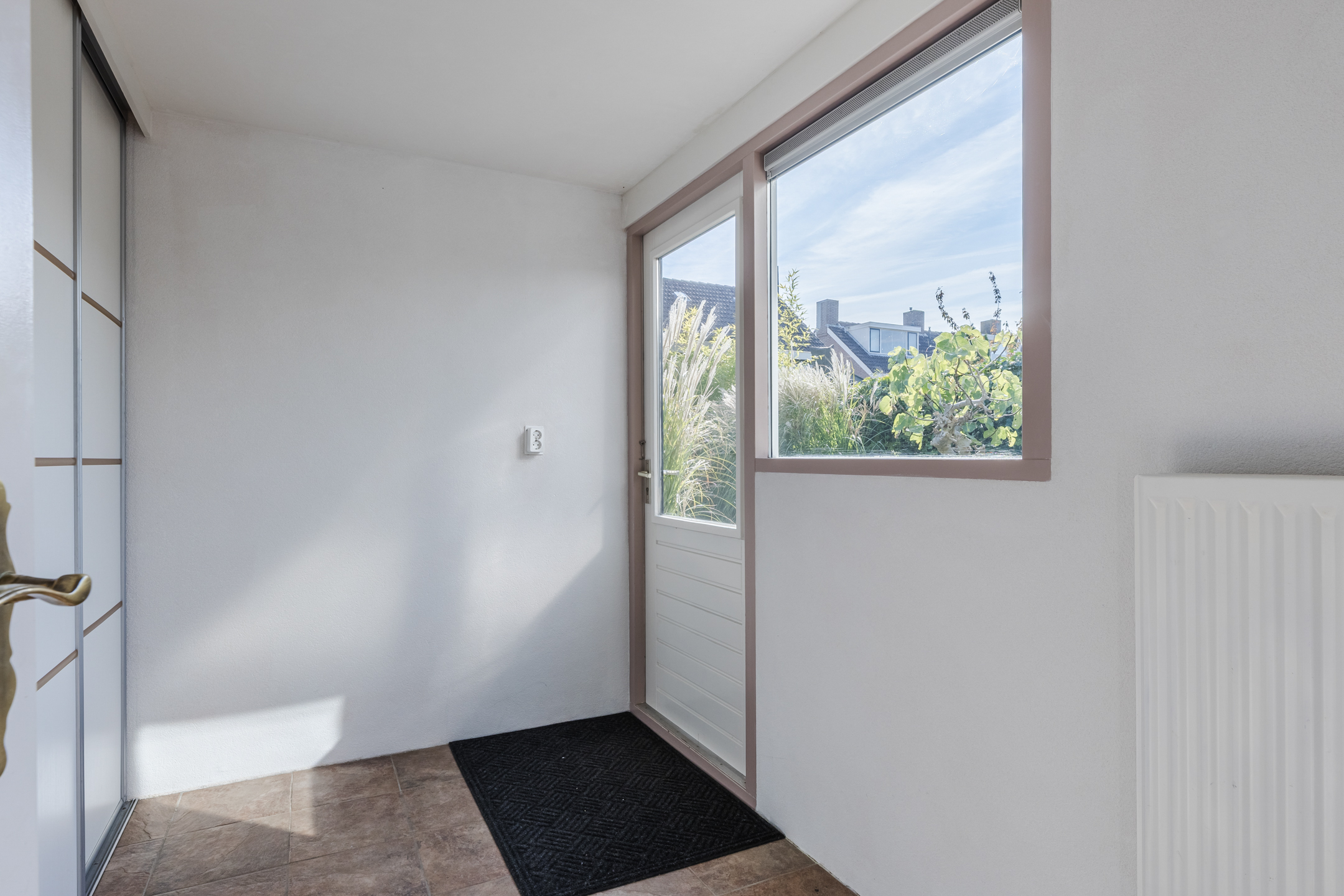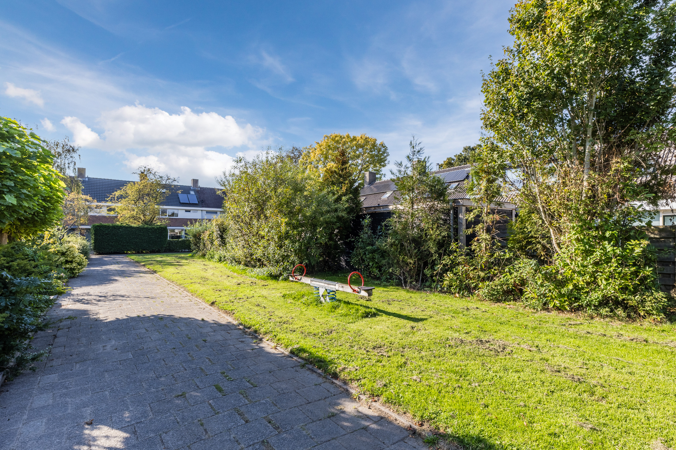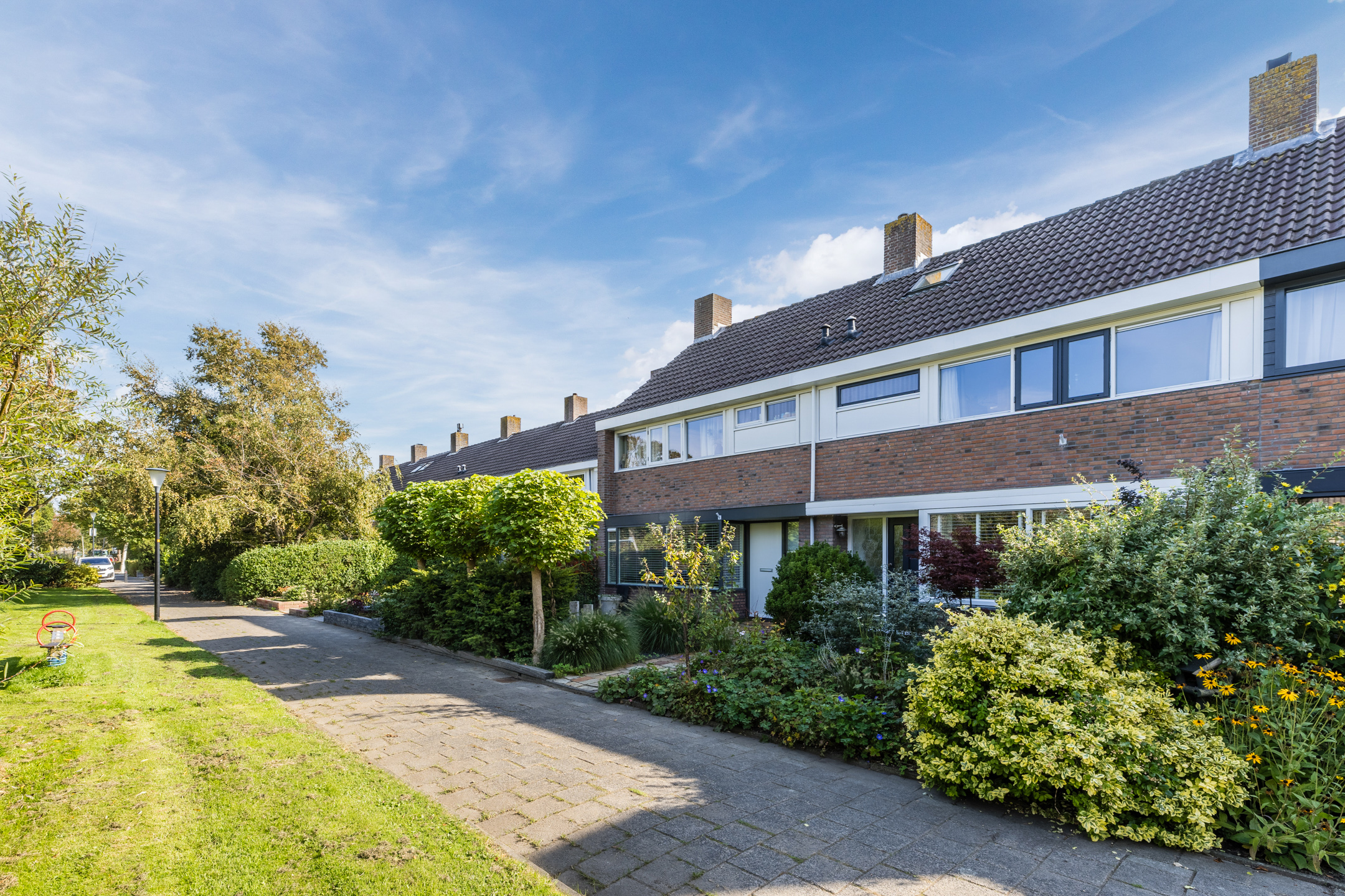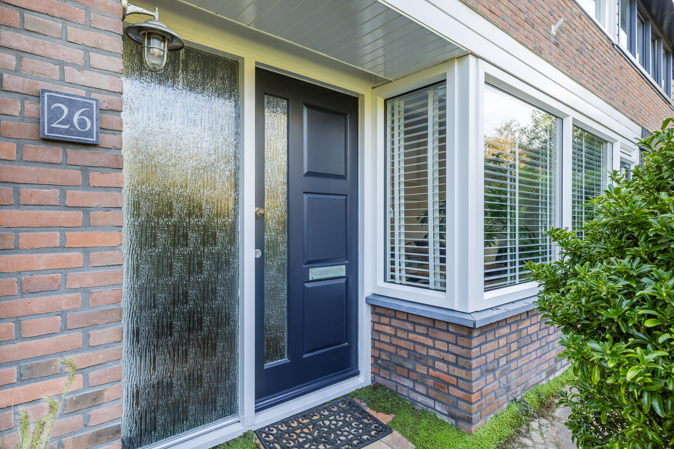 Via de ruime voortuin met betegeld paadje bereiken we de voordeur van de woning.