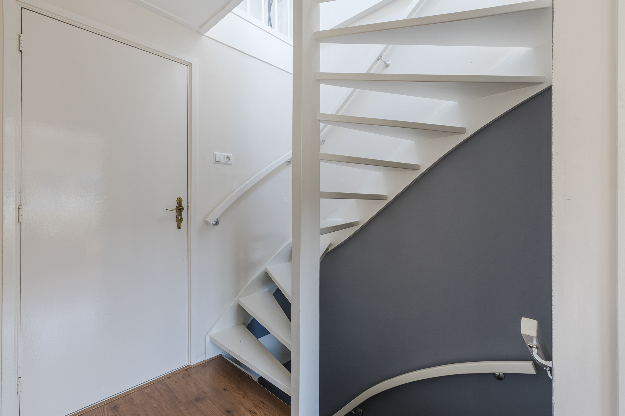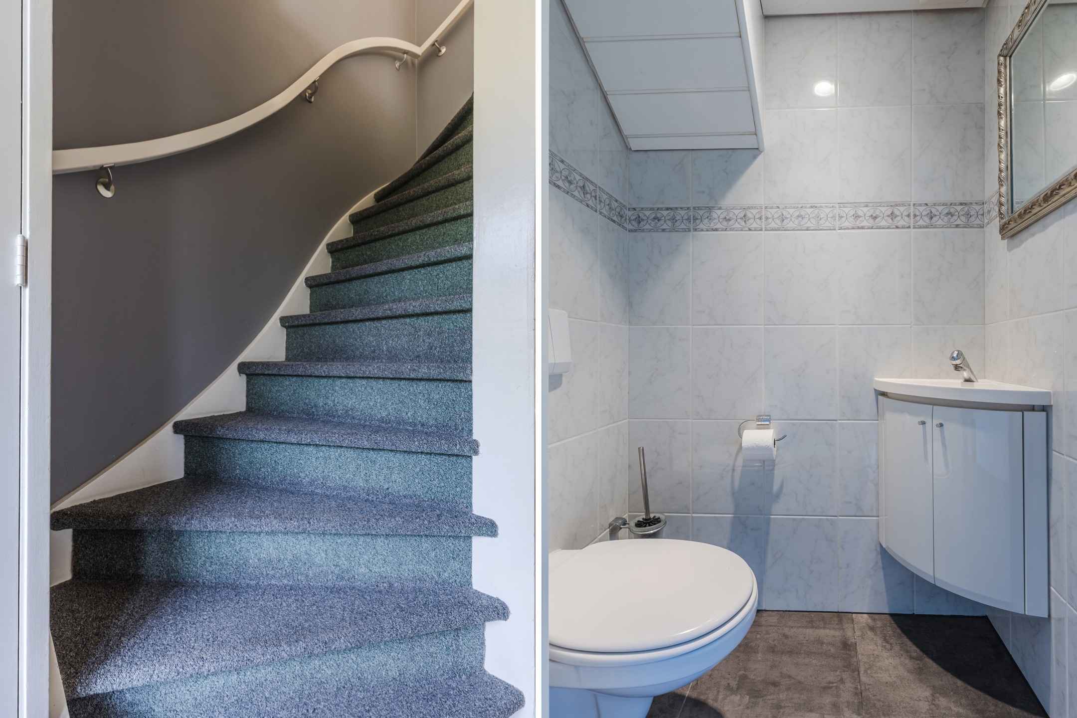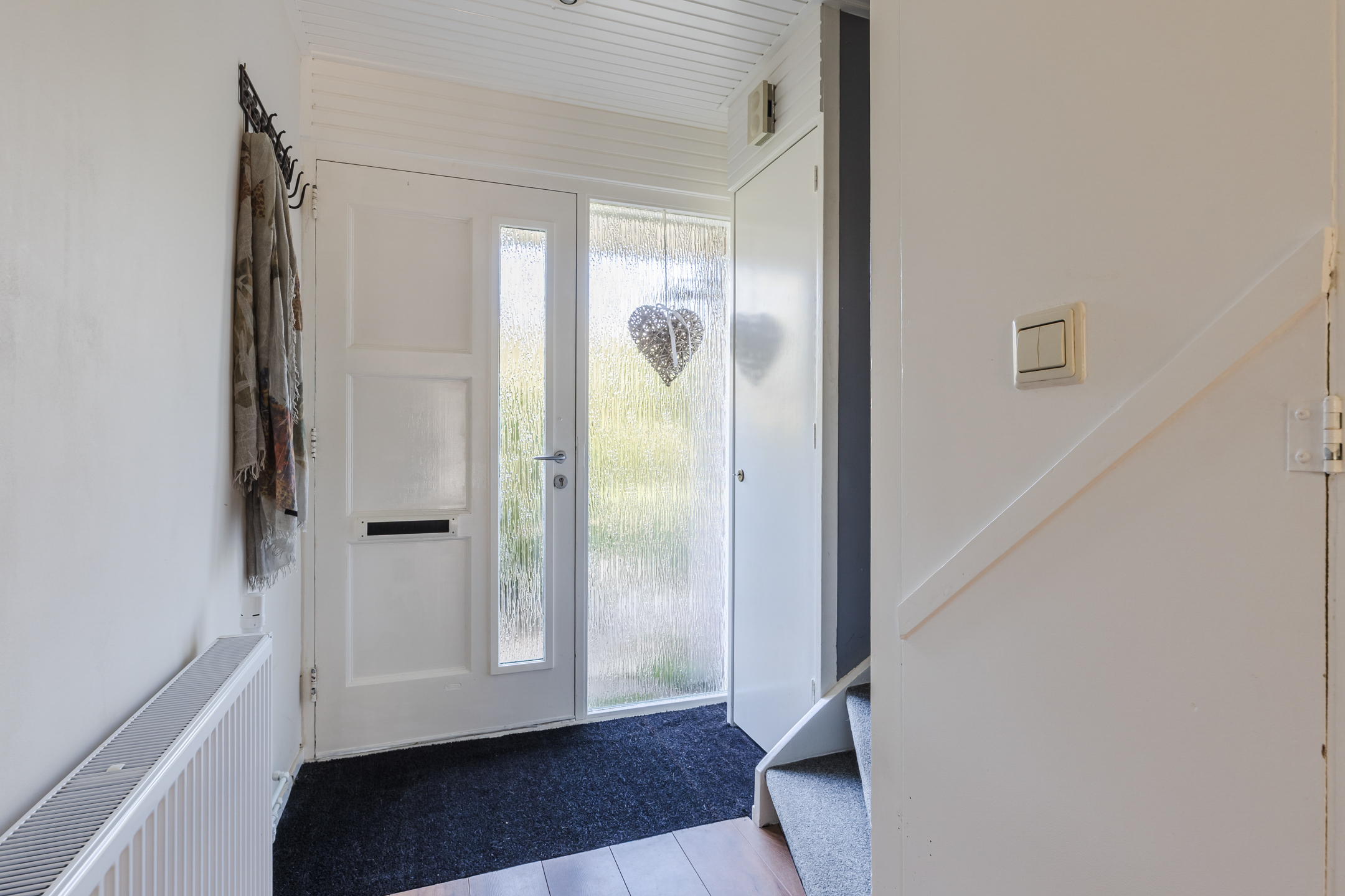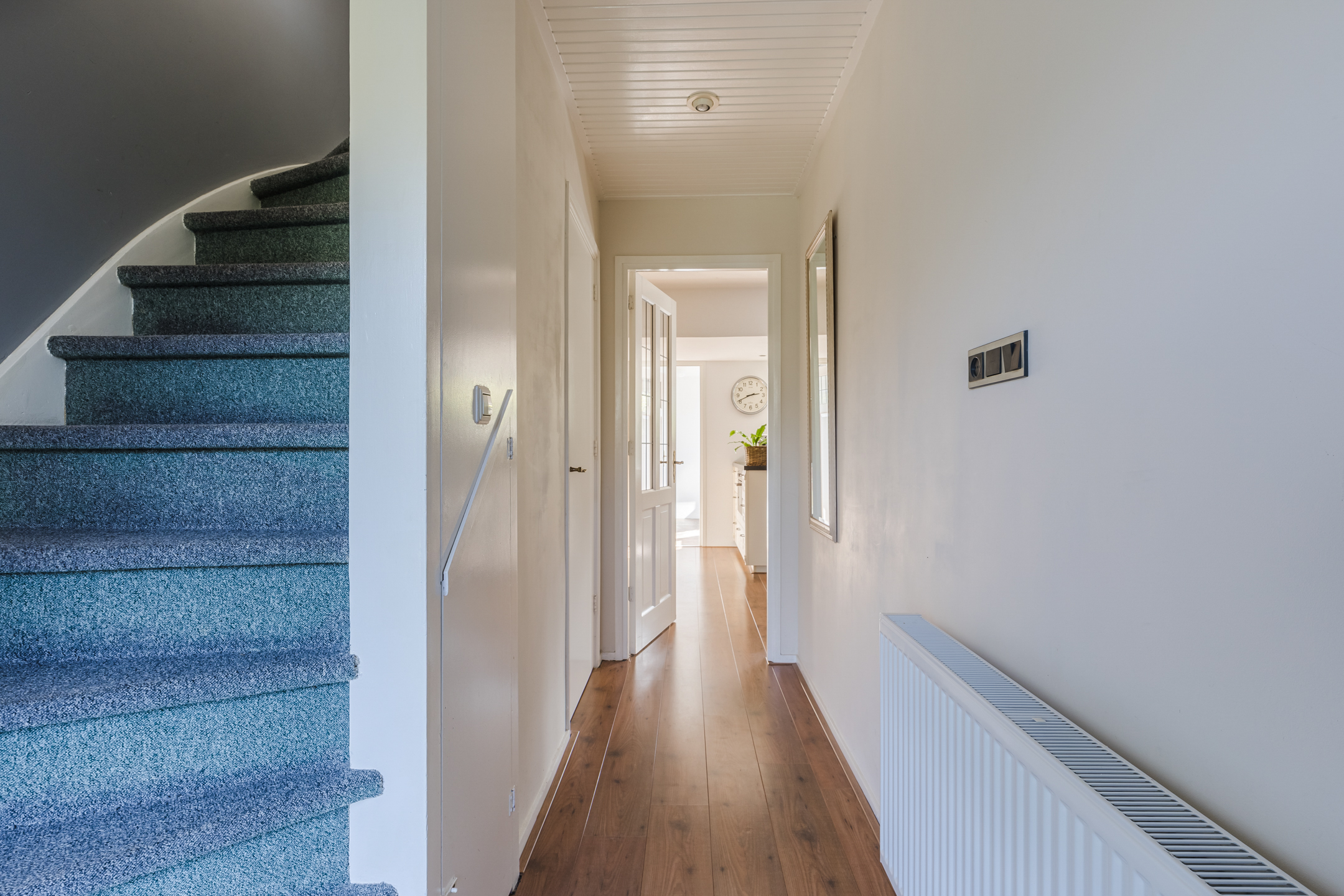 Achter de voordeur vinden we de entree met garderobe, meterkast, gastentoilet met fonteintje, trapopgang naar de eerste verdieping en toegang tot de woonkamer met open keuken.