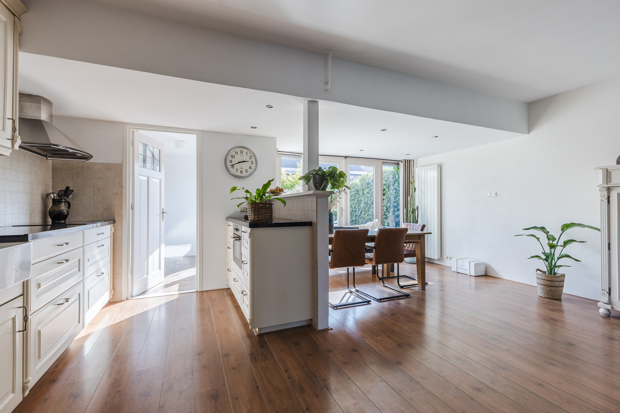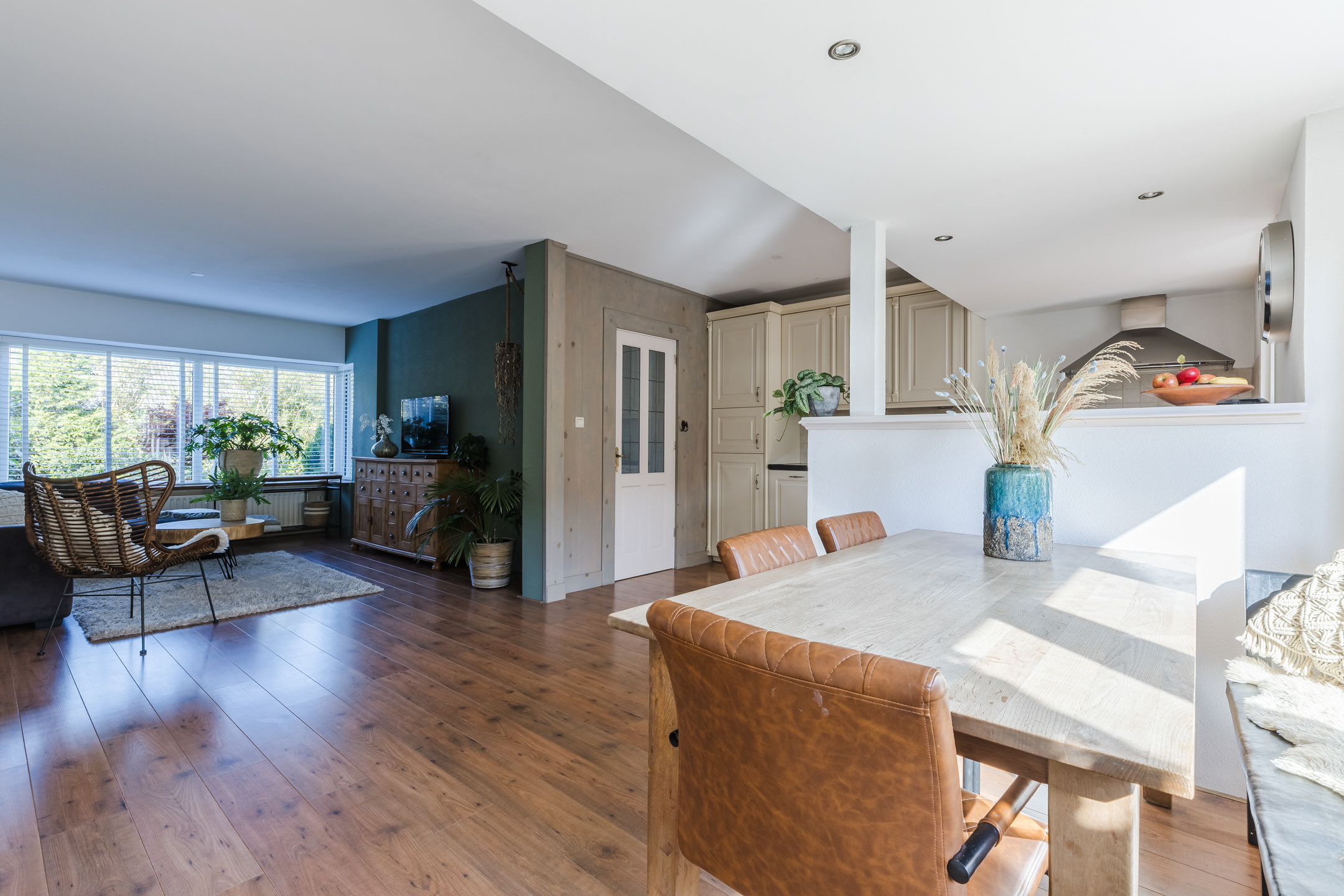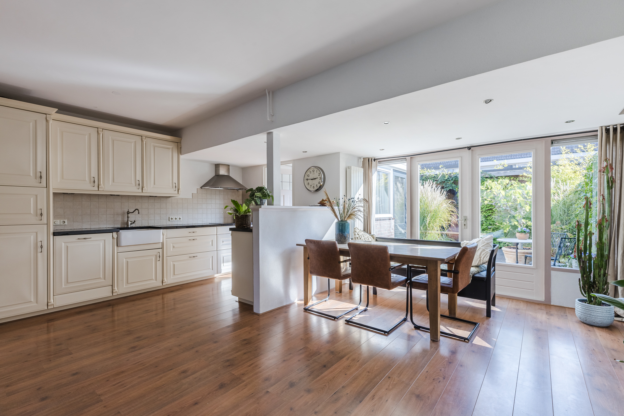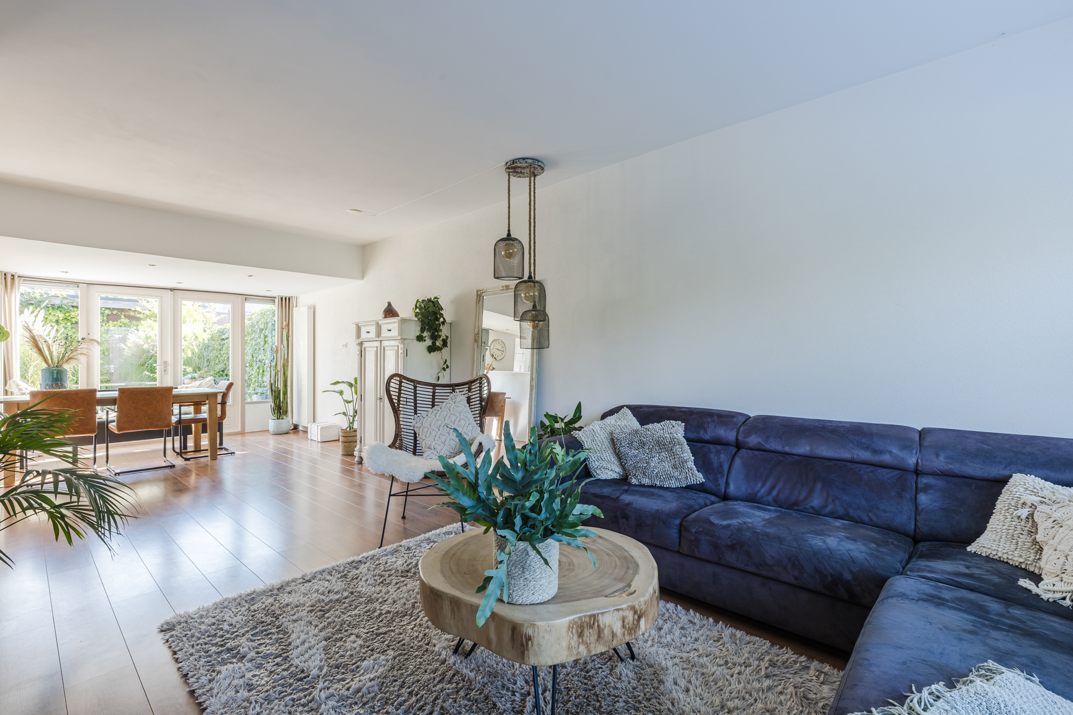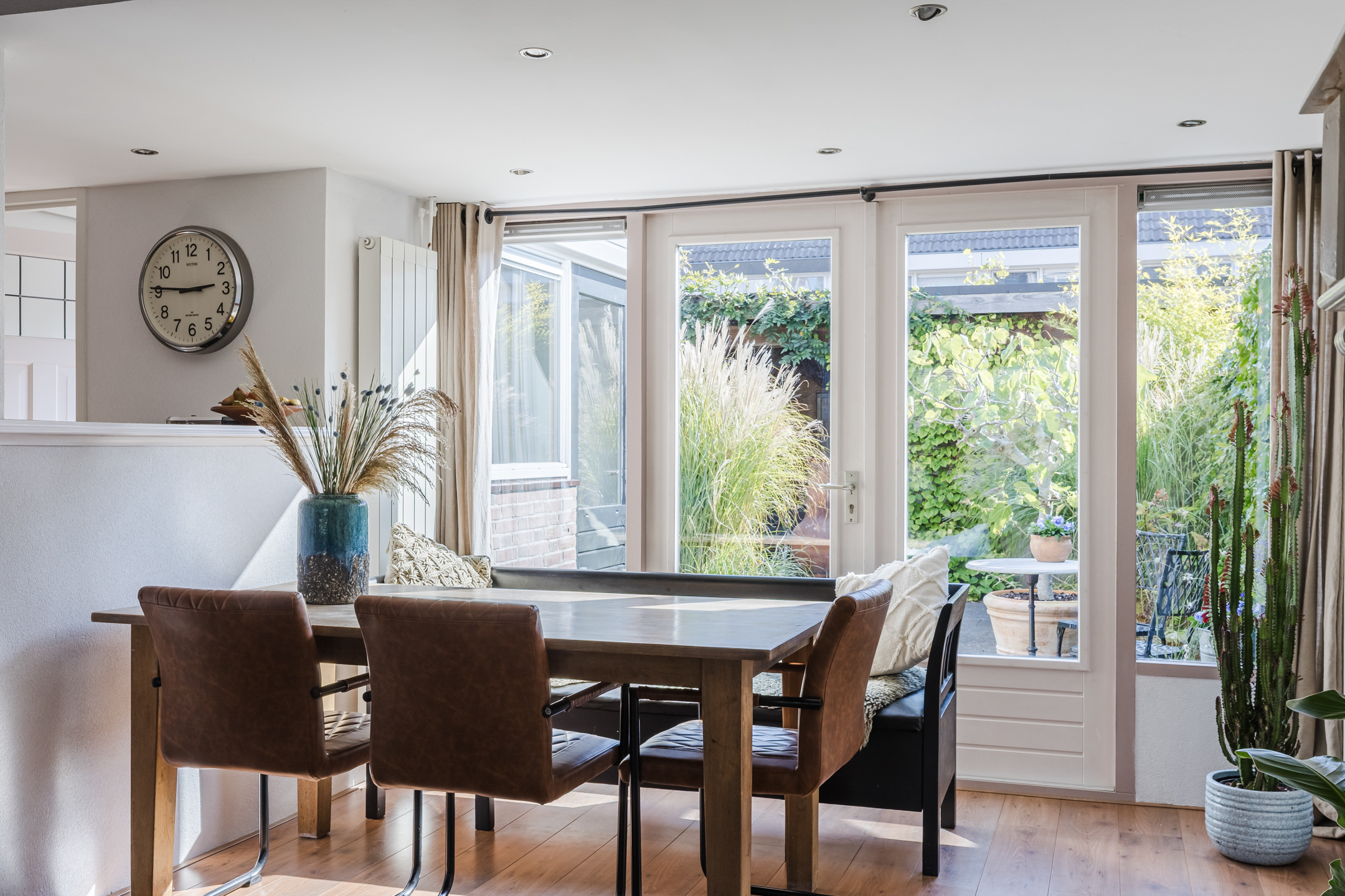 De woning beschikt over een uitgebouwde woonkamer met grote raampartijen die zorgen voor veel lichtinval. Via de openslaande deuren is er directe toegang tot de tuin, waardoor binnen- en buitenruimte praktisch met elkaar zijn verbonden.