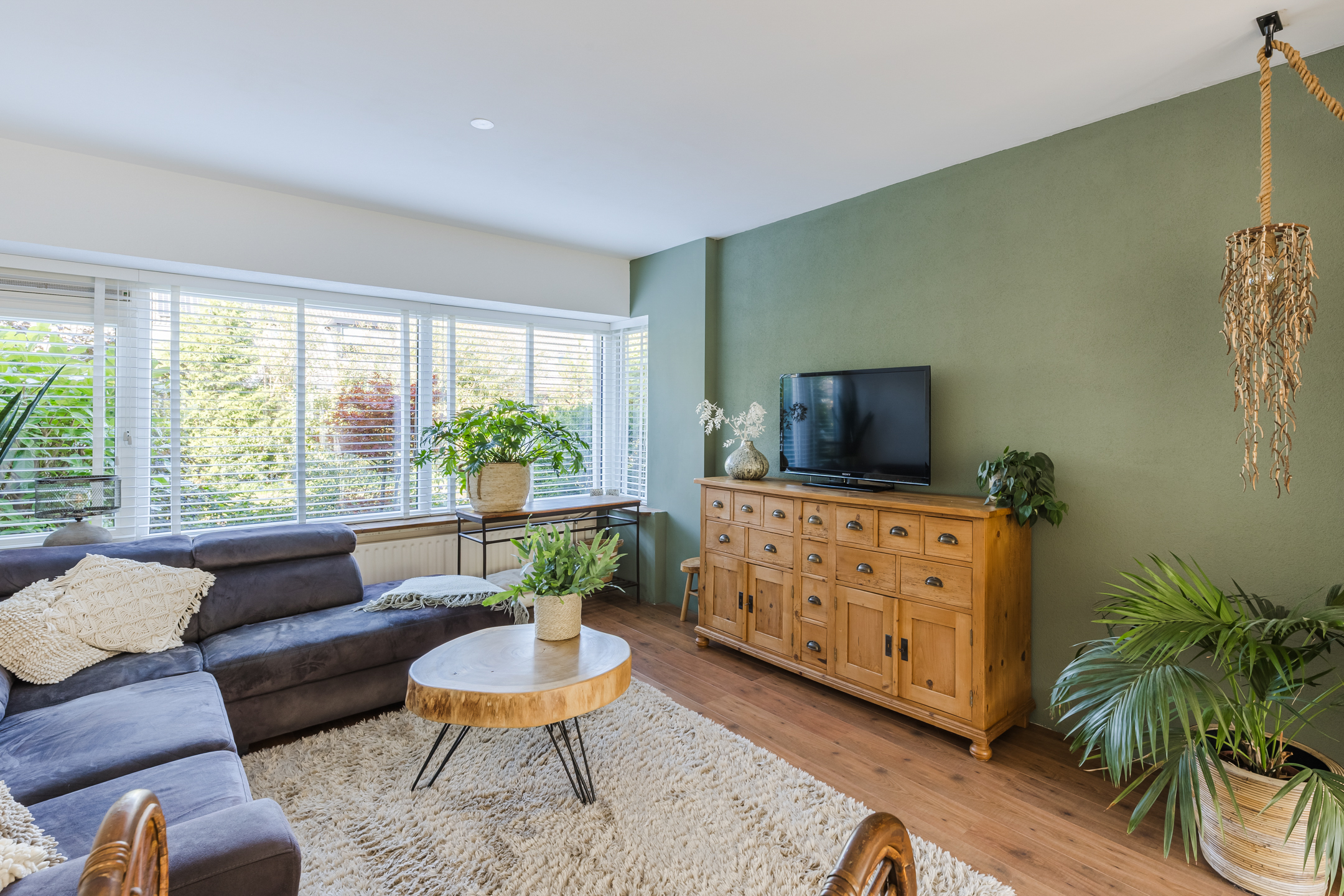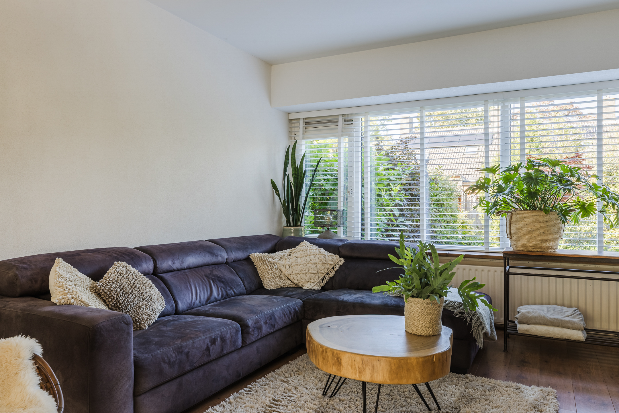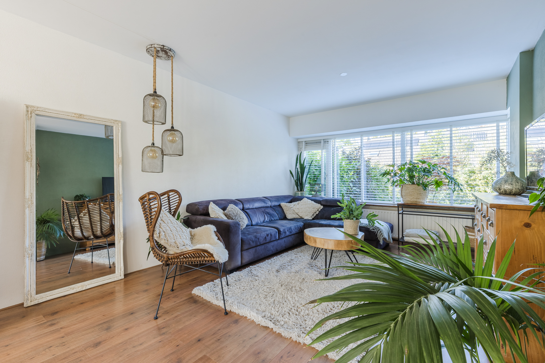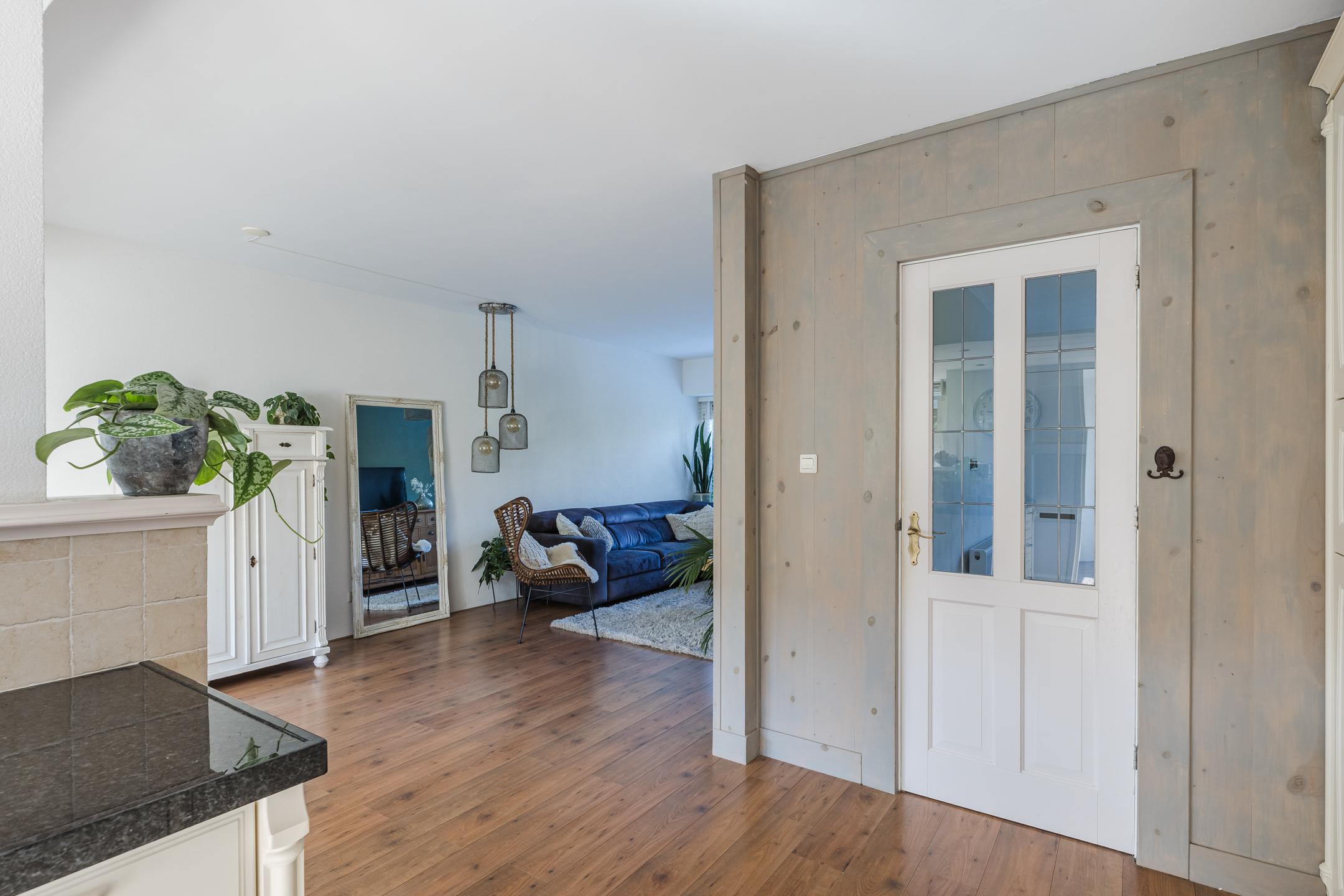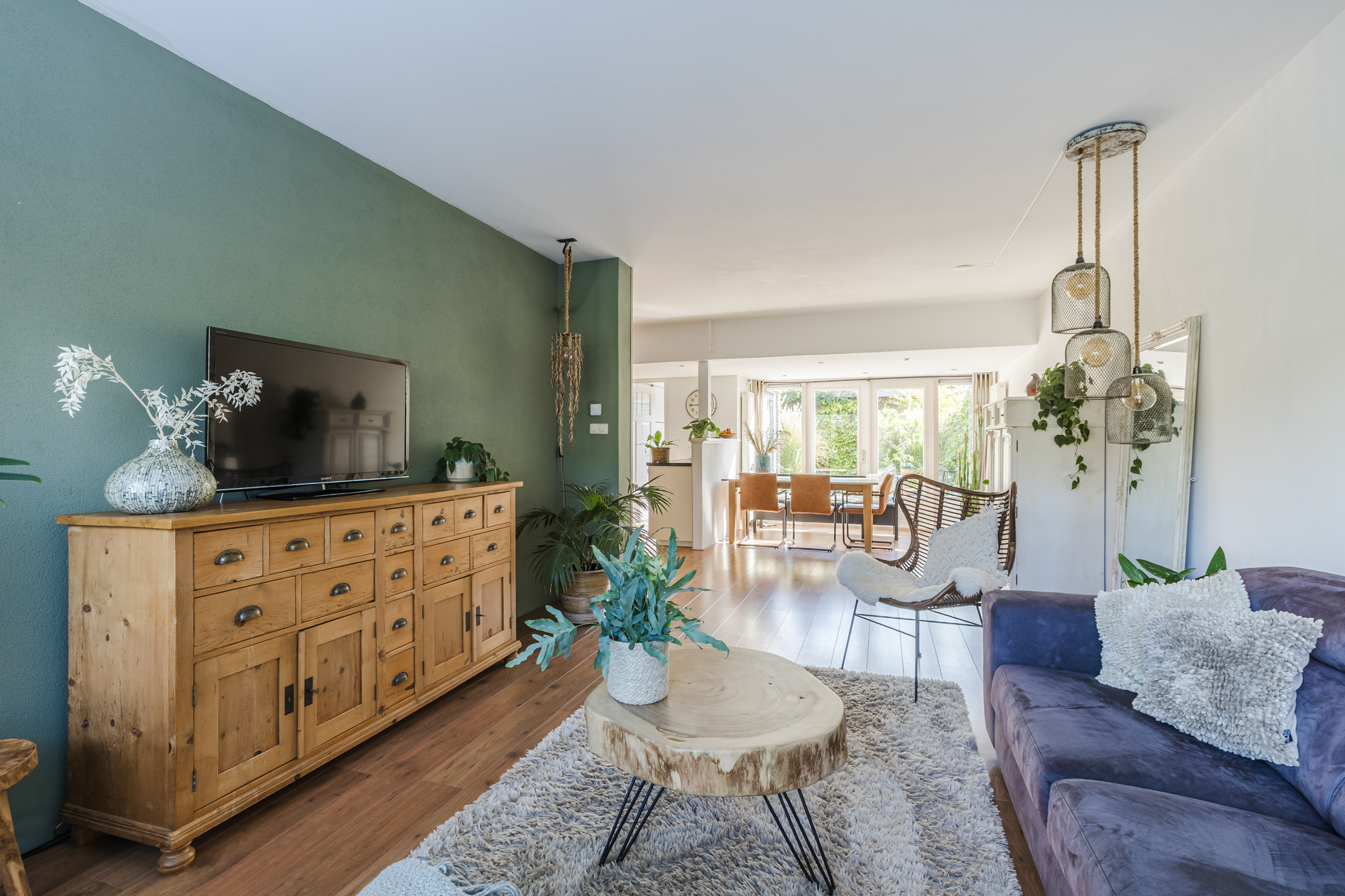 De woning beschikt over een uitgebouwde woonkamer met grote raampartijen die zorgen voor veel lichtinval. Via de openslaande deuren is er directe toegang tot de tuin, waardoor binnen- en buitenruimte praktisch met elkaar zijn verbonden.
