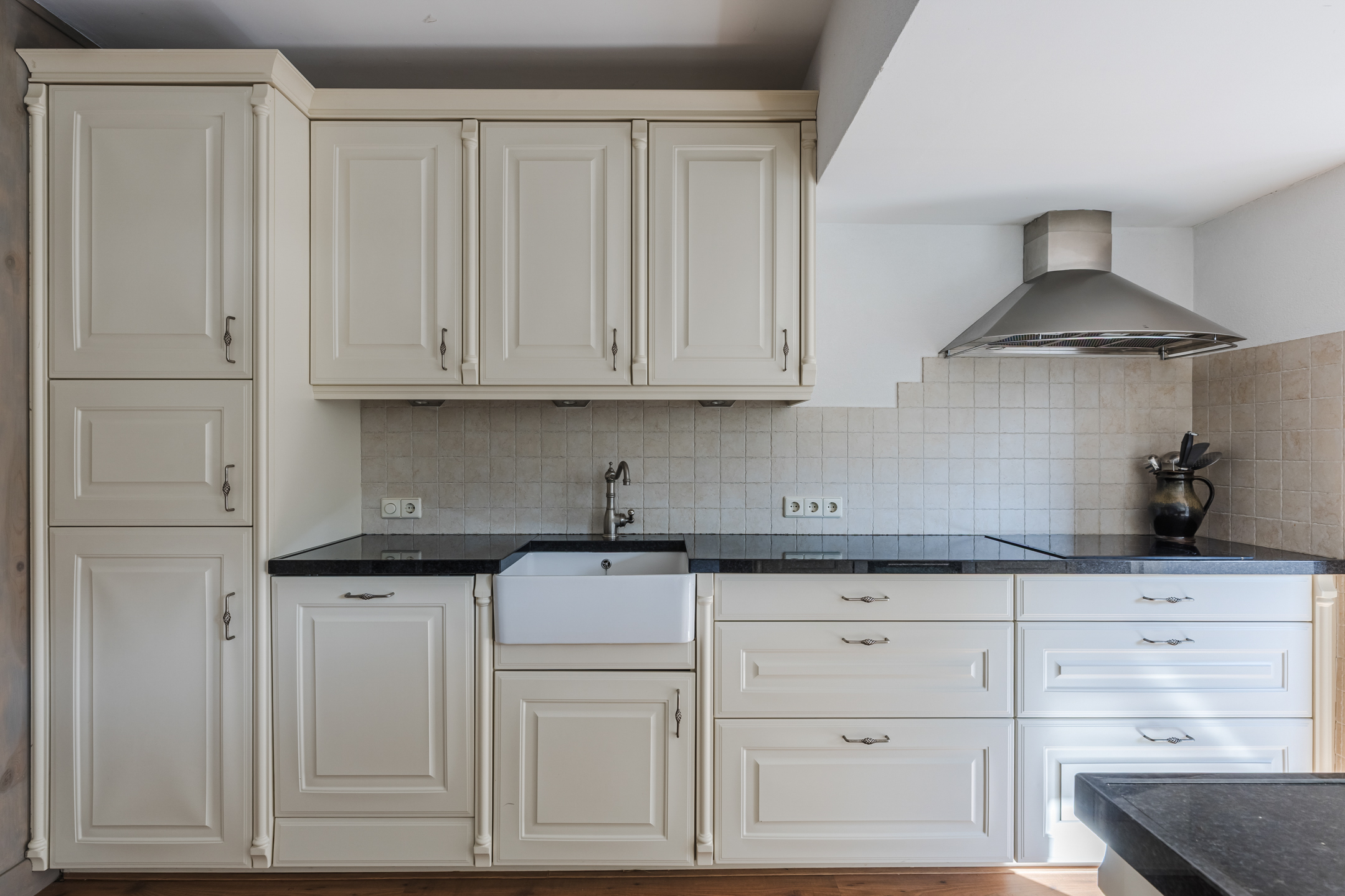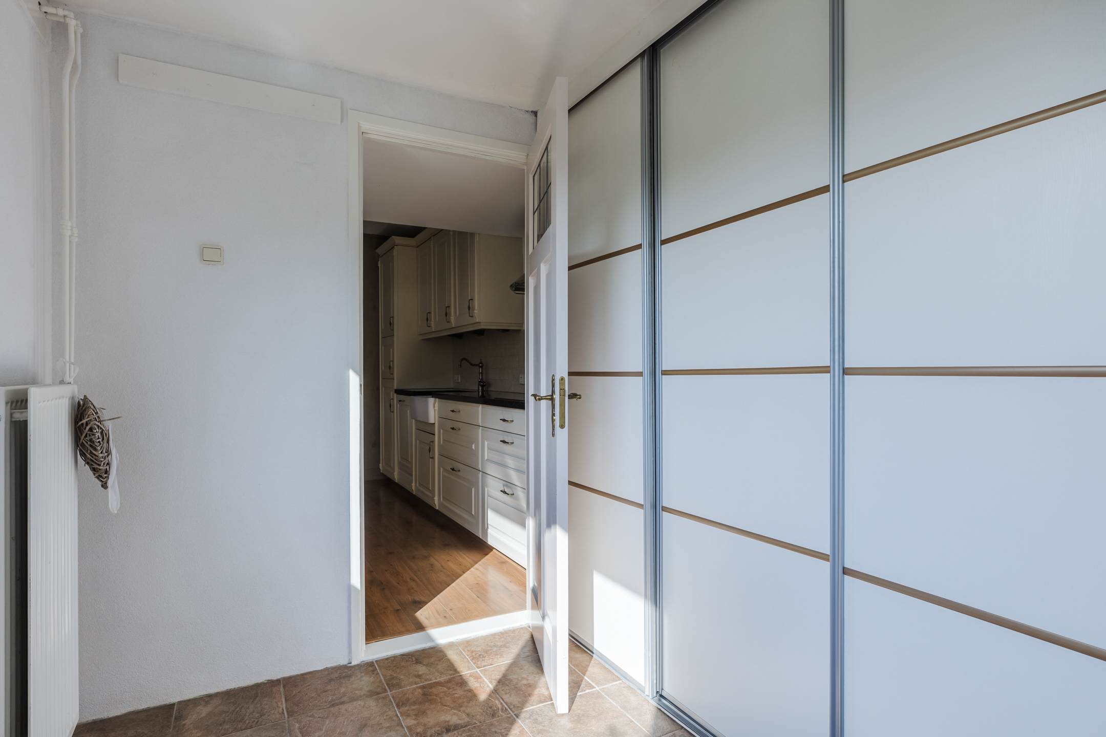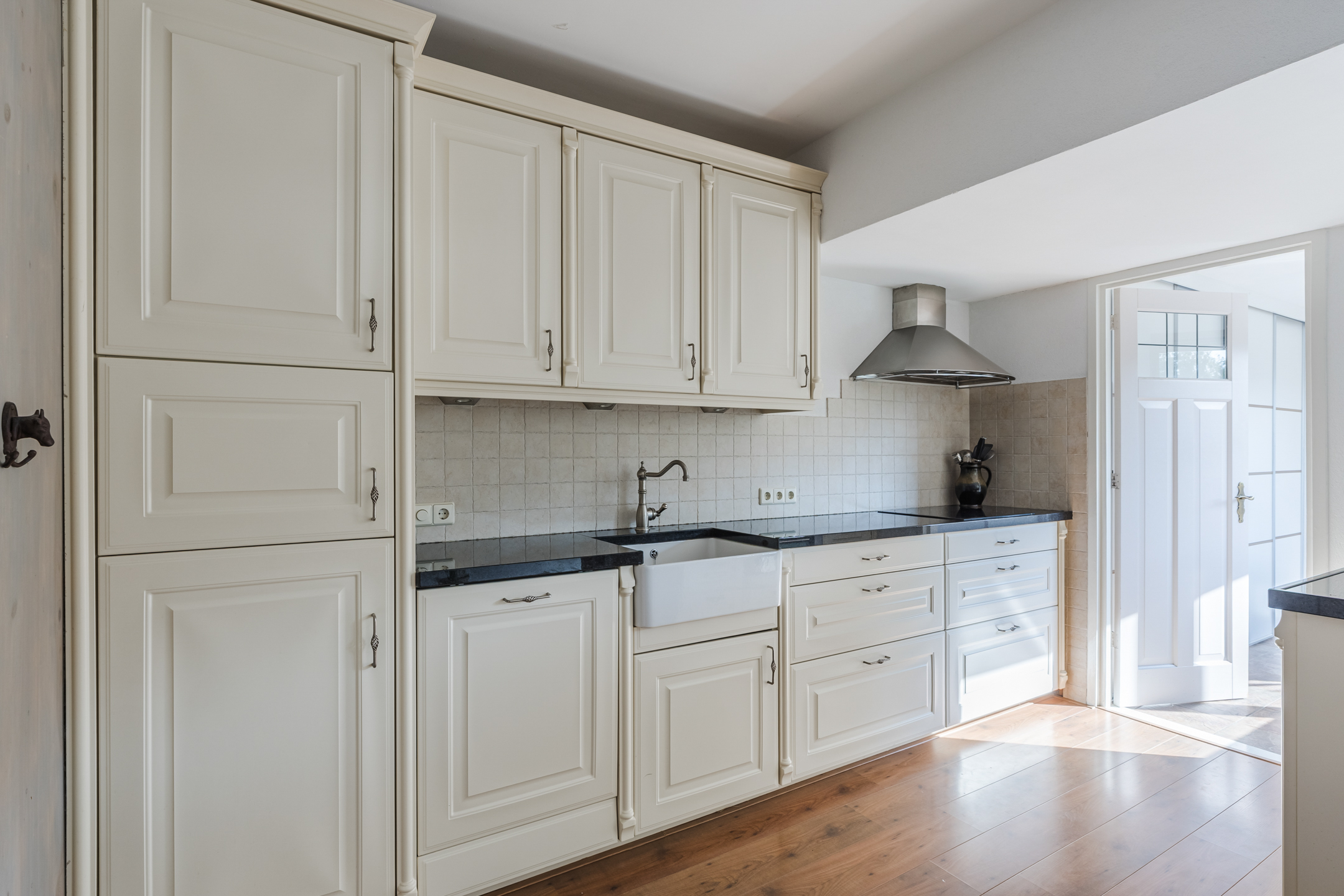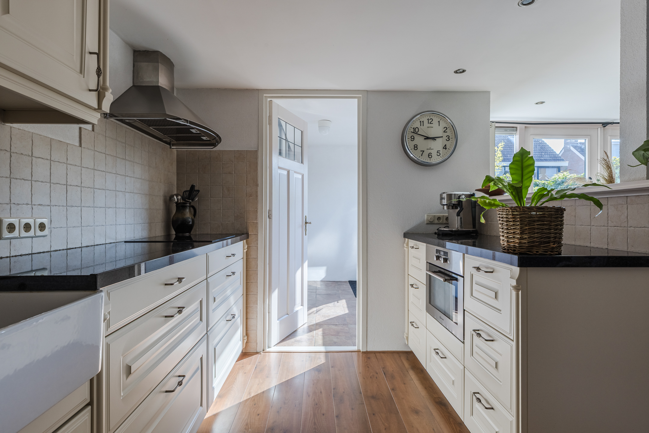 De keuken bevindt zich aan de tuinzijde van de woning en is voorzien van een inductiekookplaat, combimagneron, koelkast en een vaatwasser. Vanuit de keuken is er toegang tot een handige bijkeuken met aldaar de aansluitingen voor de witgoedopstelling en een achterdeur naar de tuin.