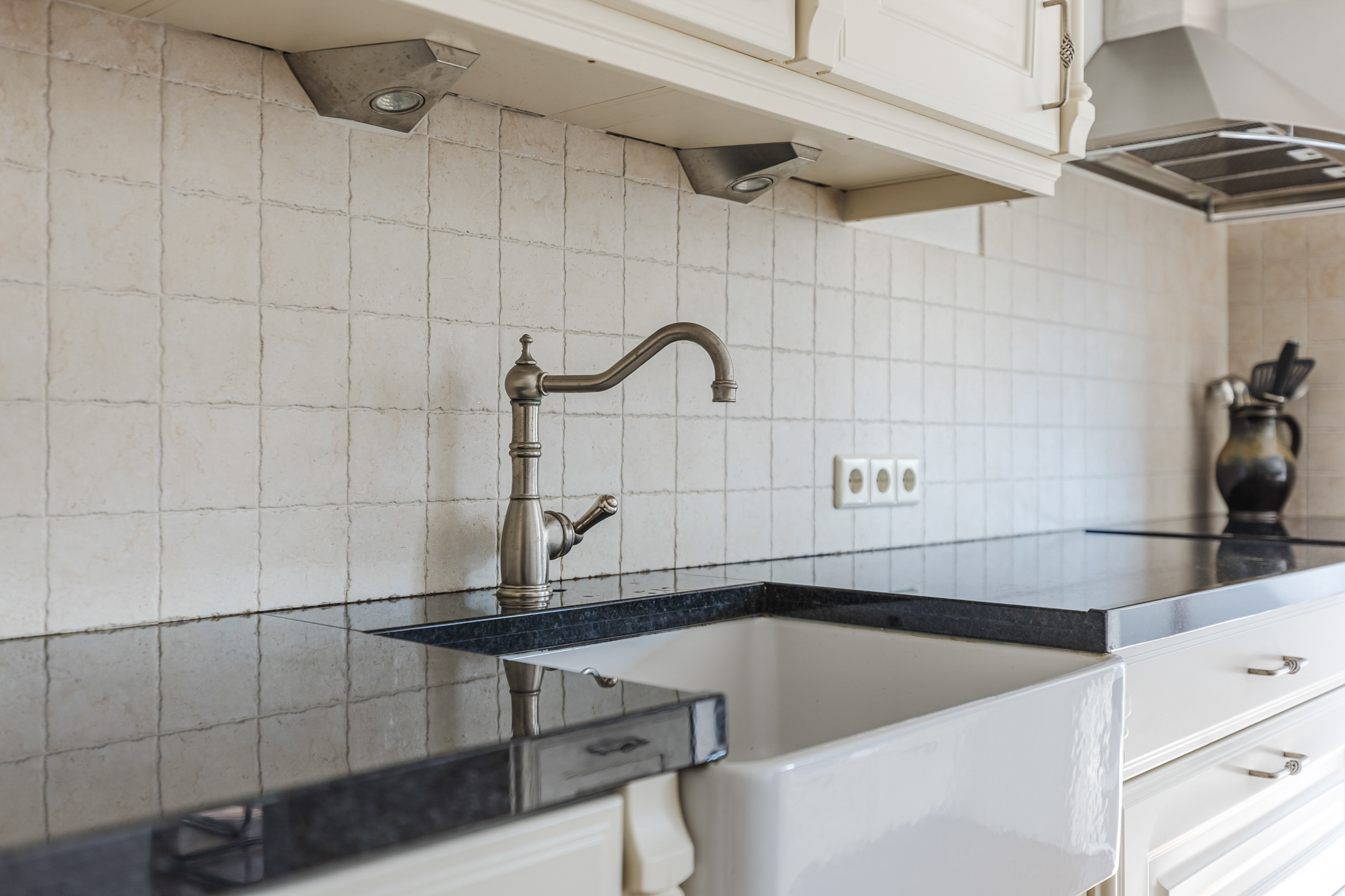 The kitchen is located on the garden side of the house and is equipped with an induction hob, combination microwave/oven, fridge and a dishwasher. From the kitchen there is access to a handy utility room with there the connections for the white goods set-up and a back door to the garden.