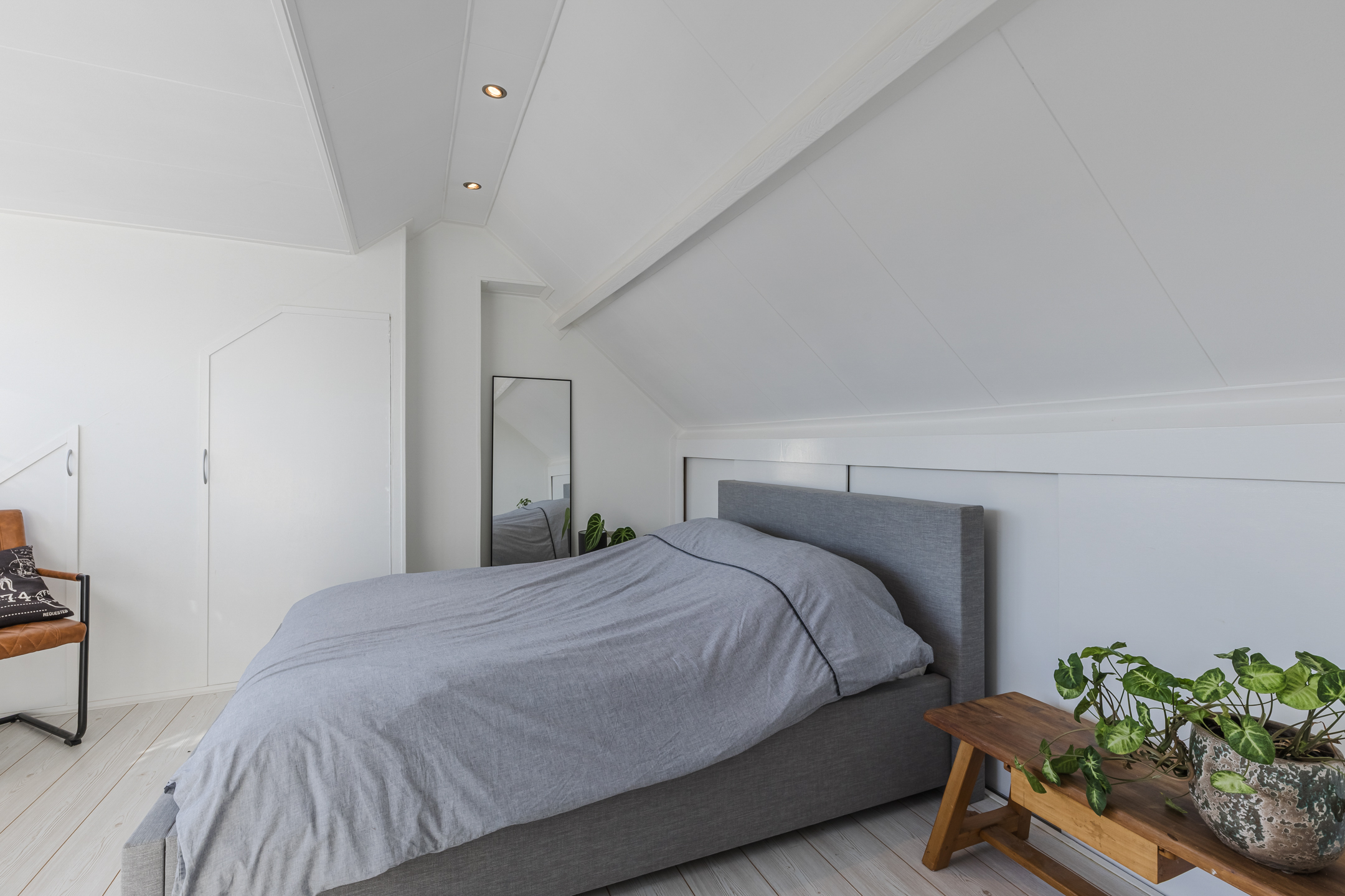 Via the fixed staircase on the first floor, we reach the landing of the spacious second floor, which provides access to the fully-fledged 4th bedroom. Thanks to the addition of a dormer window, this room is also wonderfully spacious and light. In addition, there is plenty of storage space behind knee walls under the sloping roof.