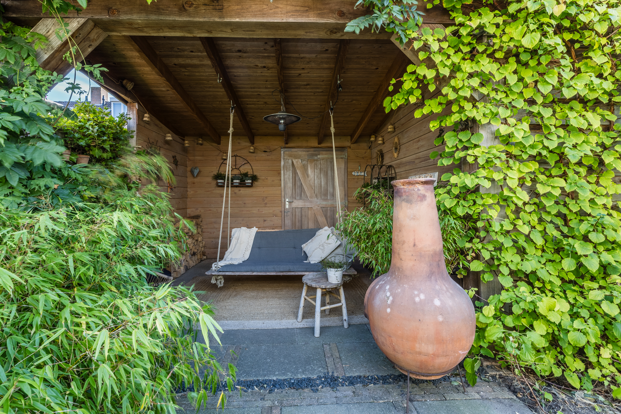 The garden features a tiled terraces interspersed with green borders. At the very back of the garden, a cosy veranda terrace under a wooden canopy has been realised with attached to it a handy storage shed made of Douglas wood, equipped with electricity.
