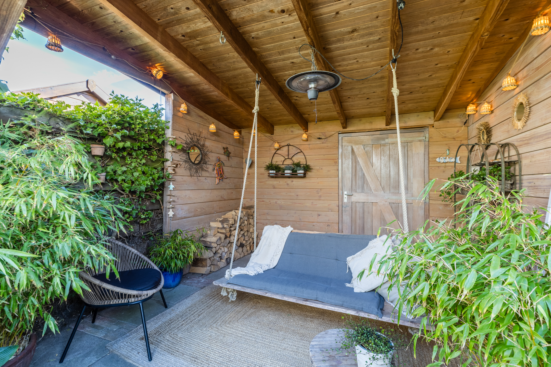⢠Zonnige achtertuin op het zuiden met terras onder een houten overkapping met geschakelde berging