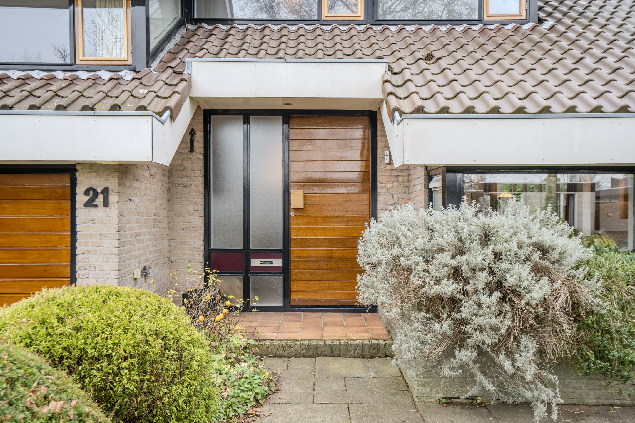 Through the spacious front yard with green borders and a wide driveway leading to the double garage, we reach the front door of the house.