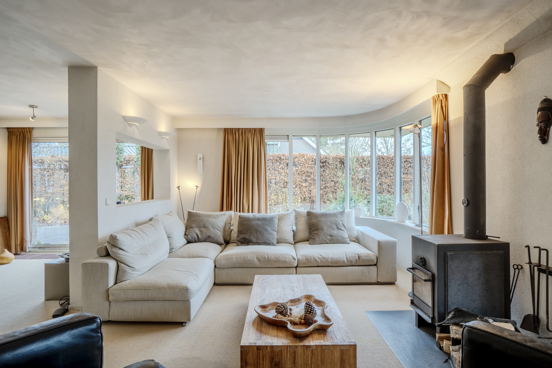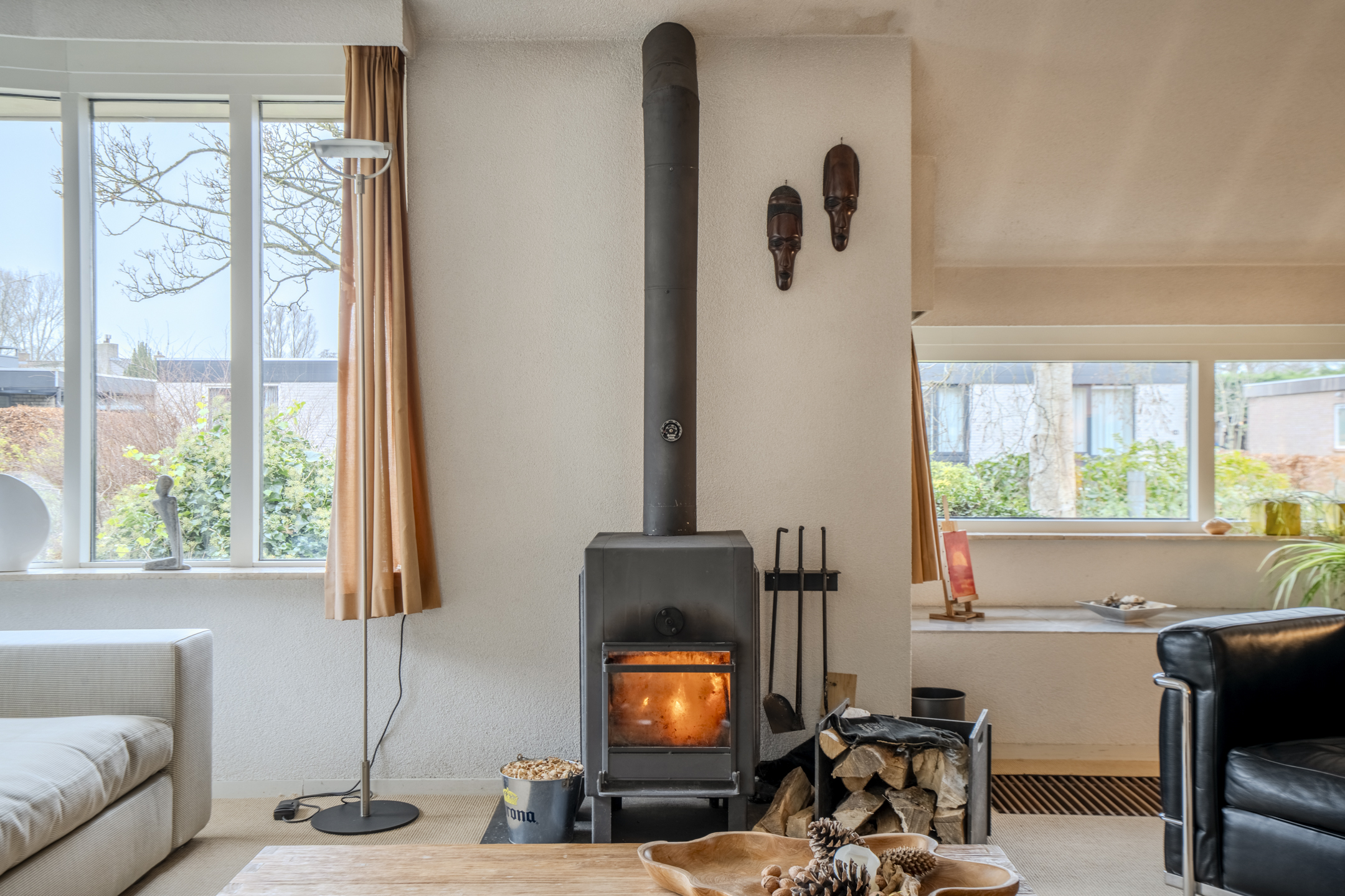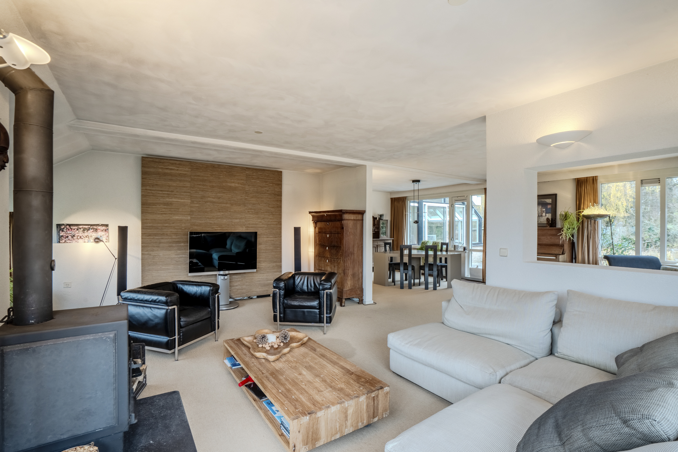 De royale woonkamer heeft een fijne open-plan indeling met een gedeelte aan de voorzijde aan het huis en een zonnige serre met open leefkeuken aan de tuinzijde van het huis. De vele grote raampartijen zorgen voor een grote hoeveelheid lichtinval gedurende de hele dag en tevens is er een gezellige houtkachel aanwezig.