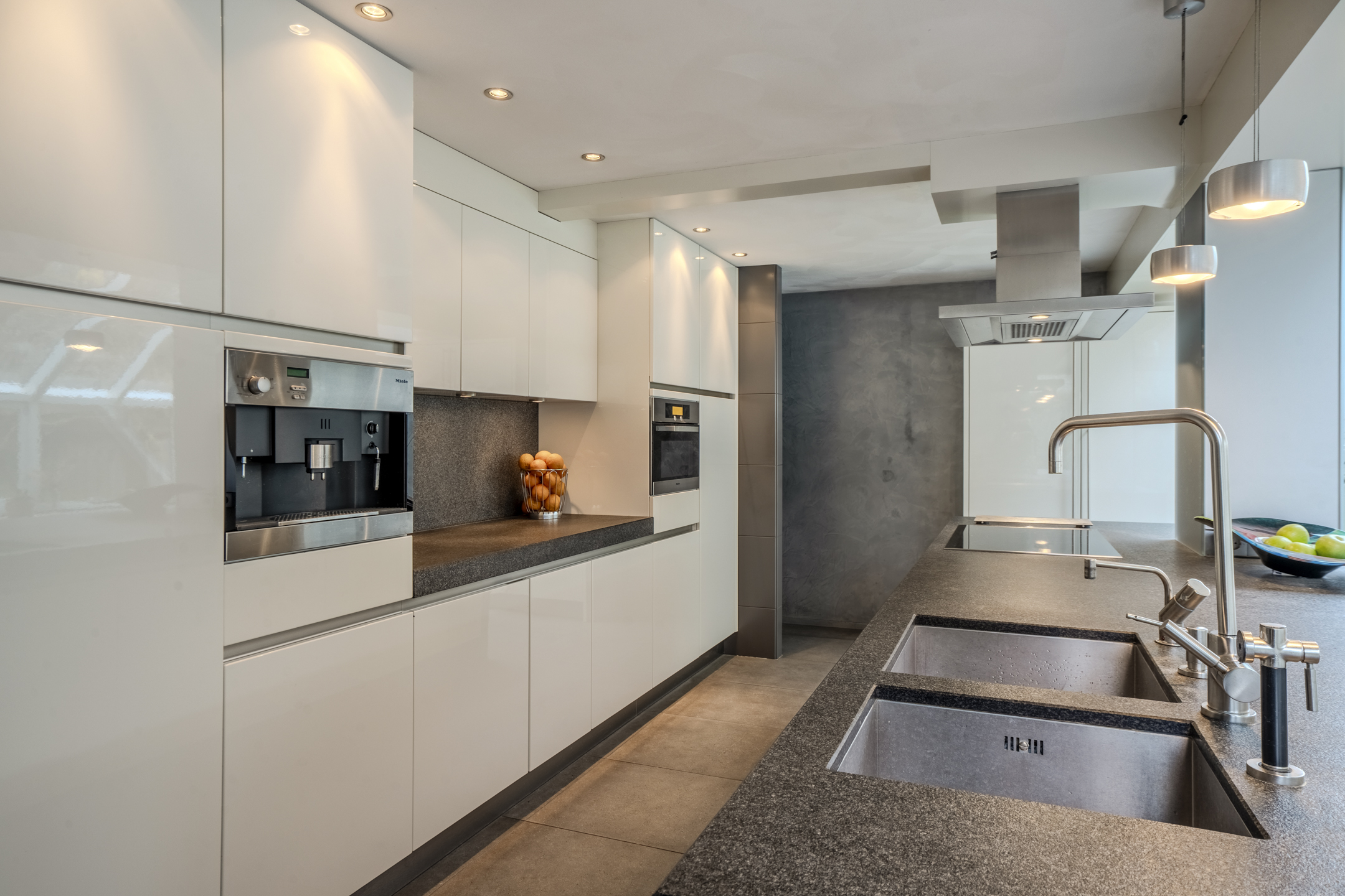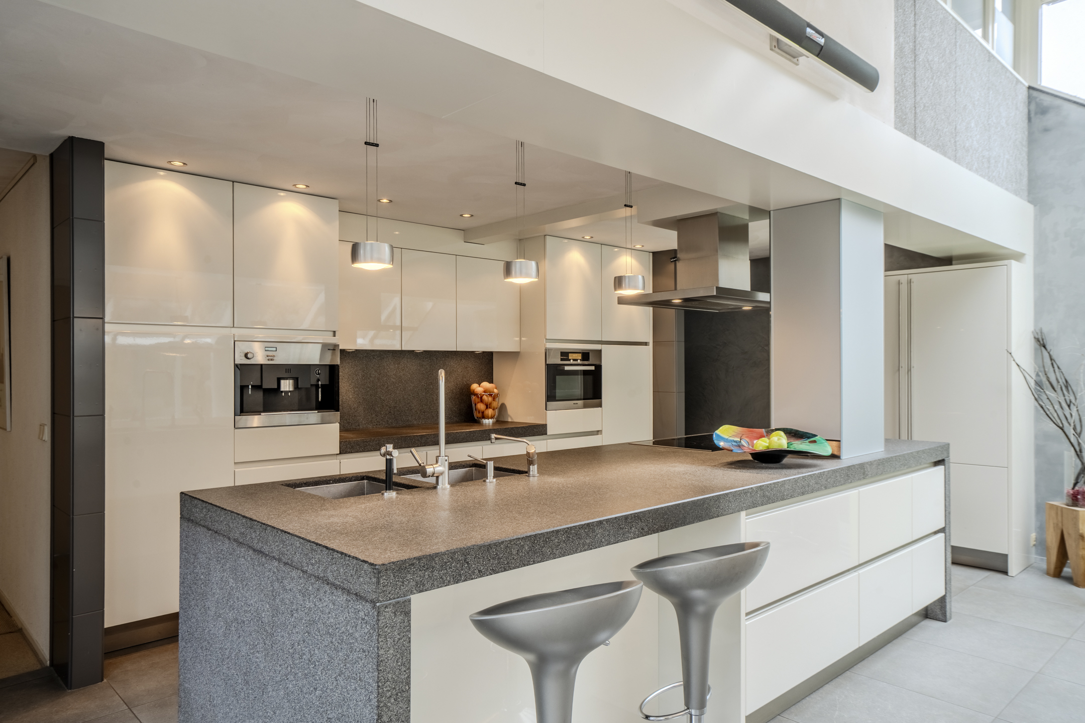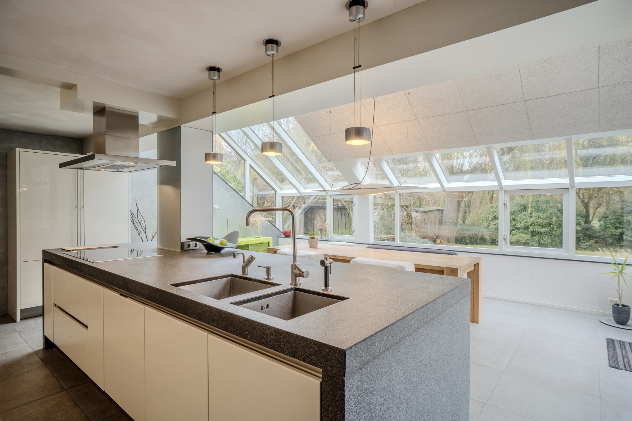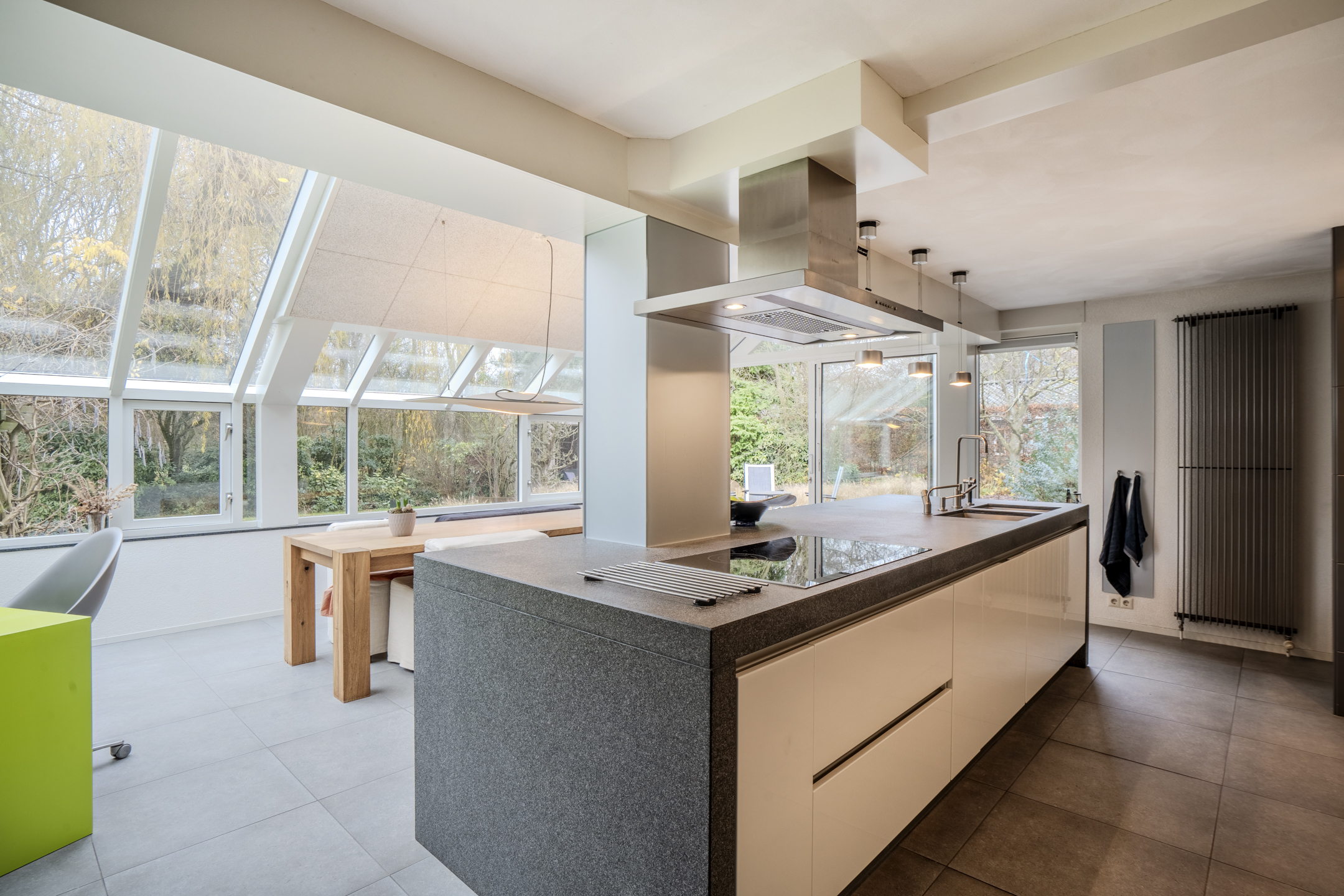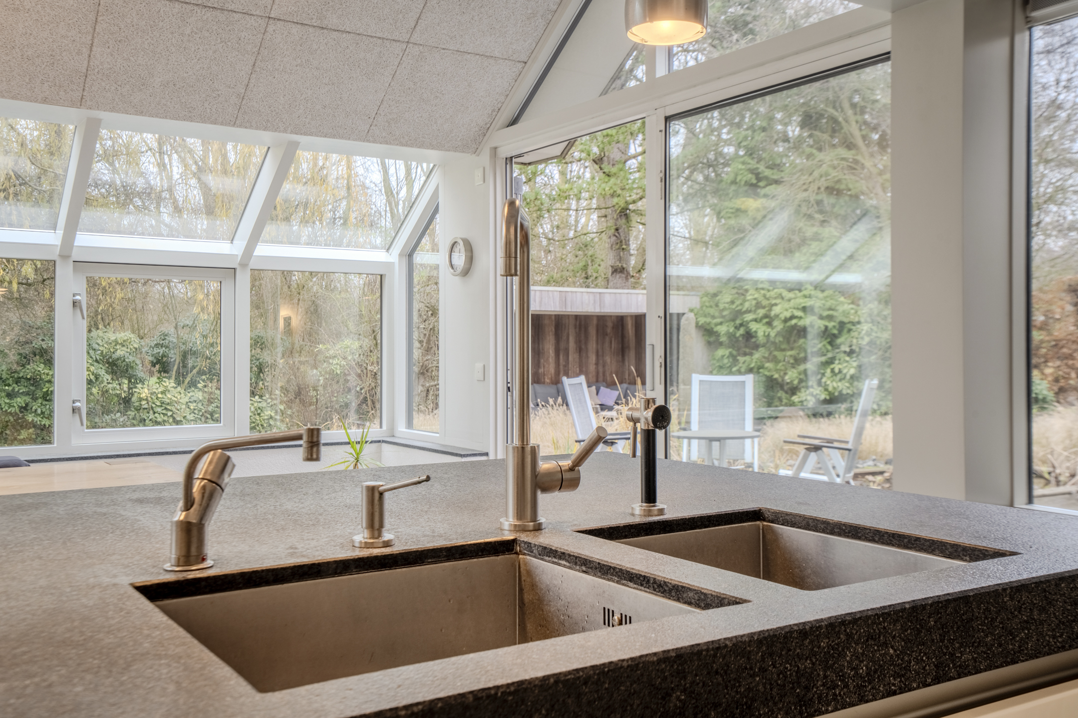 De luxe open keuken met kookeiland heeft een strak en greeploos design en is voorzien van moderne inbouwapparatuur: een inductiekookplaat, combimagnetron/heteluchtoven, Quooker kraan en een vriezer. In de serre/keuken is vloerverwarming aanwezig en vanuit hier is er inpandig toegang tot de garage.