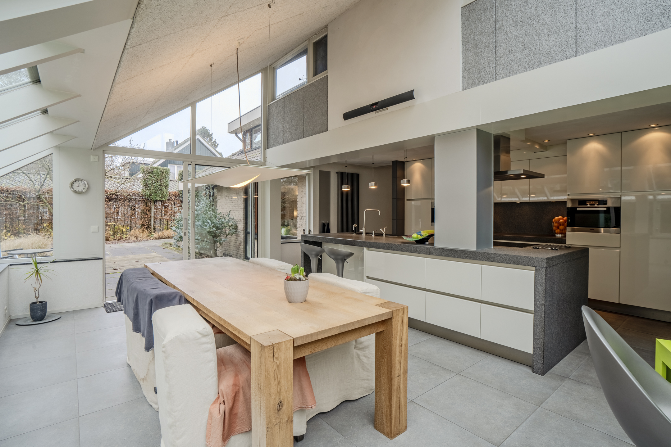 The luxurious open kitchen with cooking island has a sleek, handle-free design and is equipped with modern built-in appliances: an induction hob, combination microwave/convection oven, Quooker tap and a freezer. The conservatory/kitchen has underfloor heating and provides indoor access to the garage.