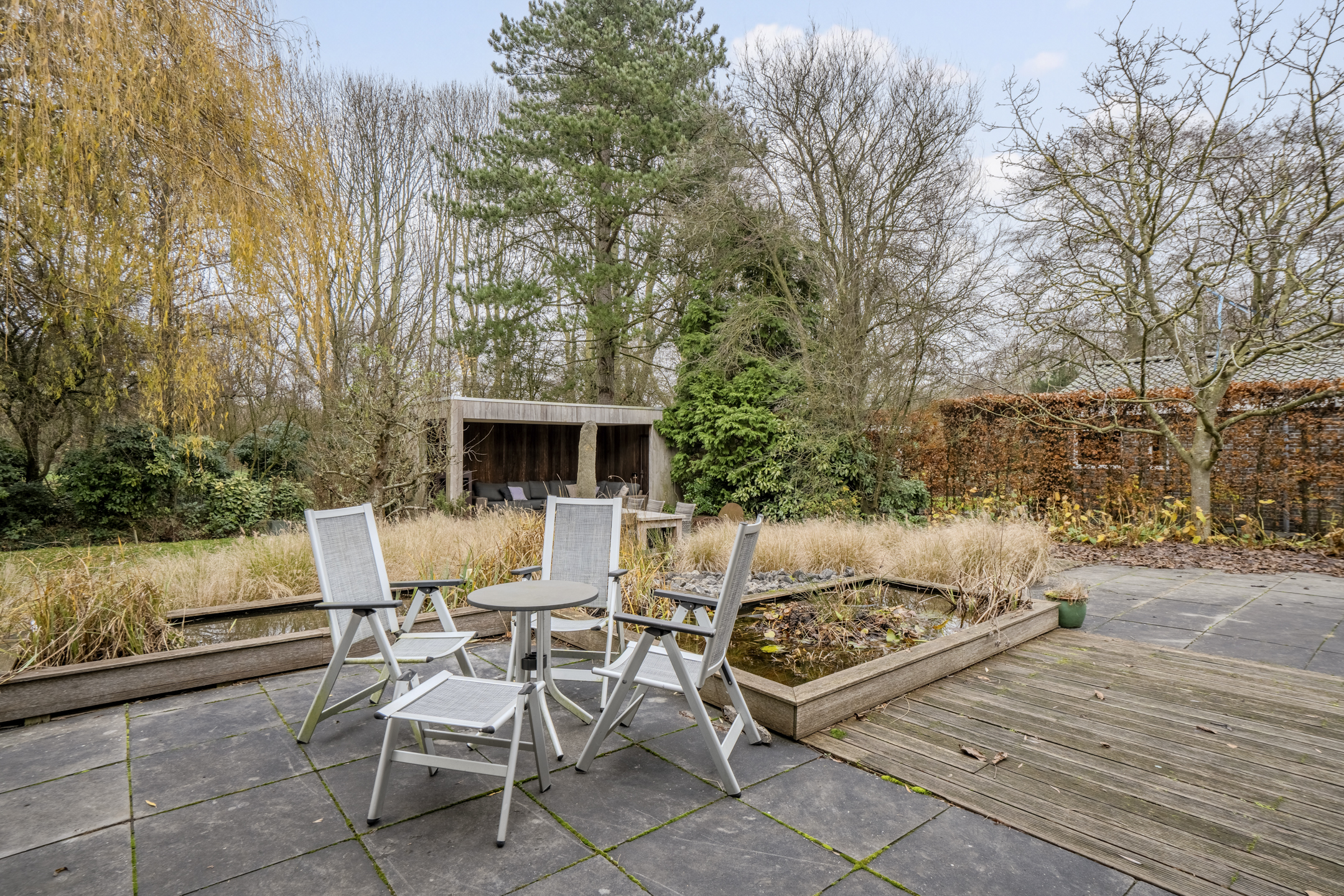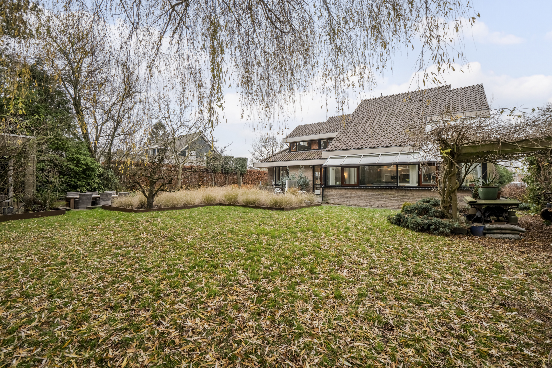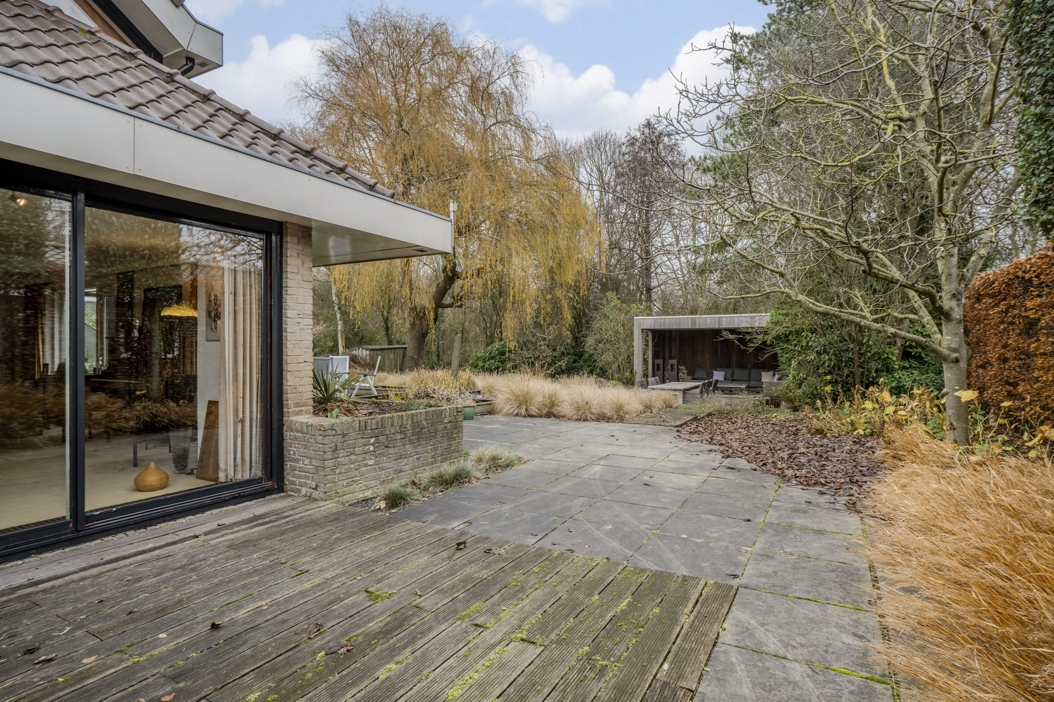 De woning is gelegen op een royaal perceel met een grote, parkachtige tuin rondom het huis. Er zijn diverse tegel- en vlonderterrassen en tevens is er een gezellig verandaterras onder een houten overkapping aanwezig. Op het perceel staan tevens 3 handige tuinschuurtjes. Omdat de tuin grenst aan een groenstrook en er geen achterburen zijn, is de tuin heerlijk rustig en privƩ.