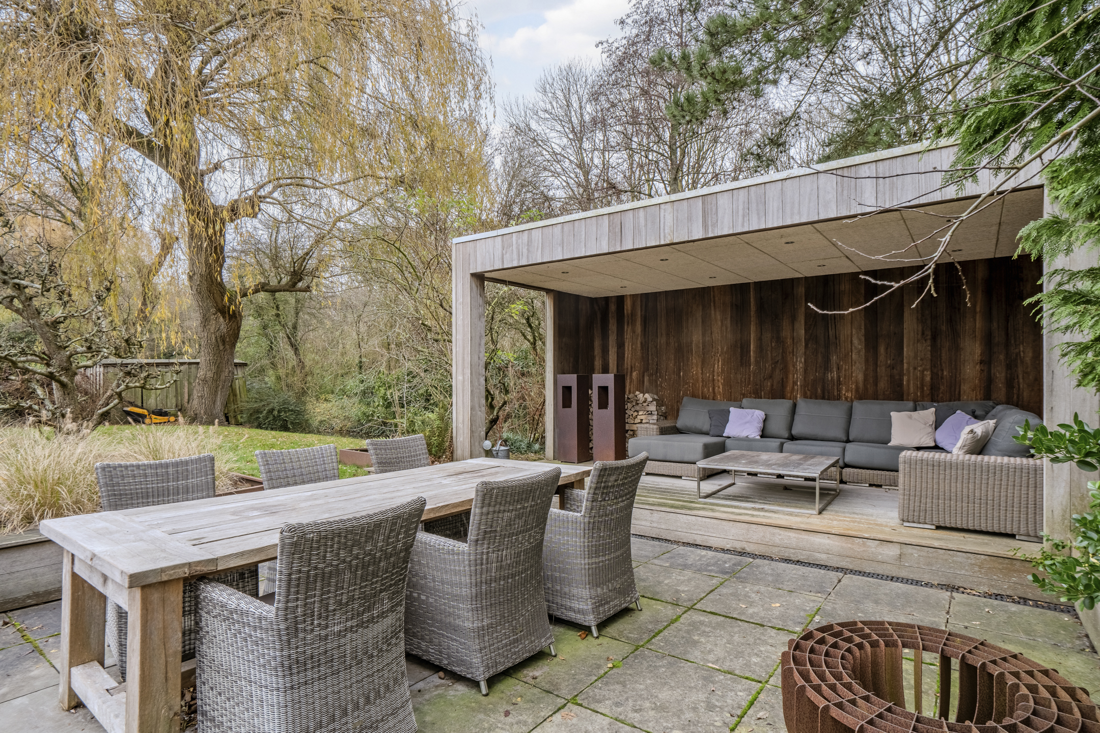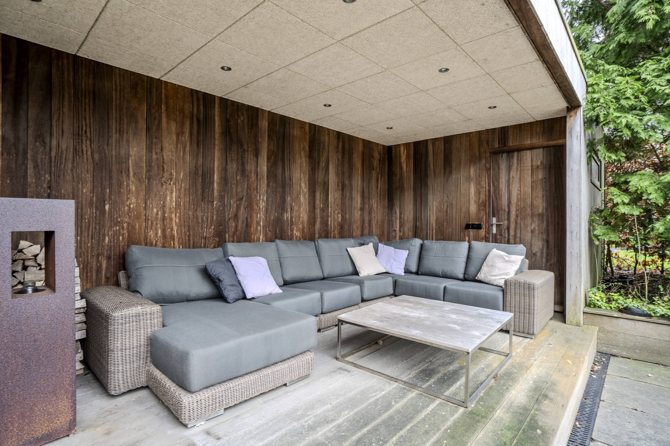 The property is situated on a spacious plot with a large, park-like garden surrounding the house. There are several tiled and decking terraces, as well as a cosy veranda terrace under a wooden canopy. The plot also features 3 handy garden sheds. As the garden borders a green area and there are no rear neighbours, it is wonderfully quiet and private.
