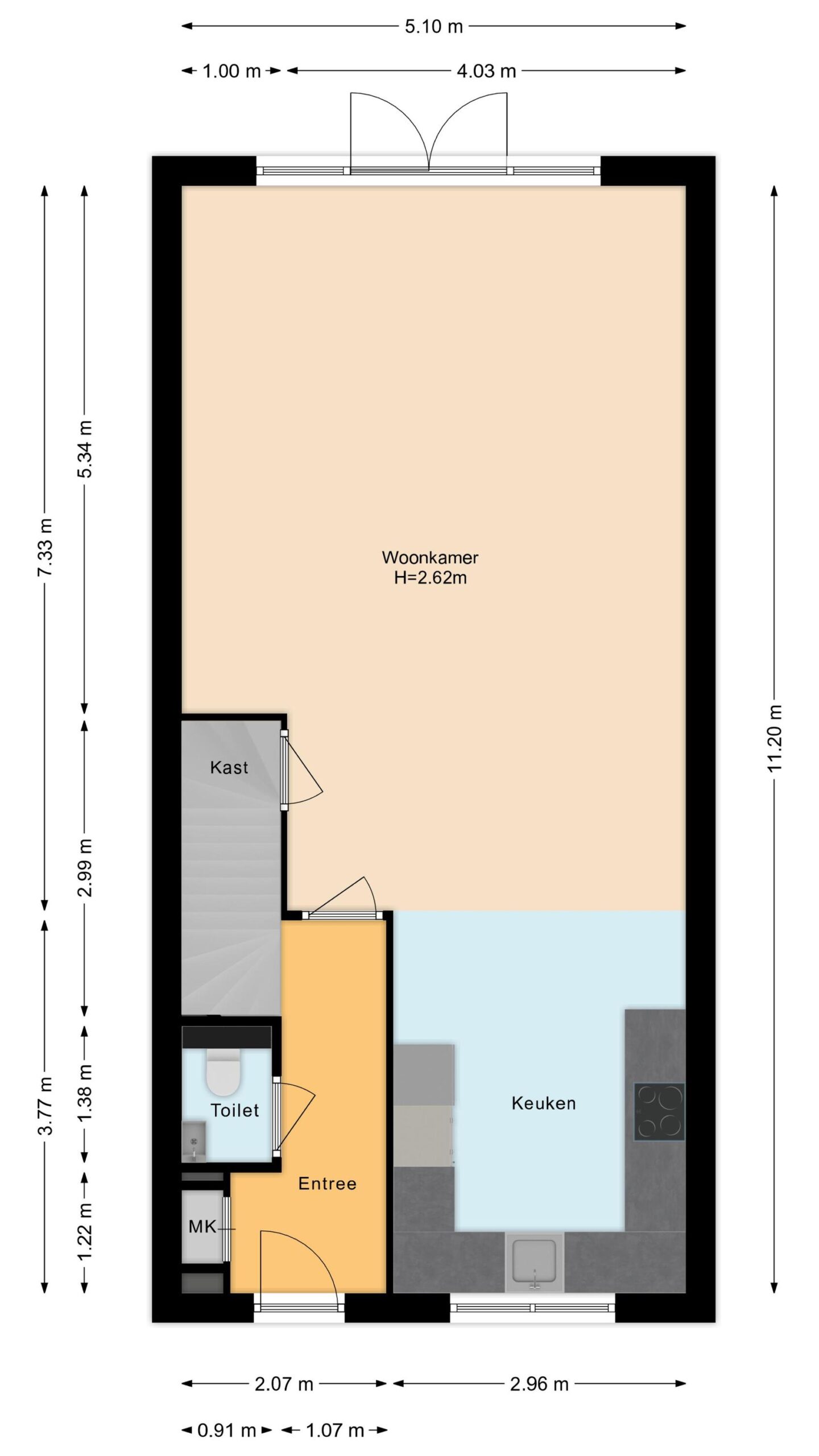 Achter de voordeur vinden we de entree met garderobe, meterkast, gastentoilet met fonteintje, trapopgang naar de eerste verdieping en toegang tot de lichte woonkamer met open keuken.