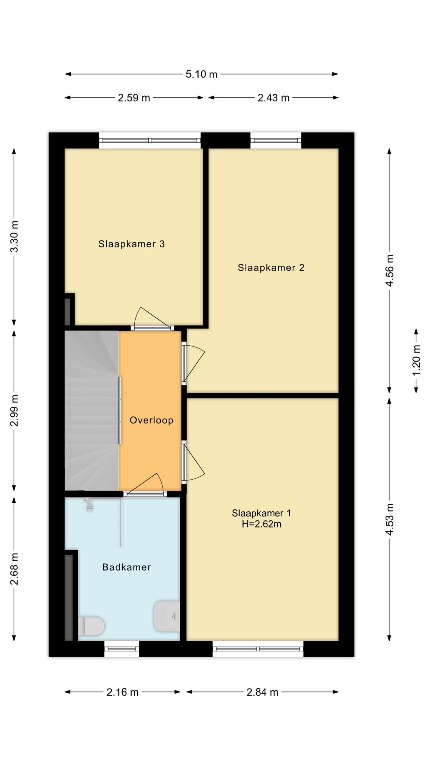 Op deze verdieping vinden we 3 slaapkamers waarvan 2 aan de achterzijde van de woning en 1 aan de voorzijde. Op deze verdieping vinden we ook de ruime badkamer met tweede toilet, wastafel en een inloopdouche.