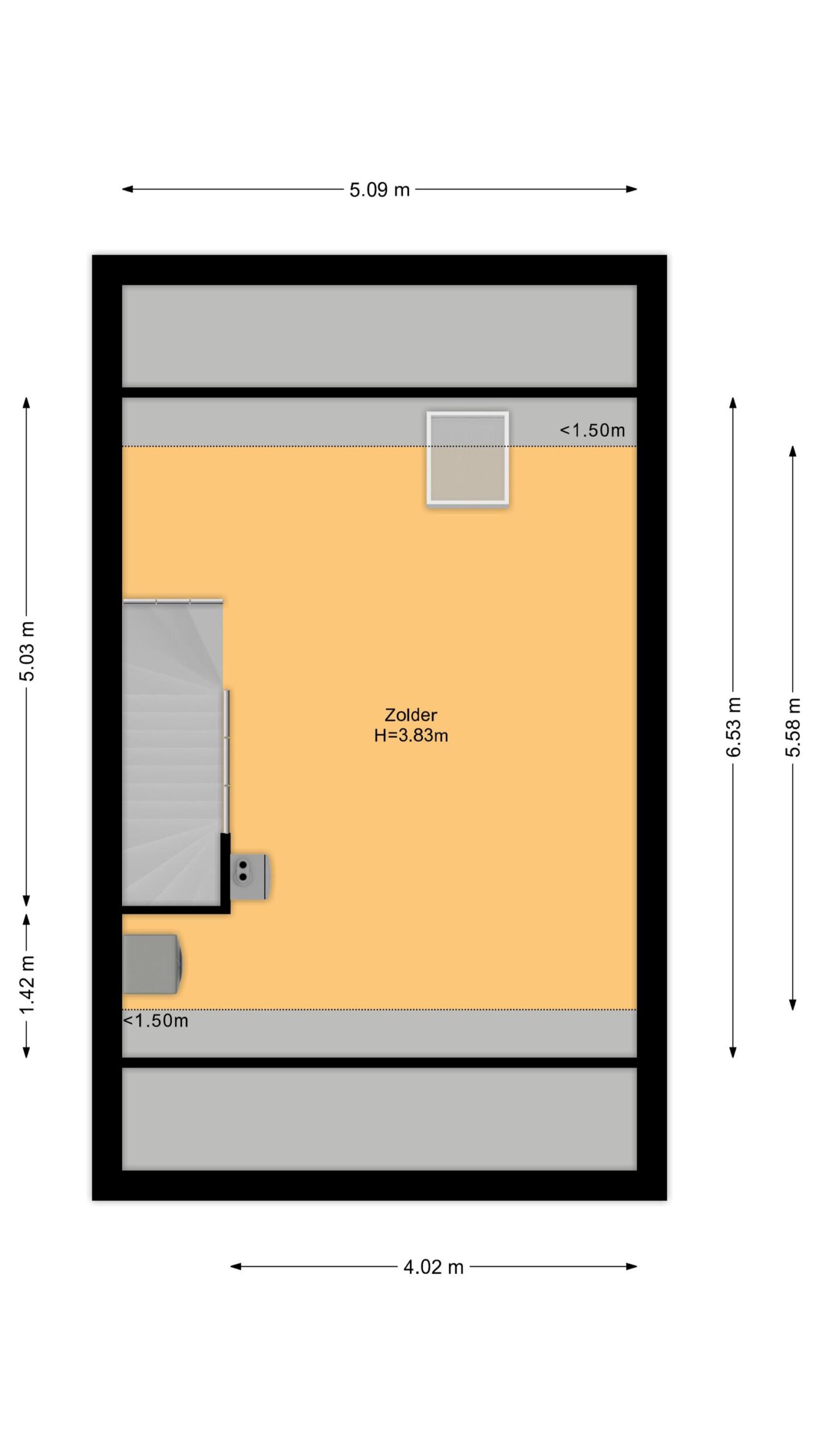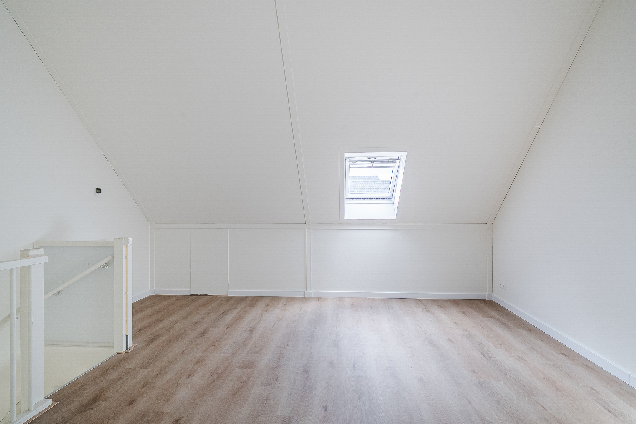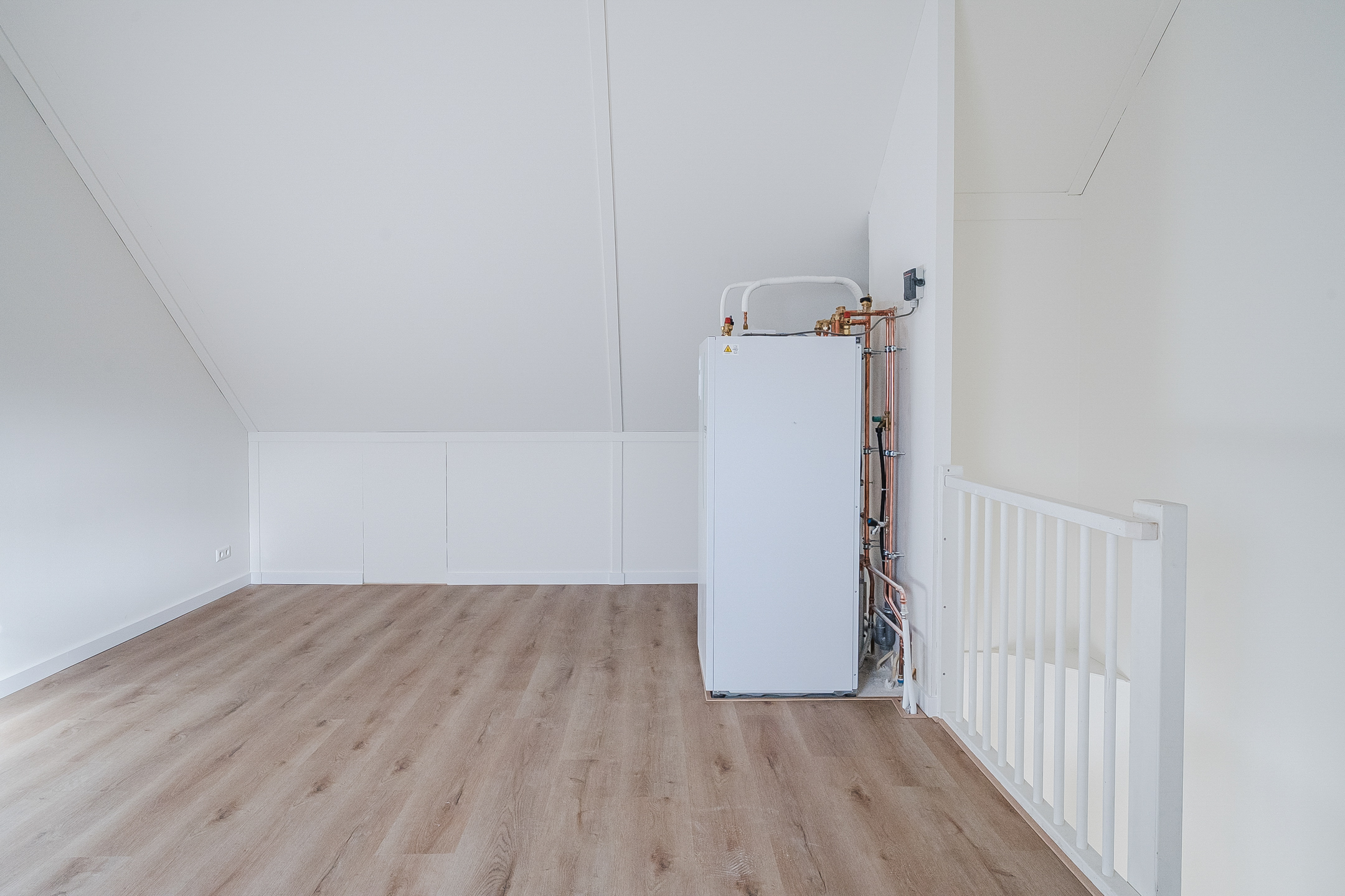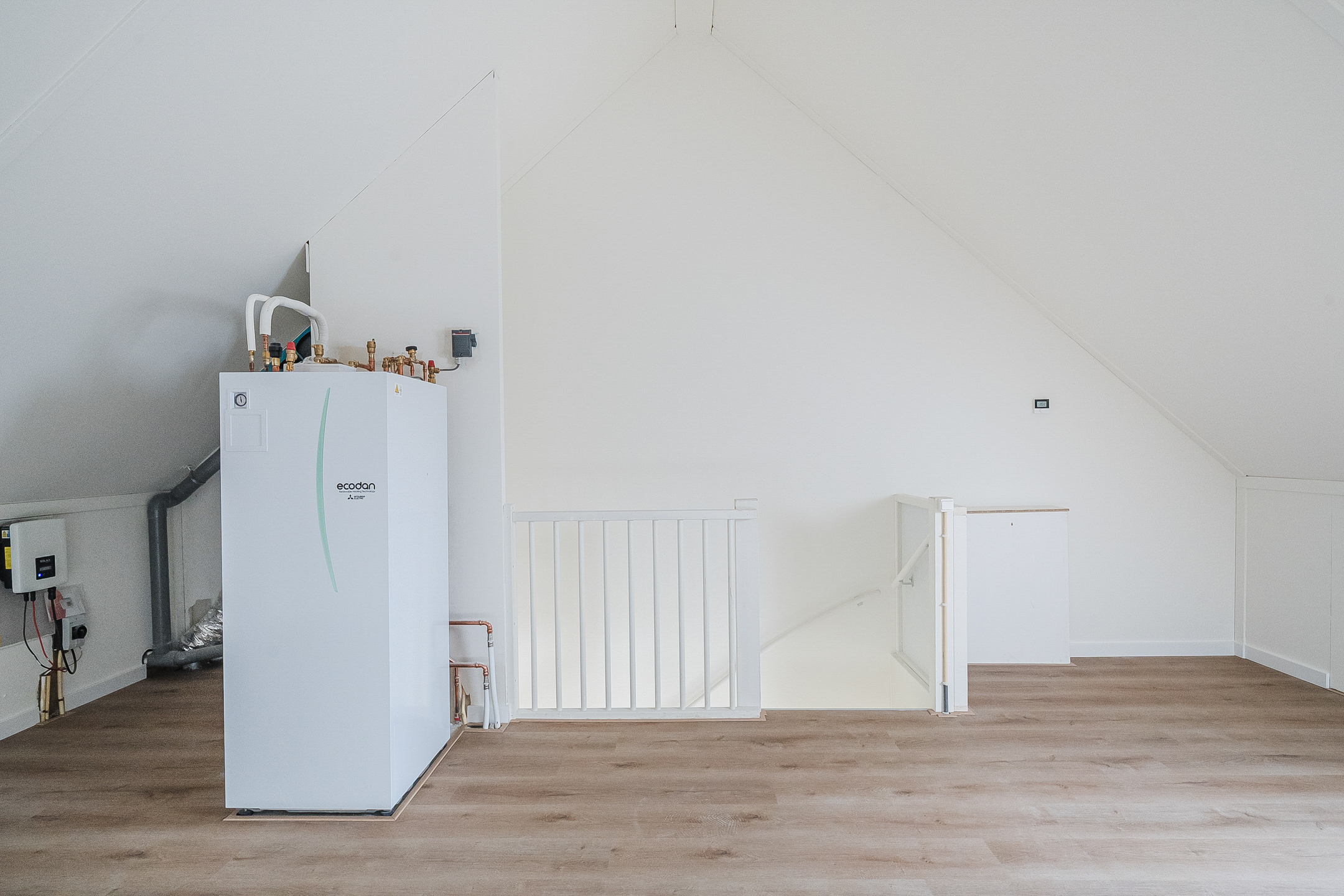 Through the fixed staircase on the first floor, we reach the spacious second floor with a large open attic room (4th bedroom). On this floor, we also find the connections for the white goods set-up and the high ridge ceiling gives a lot of character to the room.