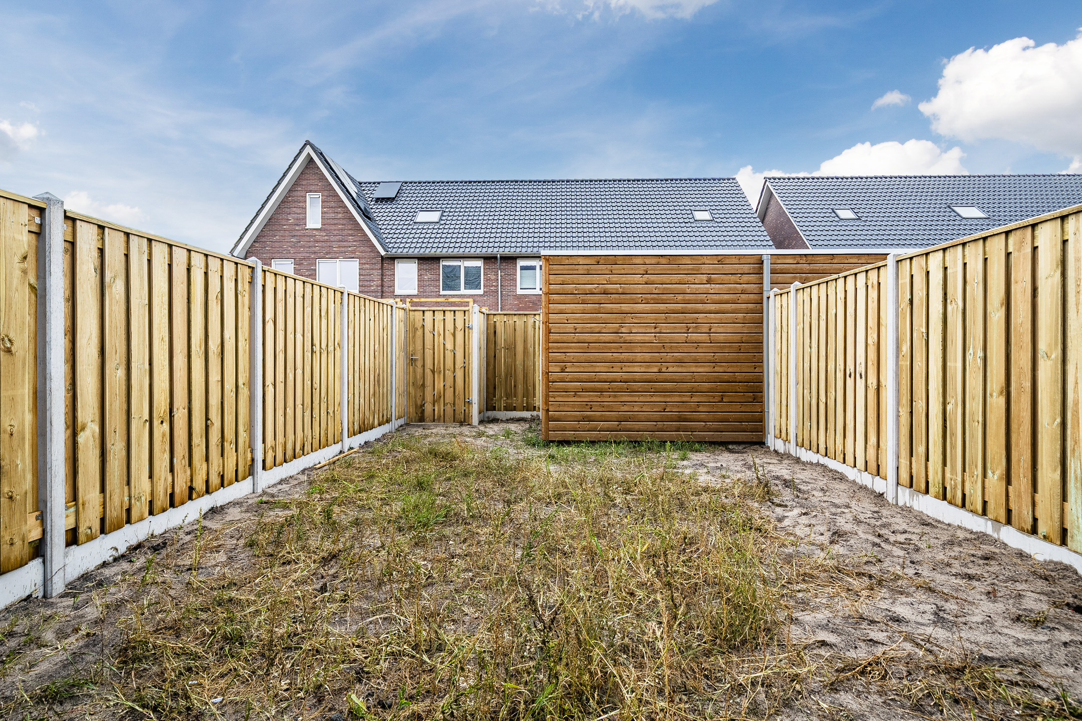 De achtertuin is gelegen op het zuidoosten en kan nog naar eigen smaak en wens aangelegd worden. Achterin de tuin staat een handige houten berging welke voorzien is van elektriciteit.