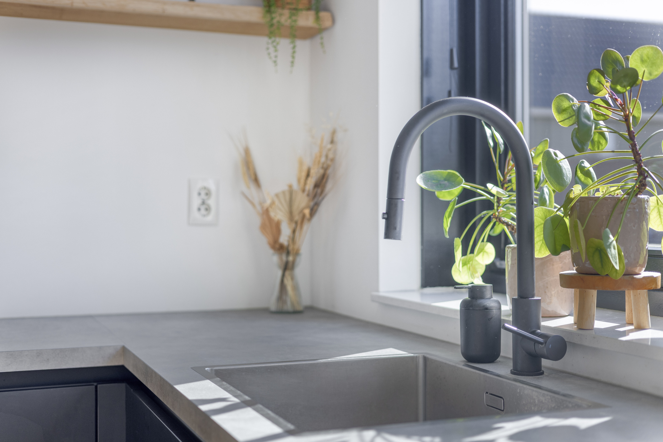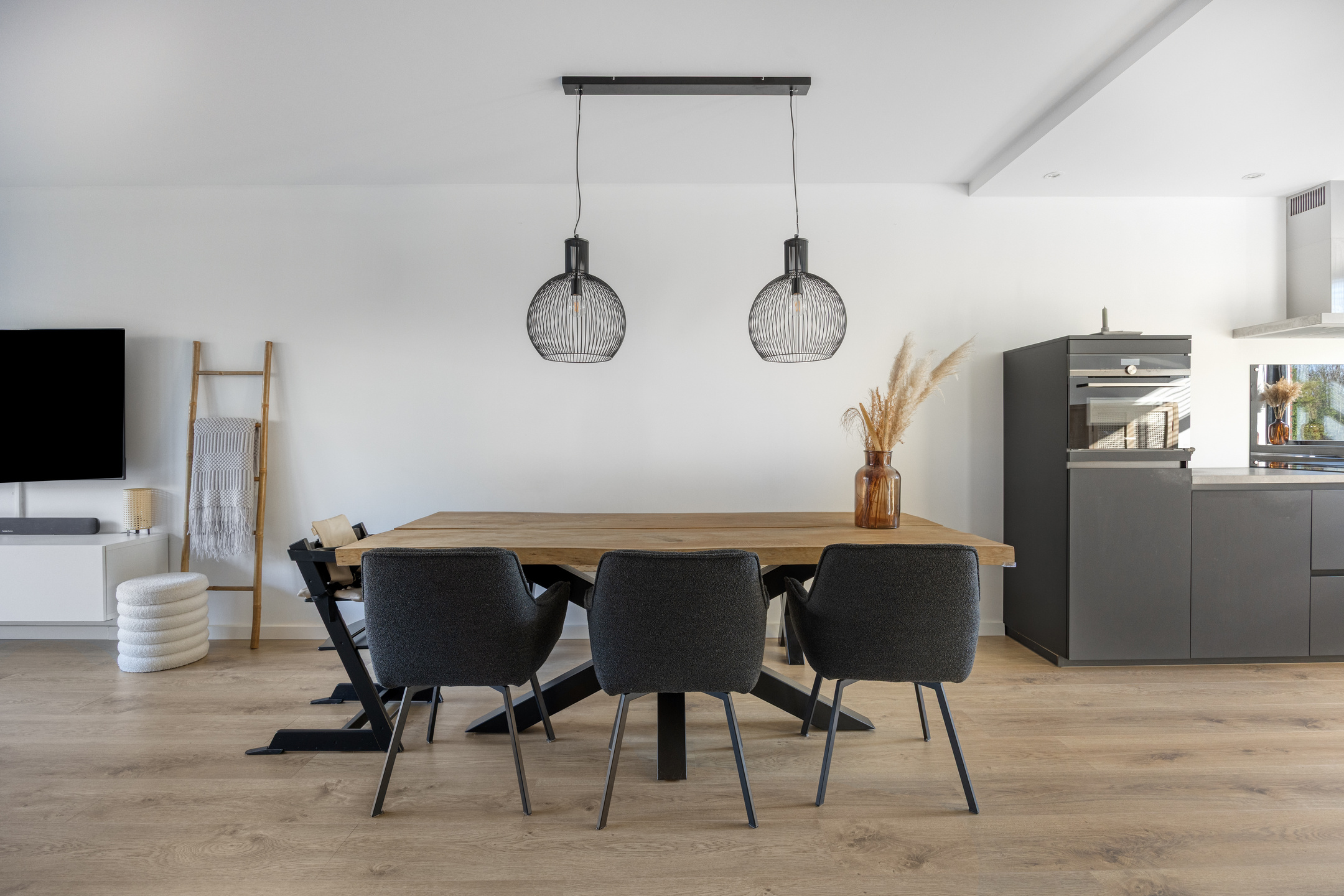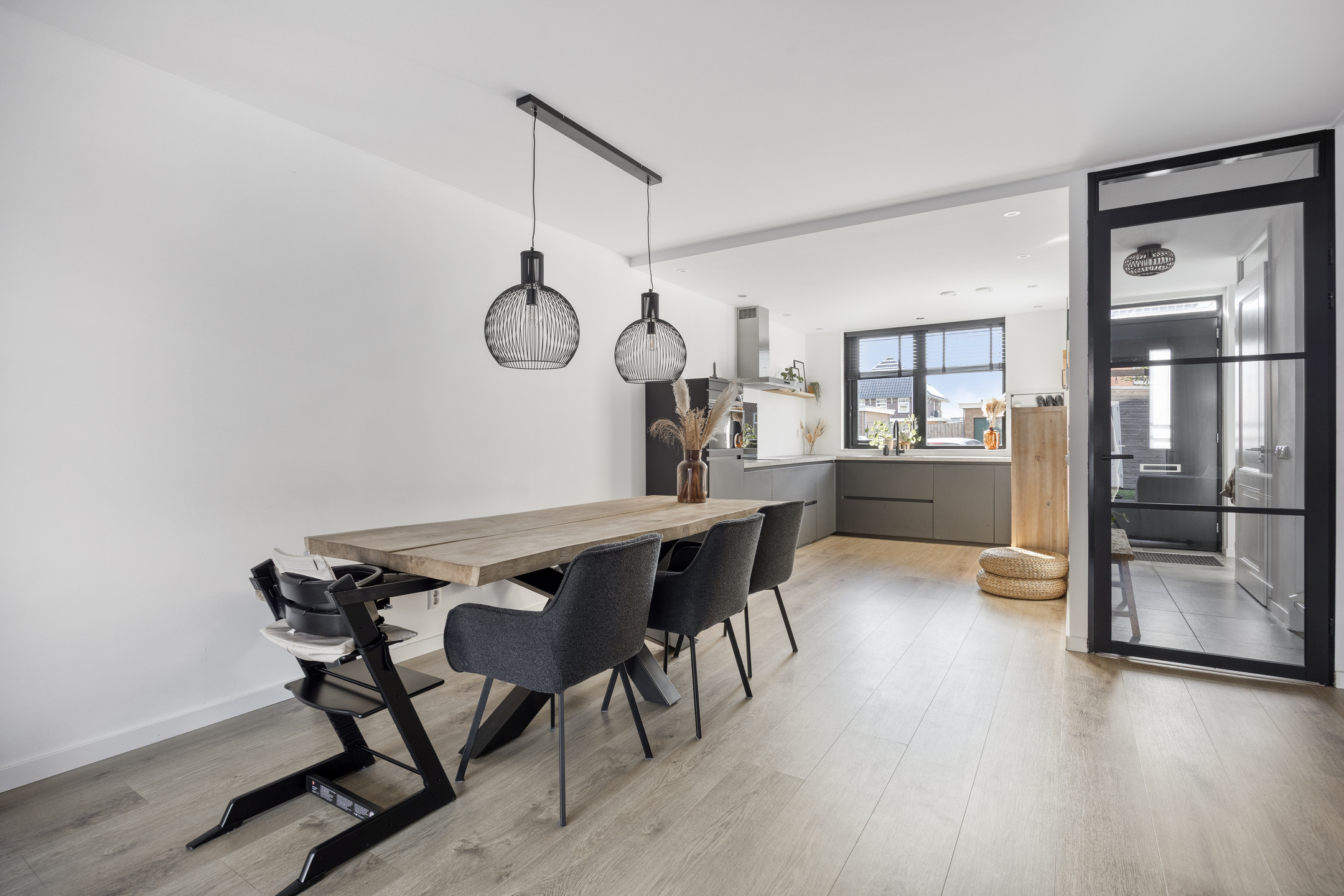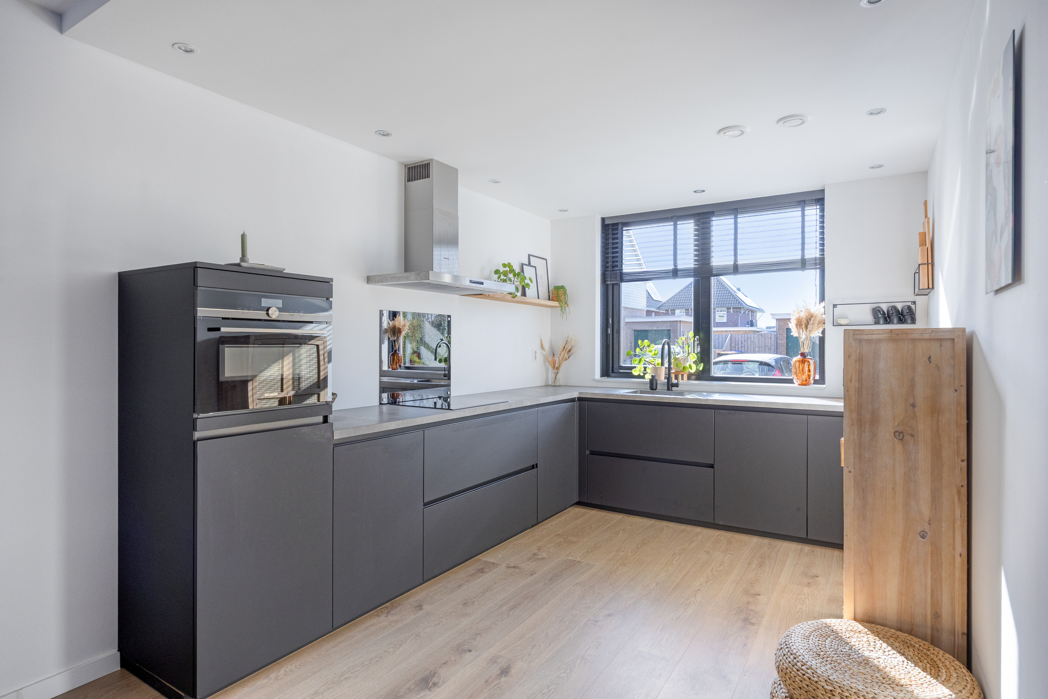 At the front of the house is the modern, move-in ready kitchen. It features an L-shaped countertop and is equipped with various built-in appliances, including an induction hob with extractor hood, sink, dishwasher, and a combination oven. A great place where cooking and conviviality come together.