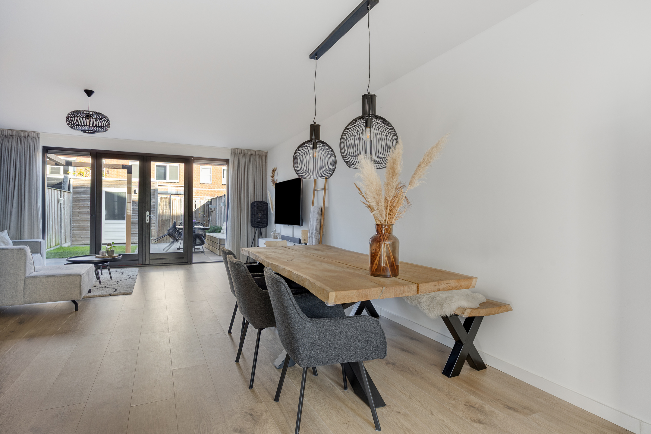 The living room forms the heart of the ground floor and is characterized by its open layout and pleasant natural light. Large windows and French doors to the garden create a spacious and fresh atmosphere. You can easily arrange a comfortable seating area and a cozy dining space here, perfect for both relaxation and socializing.
