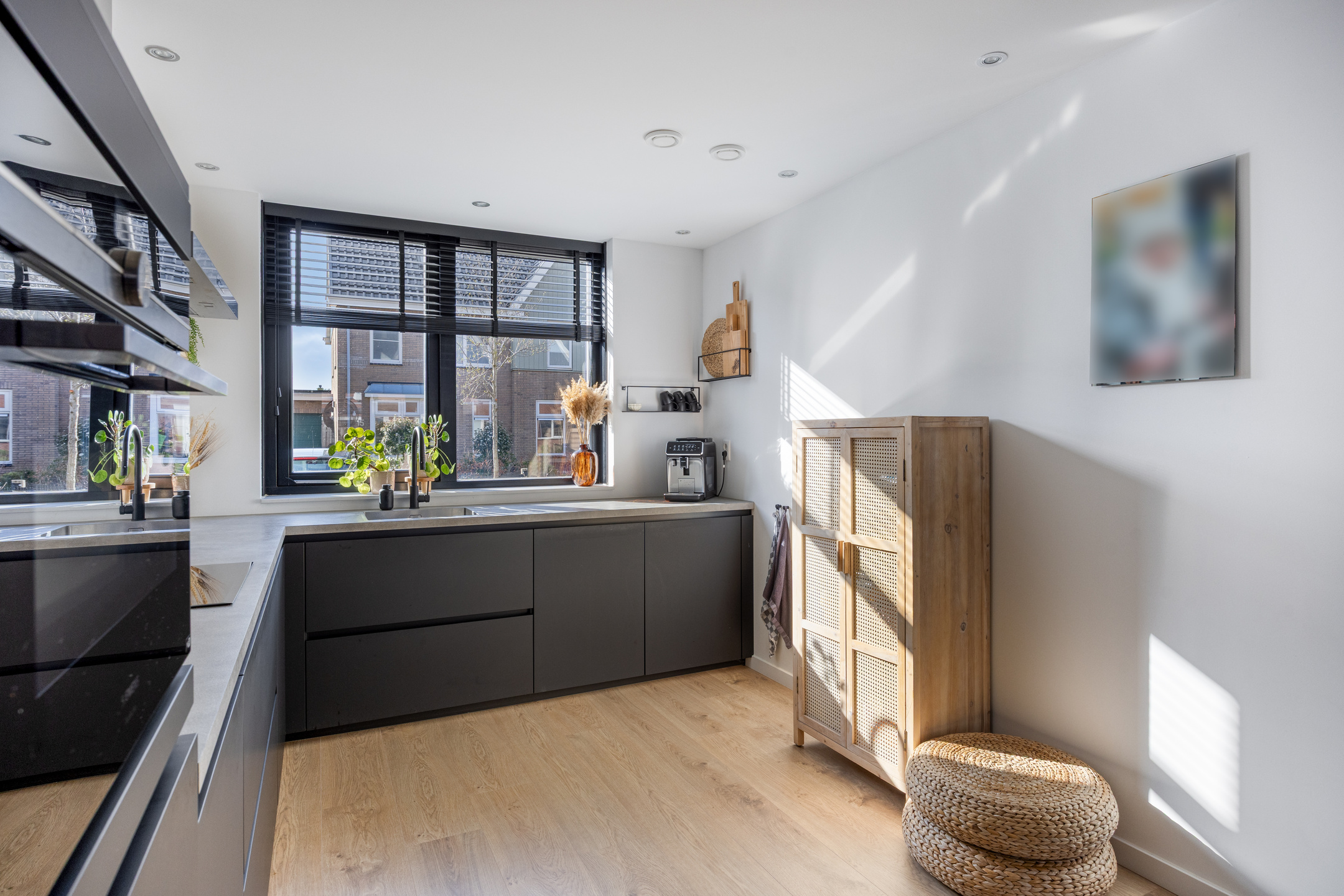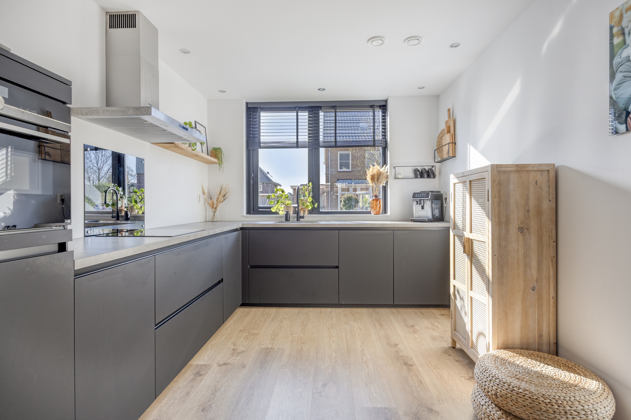 Aan de voorzijde van de woning bevindt zich de moderne, instapklare keuken. De keuken is uitgevoerd met een L-vormig aanrechtblad en voorzien van diverse inbouwapparatuur, waaronder een inductiekookplaat met afzuigkap, spoelbak, vaatwasser en een ovencombinatie. Een fijne plek waar koken en gezelligheid samenkomen.