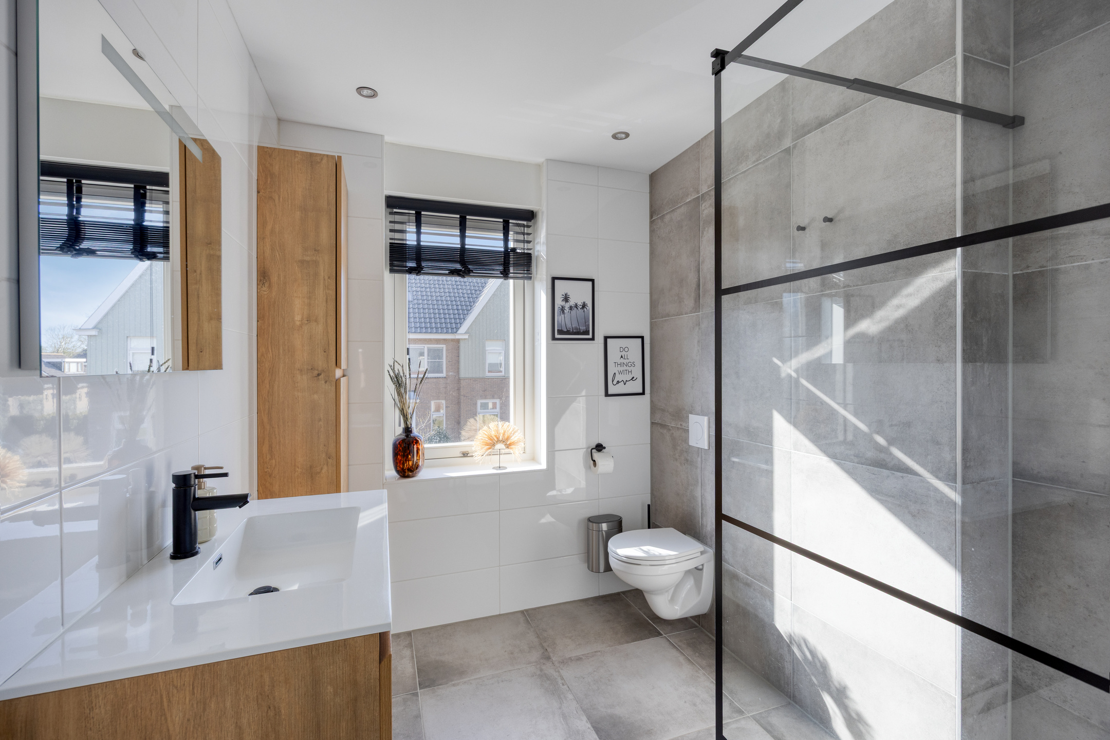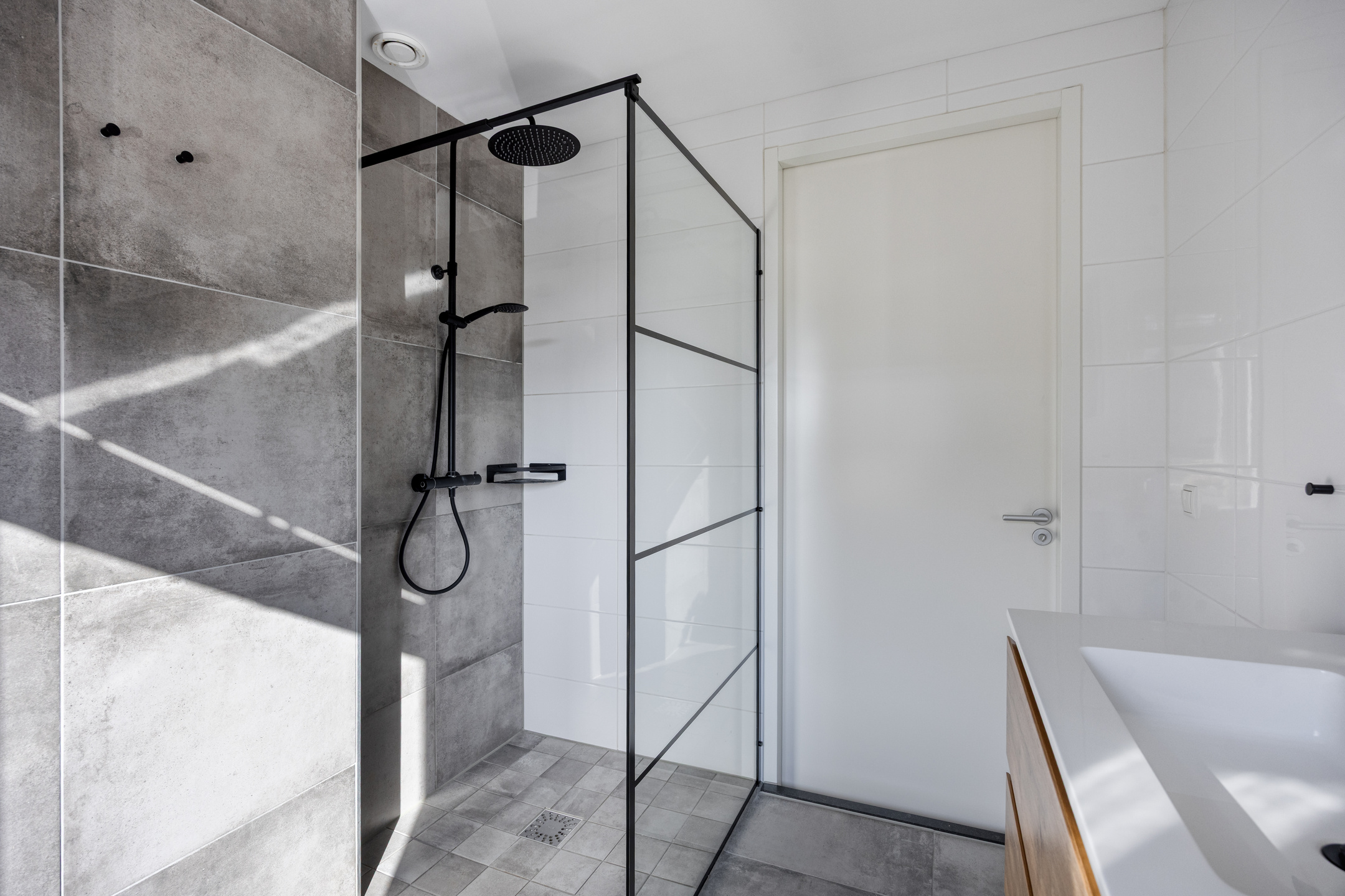 De badkamer is volledig betegeld en modern afgewerkt. U beschikt hier over een ruime douche met glazen wand, een wastafel met spiegel en opbergmeubel en een zwevend toilet. Een comfortabele en verzorgde ruimte waar u de dag ontspannen begint en eindigt.