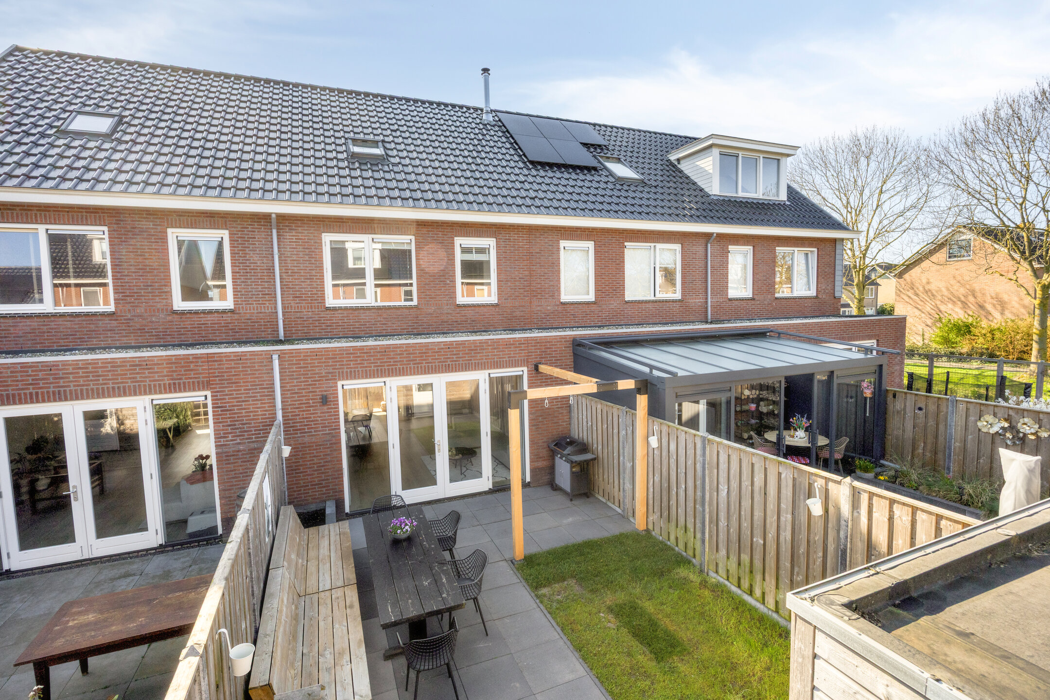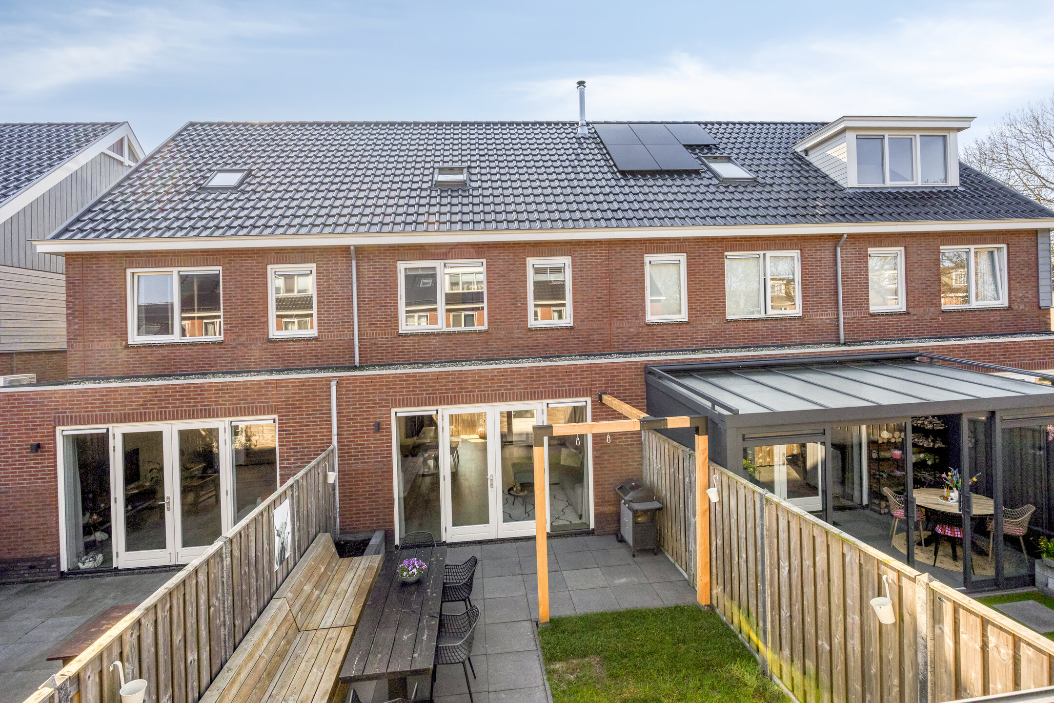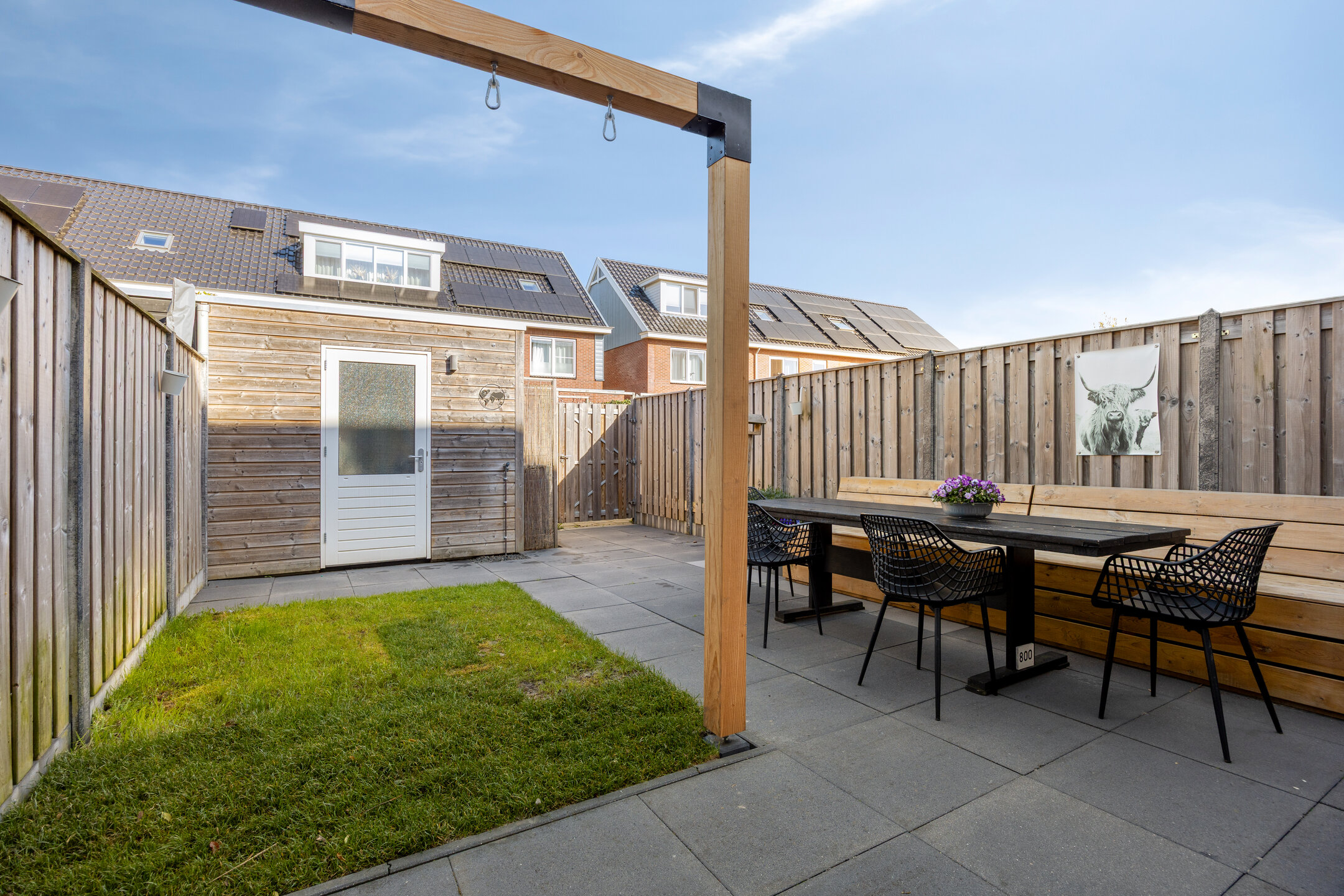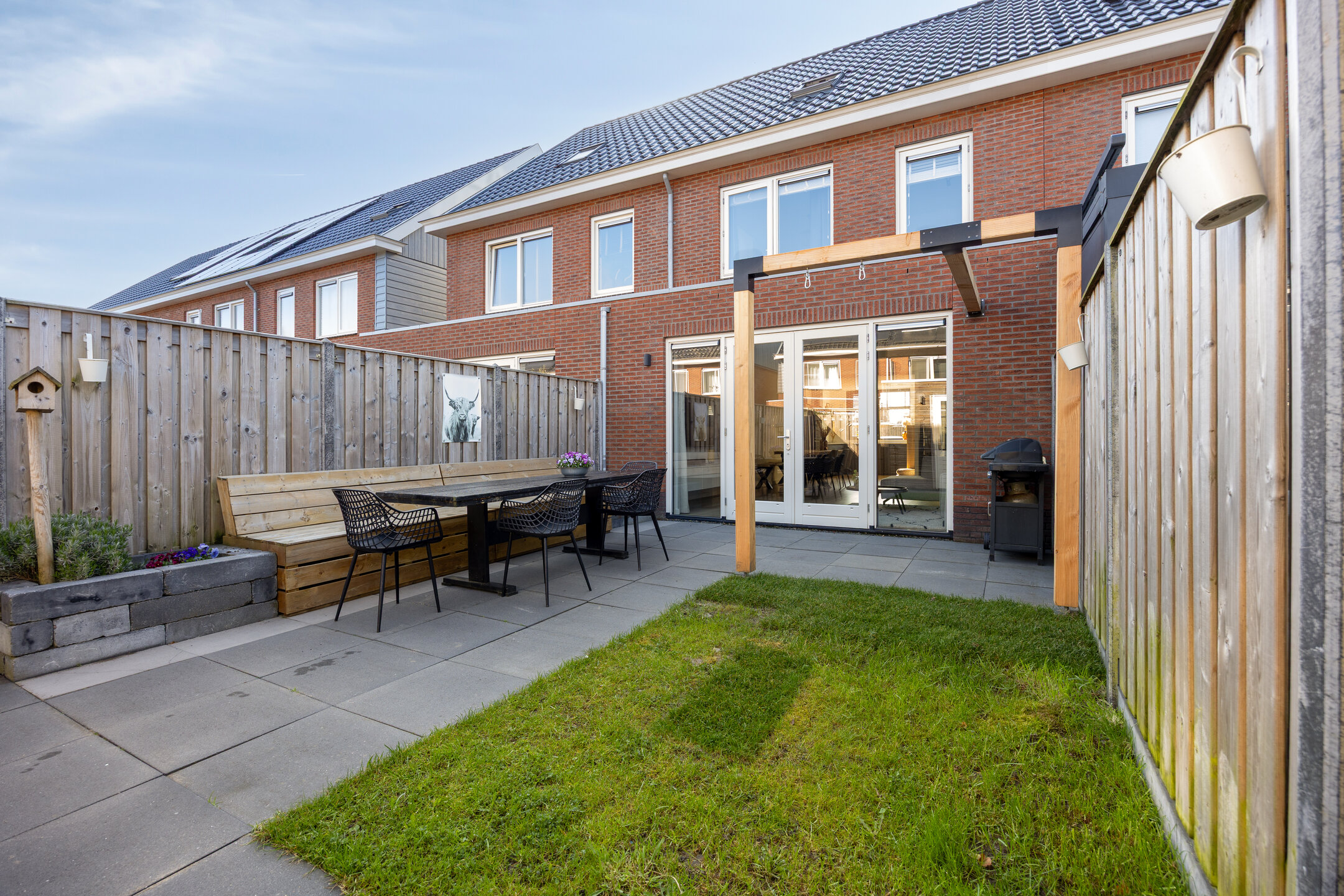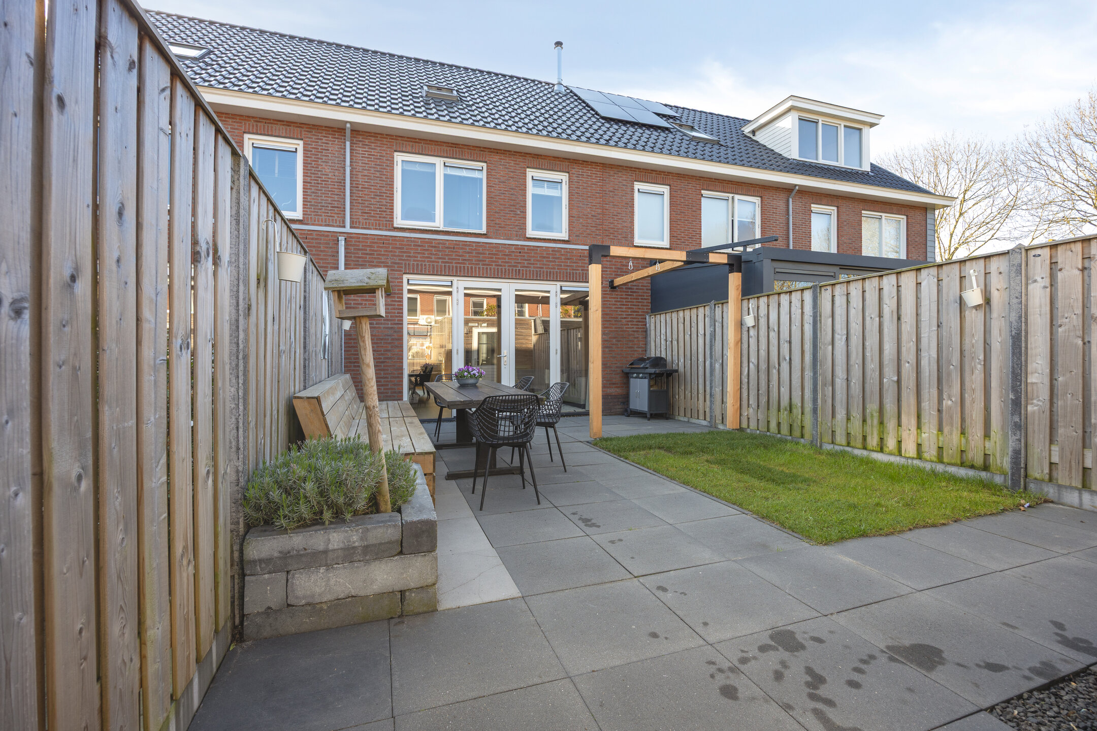 The backyard faces northwest and offers a pleasant place to enjoy outdoor living. The garden is largely paved and complemented with greenery, making it easy to create a cozy terrace. At the back of the garden, there is a practical storage shed, and the garden is easily accessible via a rear entrance.