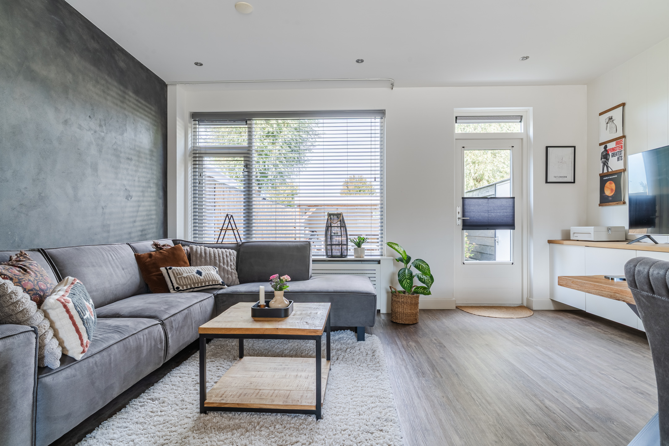 Achter de voordeur vinden we de compacte entreehal met de meterkast en de toegang tot de zonnige woonkamer met open keuken.