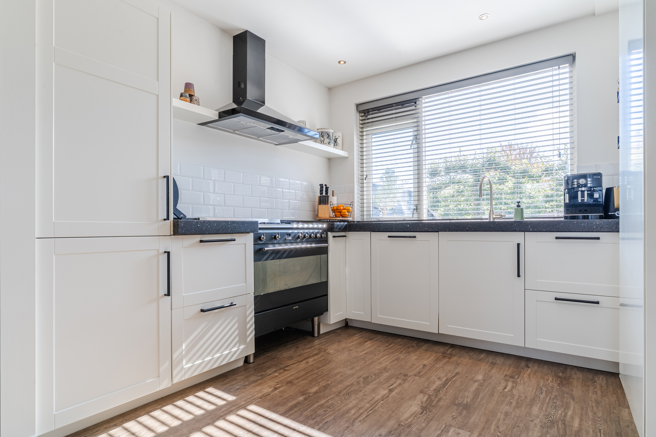 De open keuken bevindt zich aan de voorzijde van de woning en is uitgevoerd met een gaskookplaat, oven, koelkast vriezer en een vaatwasser.