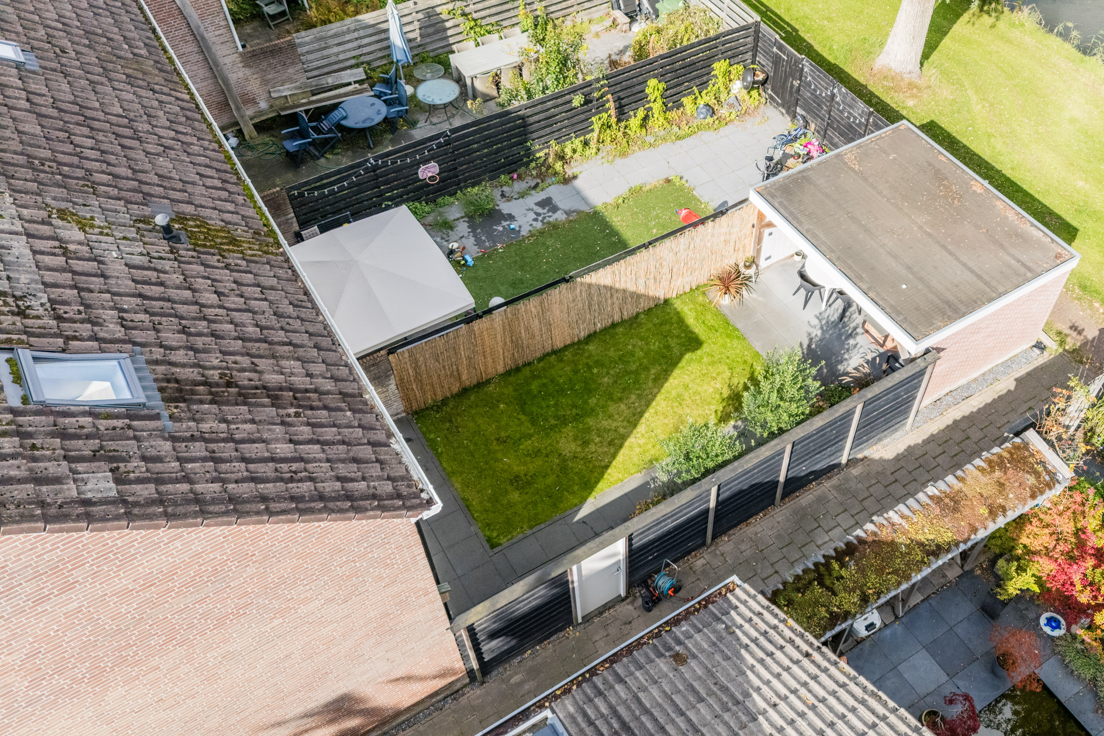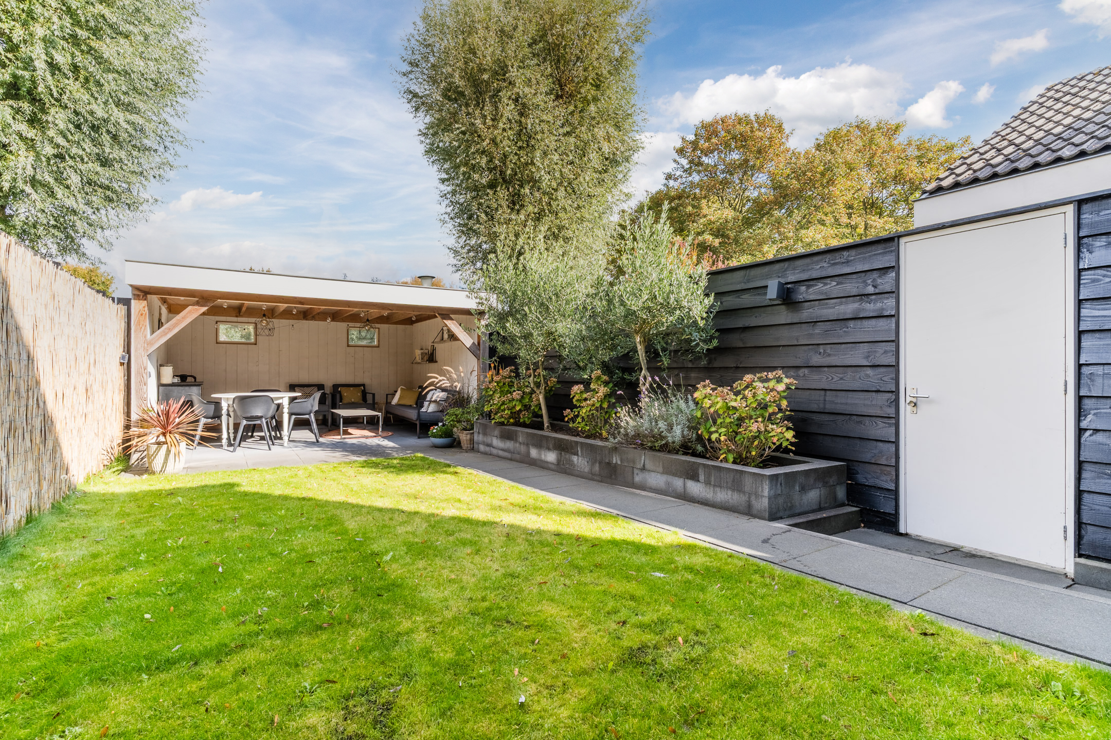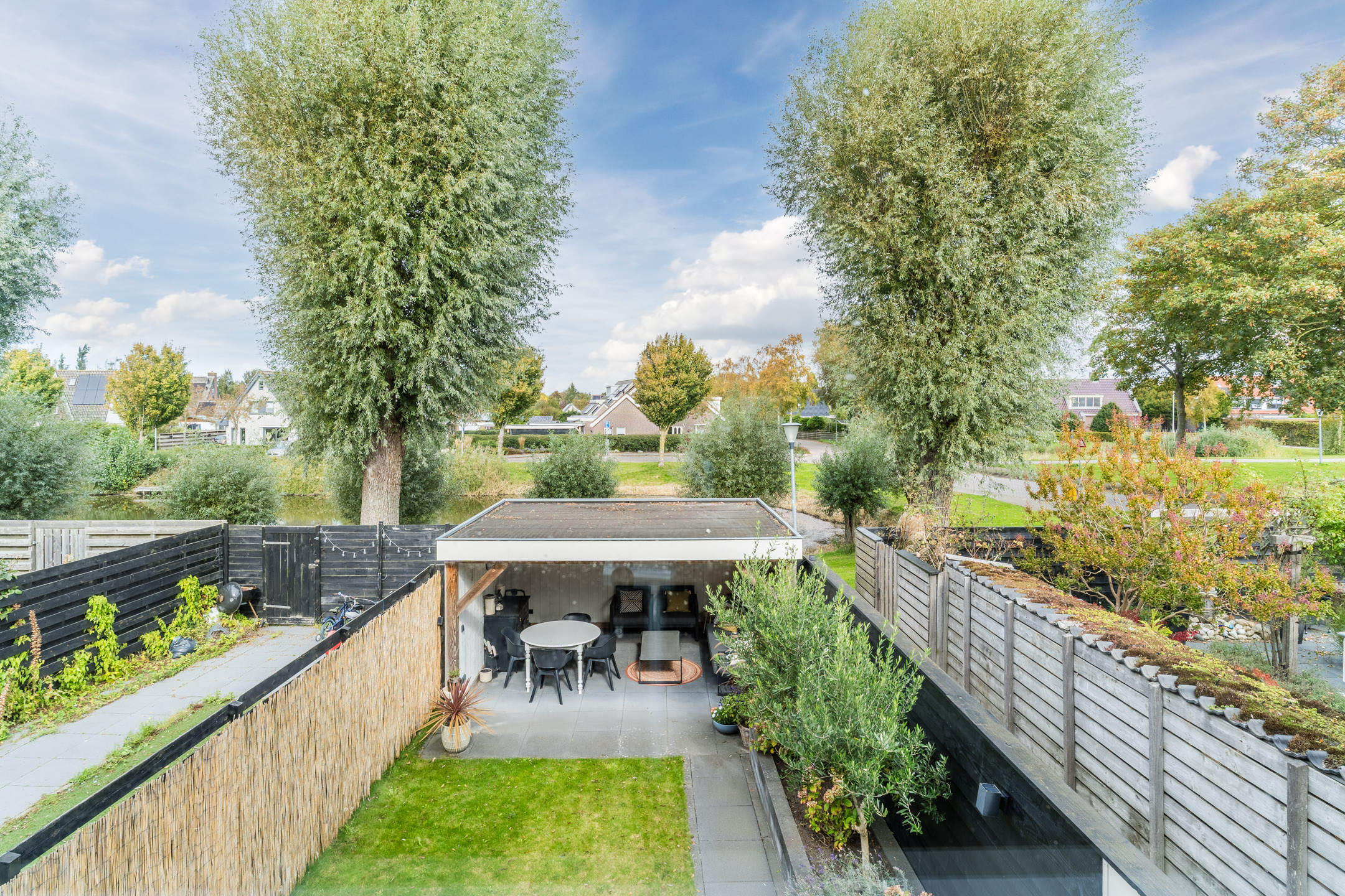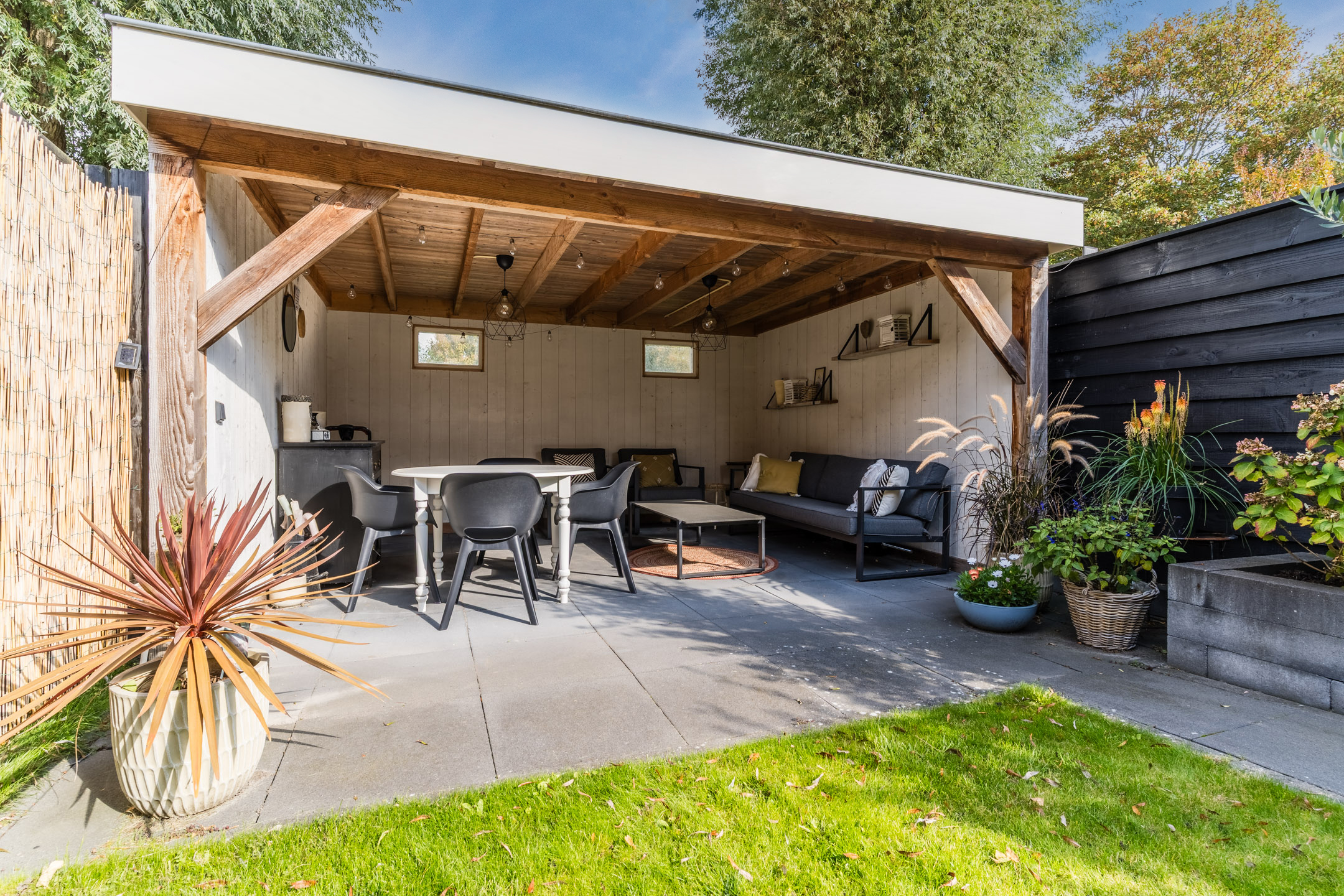 De ruime achtertuin is gelegen op het noorden en fraai aangelegd met een groot grasveld omlijst door groene borders en een betegeld pad naar een gezellige tuinkamer onder een houten veranda achterin de tuin. Omdat de tuin grenst aan een groenstrook en sloot, heb je geen directe achterburen en zit je in de tuin heerlijk rustig en prive.
