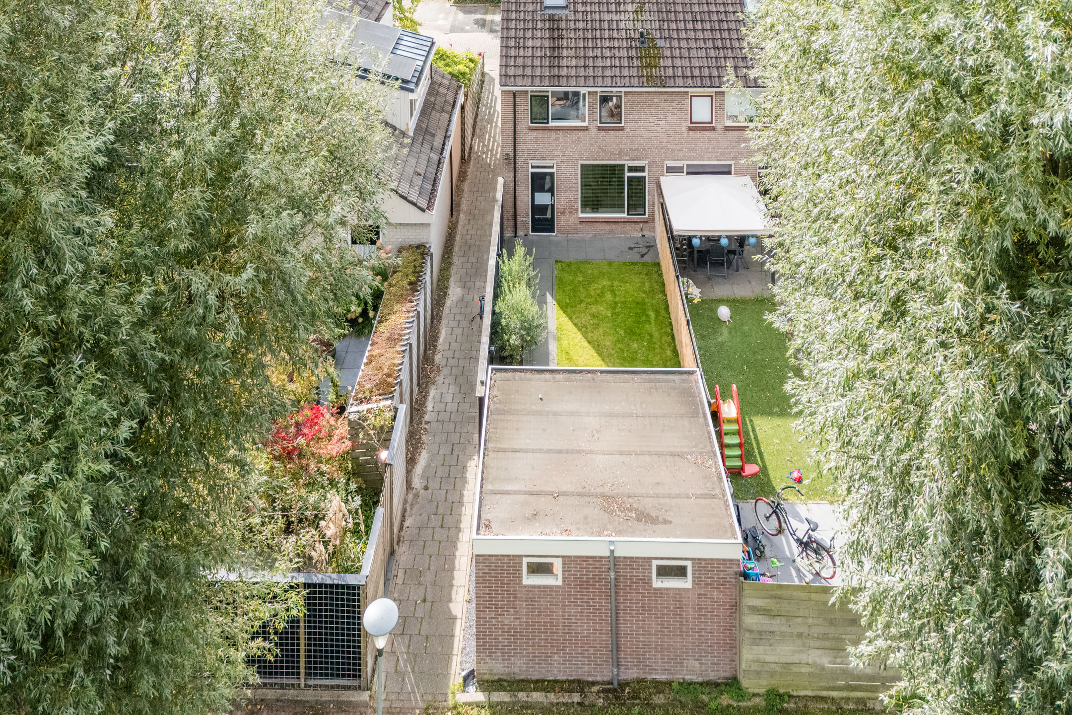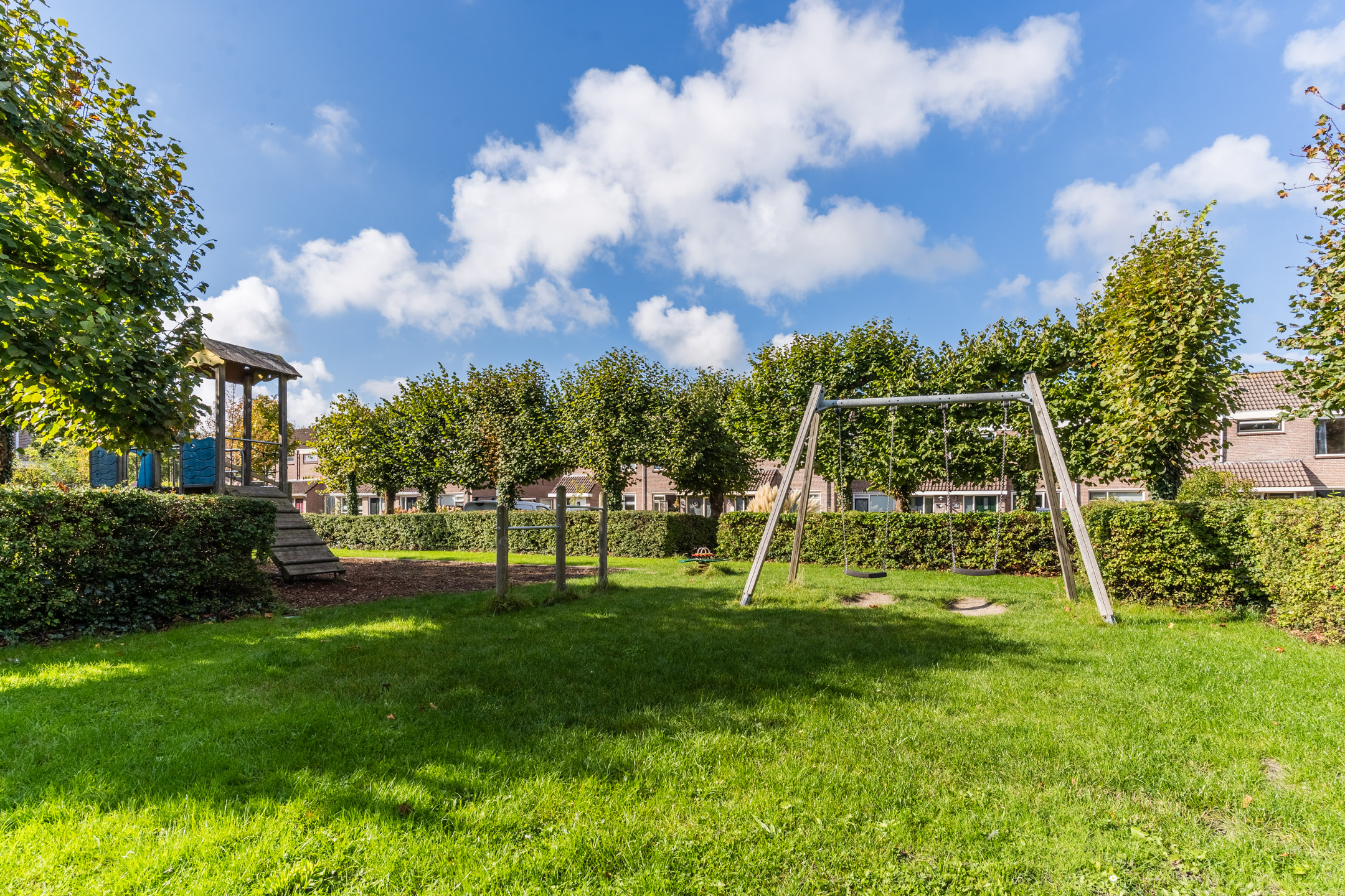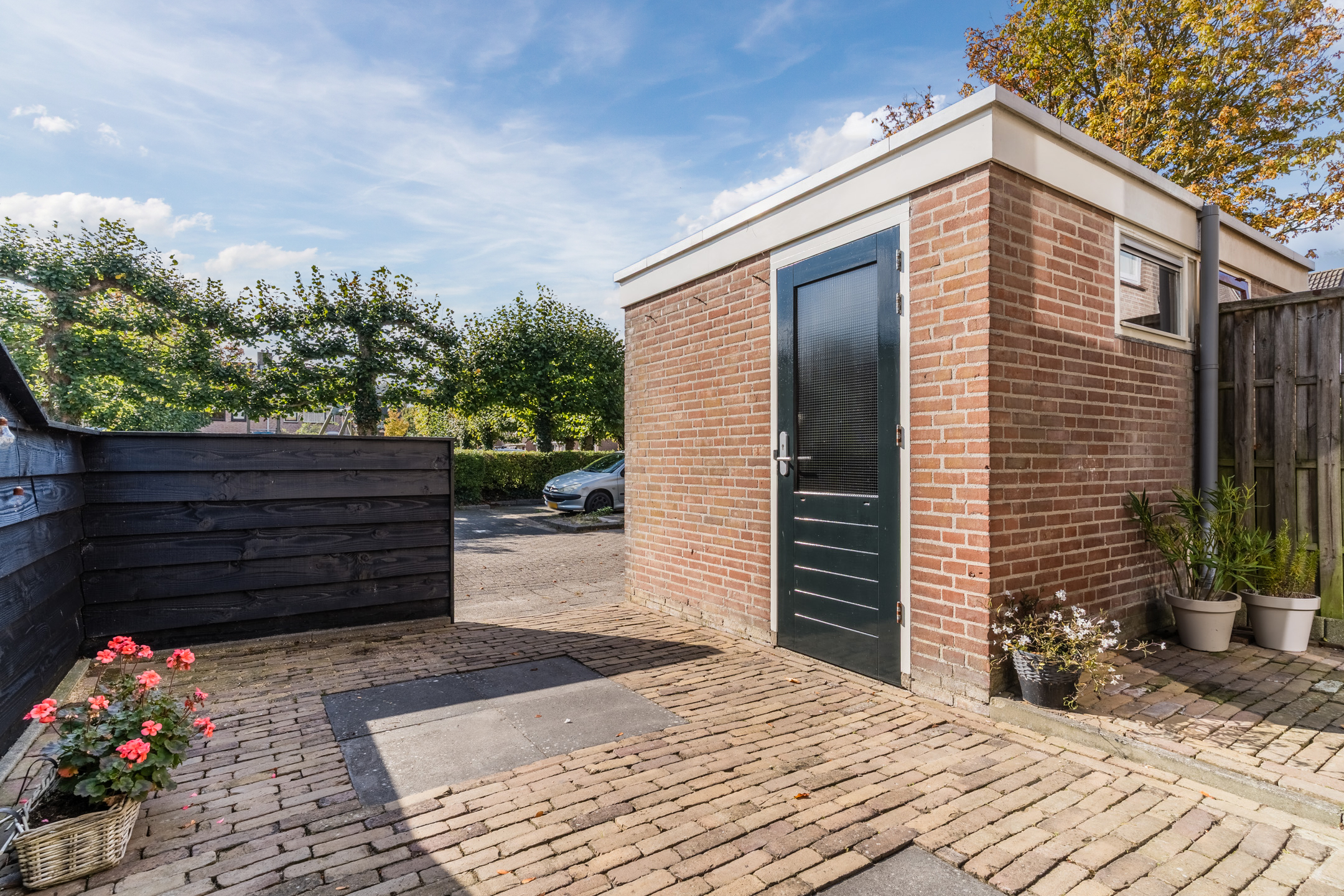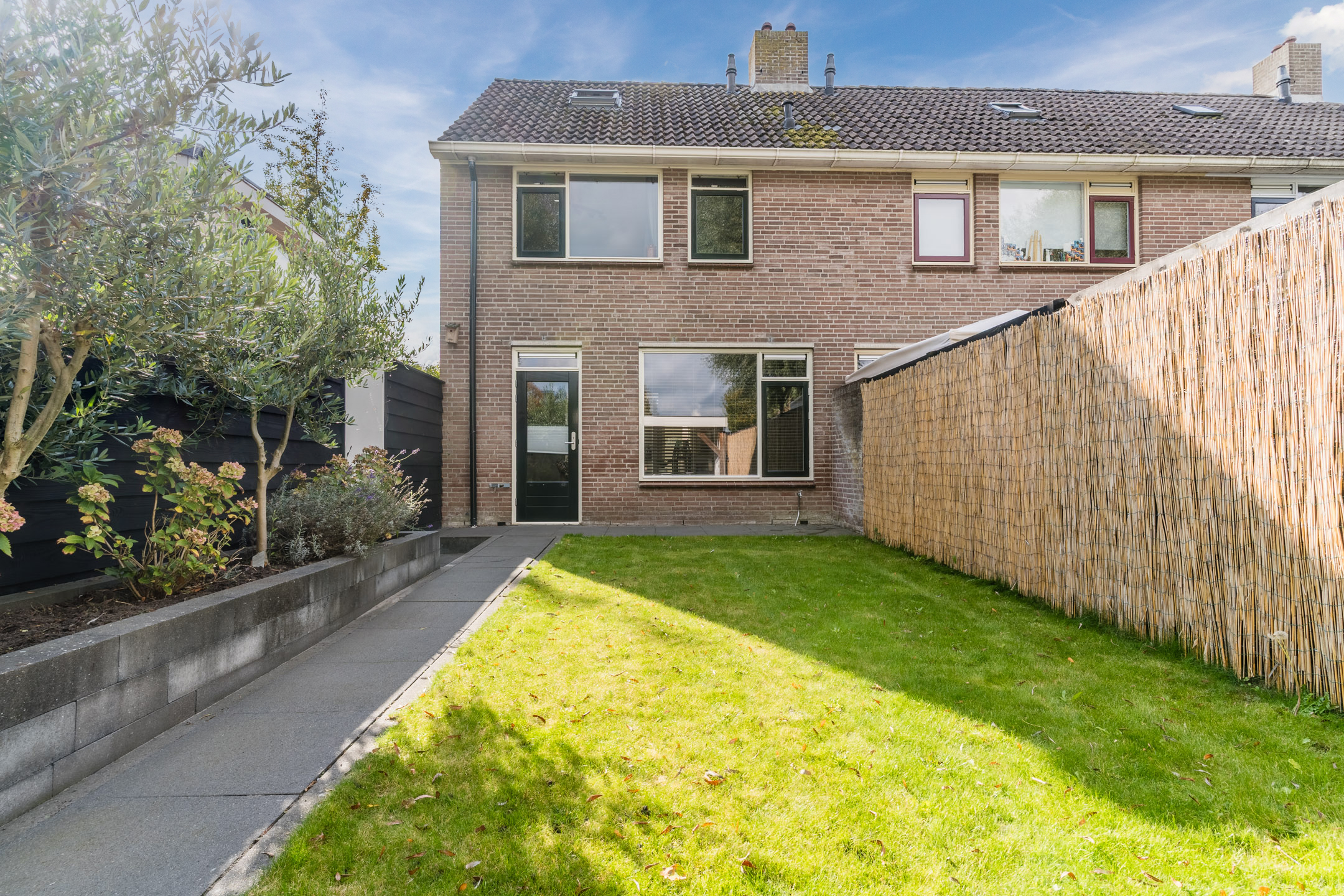 De ruime achtertuin is gelegen op het noorden en fraai aangelegd met een groot grasveld omlijst door groene borders en een betegeld pad naar een gezellige tuinkamer onder een houten veranda achterin de tuin. Omdat de tuin grenst aan een groenstrook en sloot, heb je geen directe achterburen en zit je in de tuin heerlijk rustig en prive.