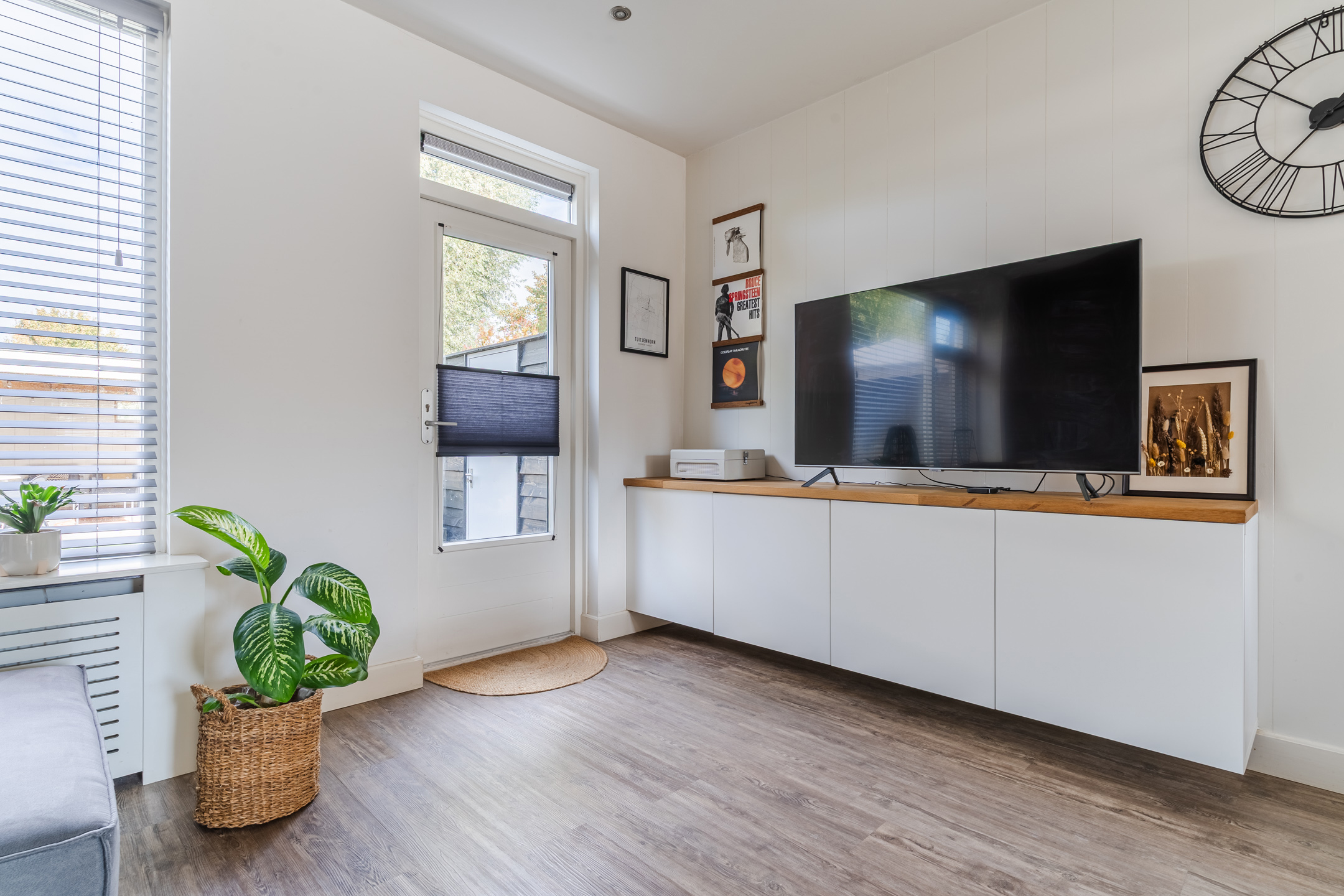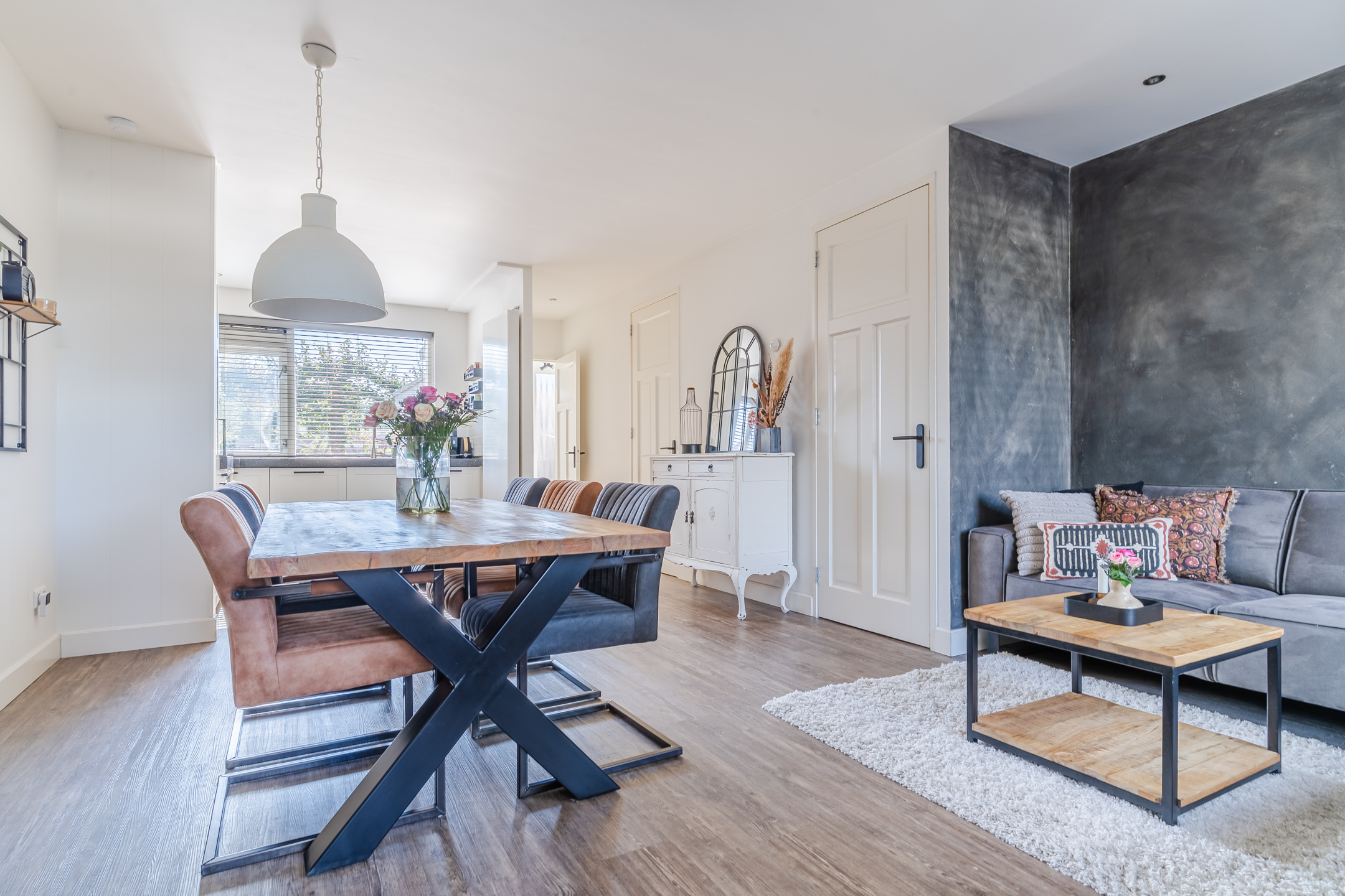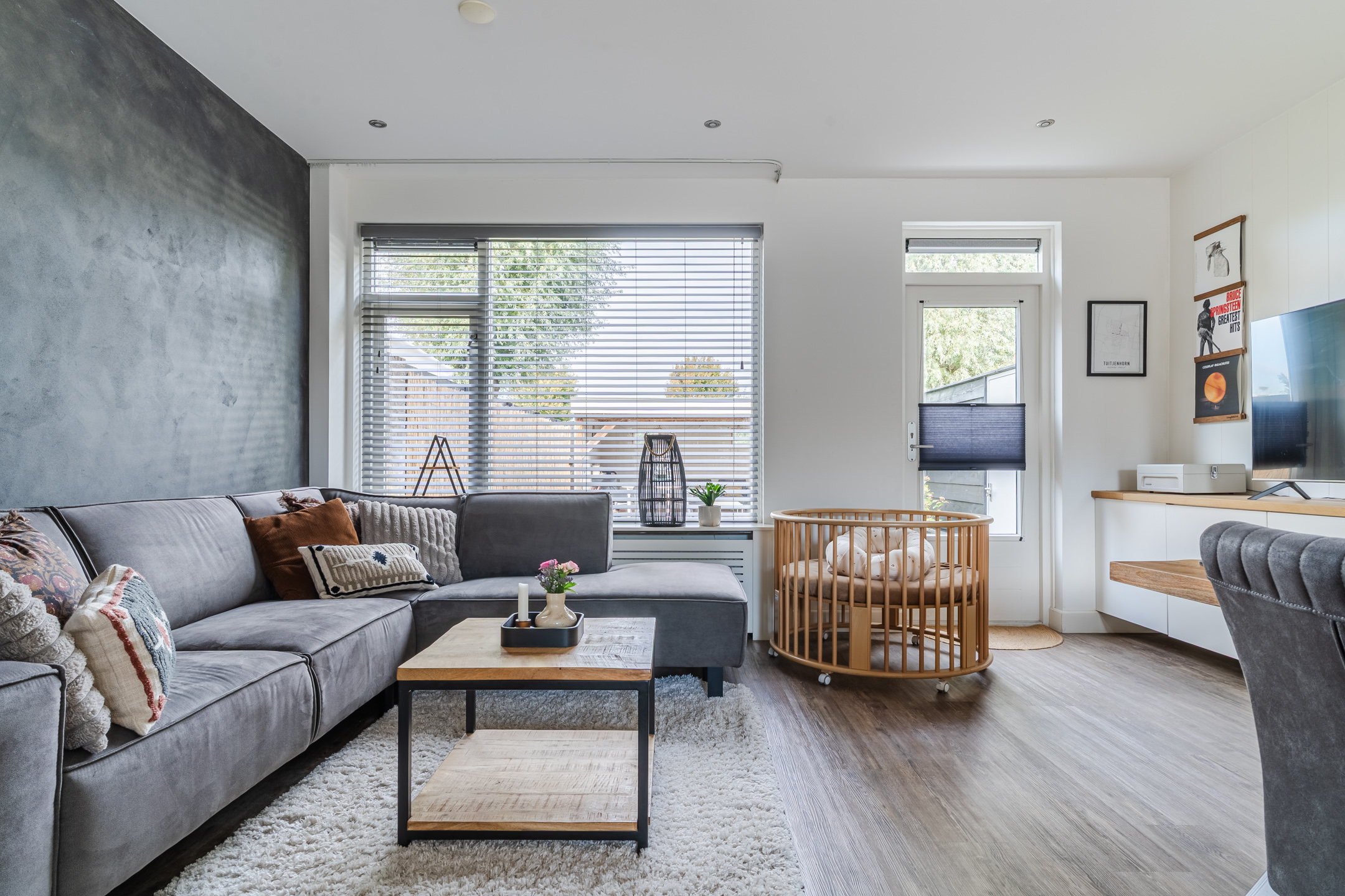 Achter de voordeur vinden we de compacte entreehal met de meterkast en de toegang tot de zonnige woonkamer met open keuken.