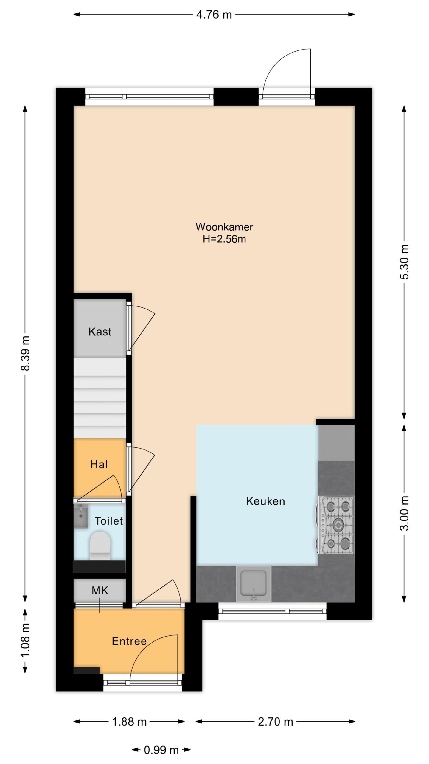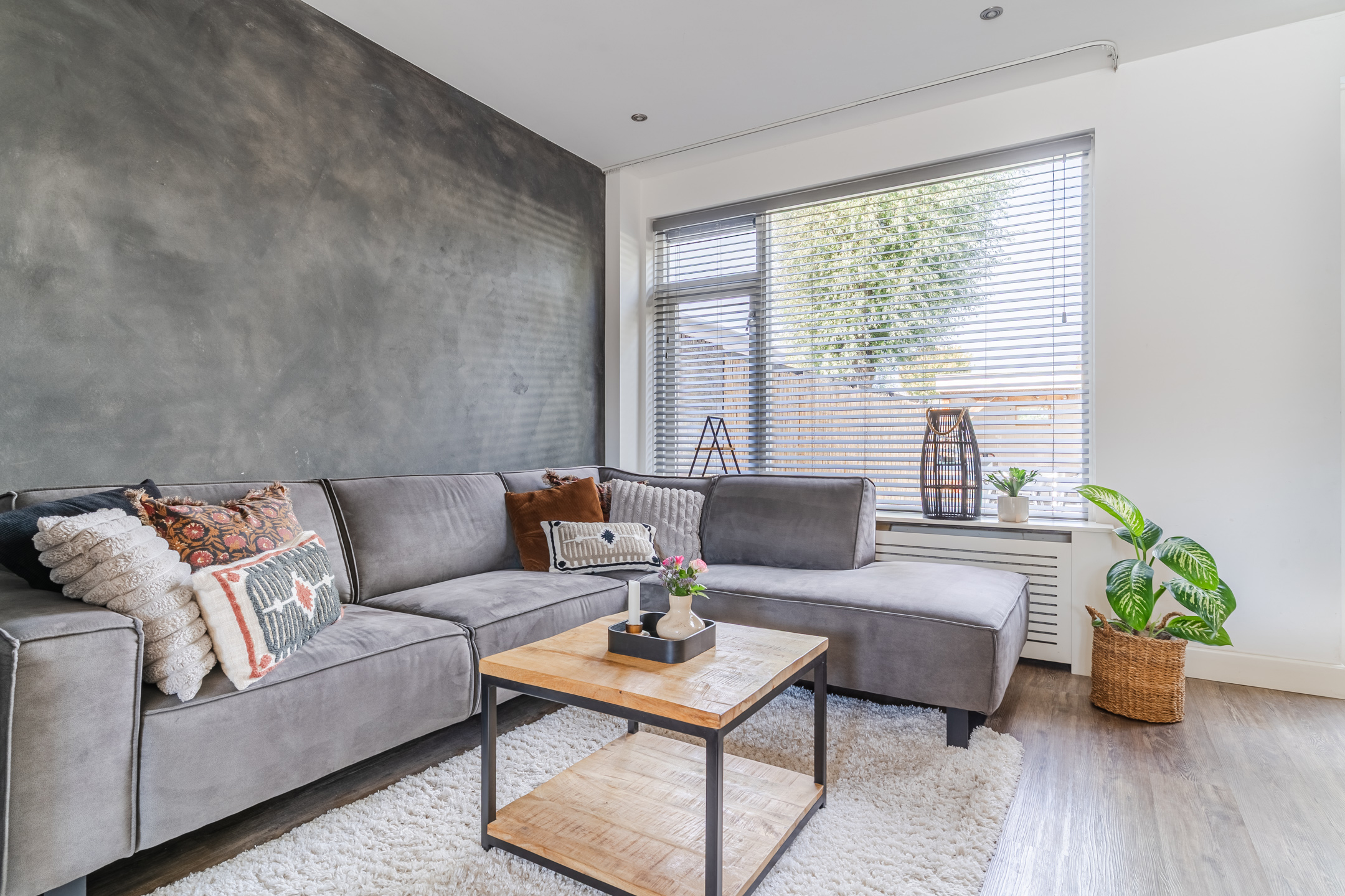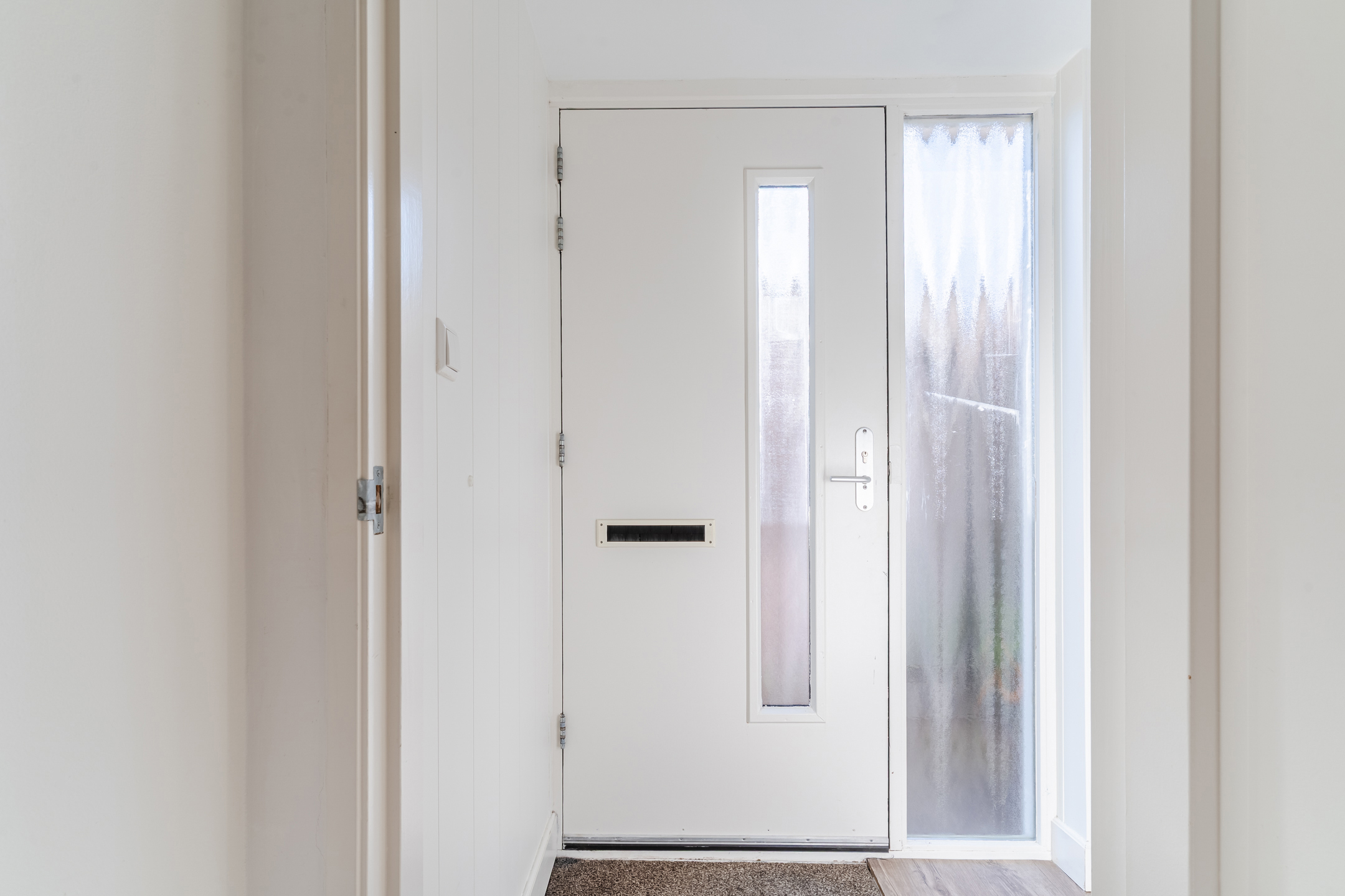 Achter de voordeur vinden we de compacte entreehal met de meterkast en de toegang tot de zonnige woonkamer met open keuken.