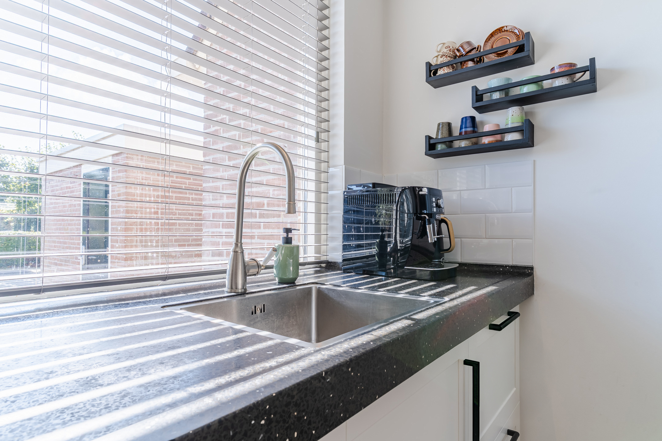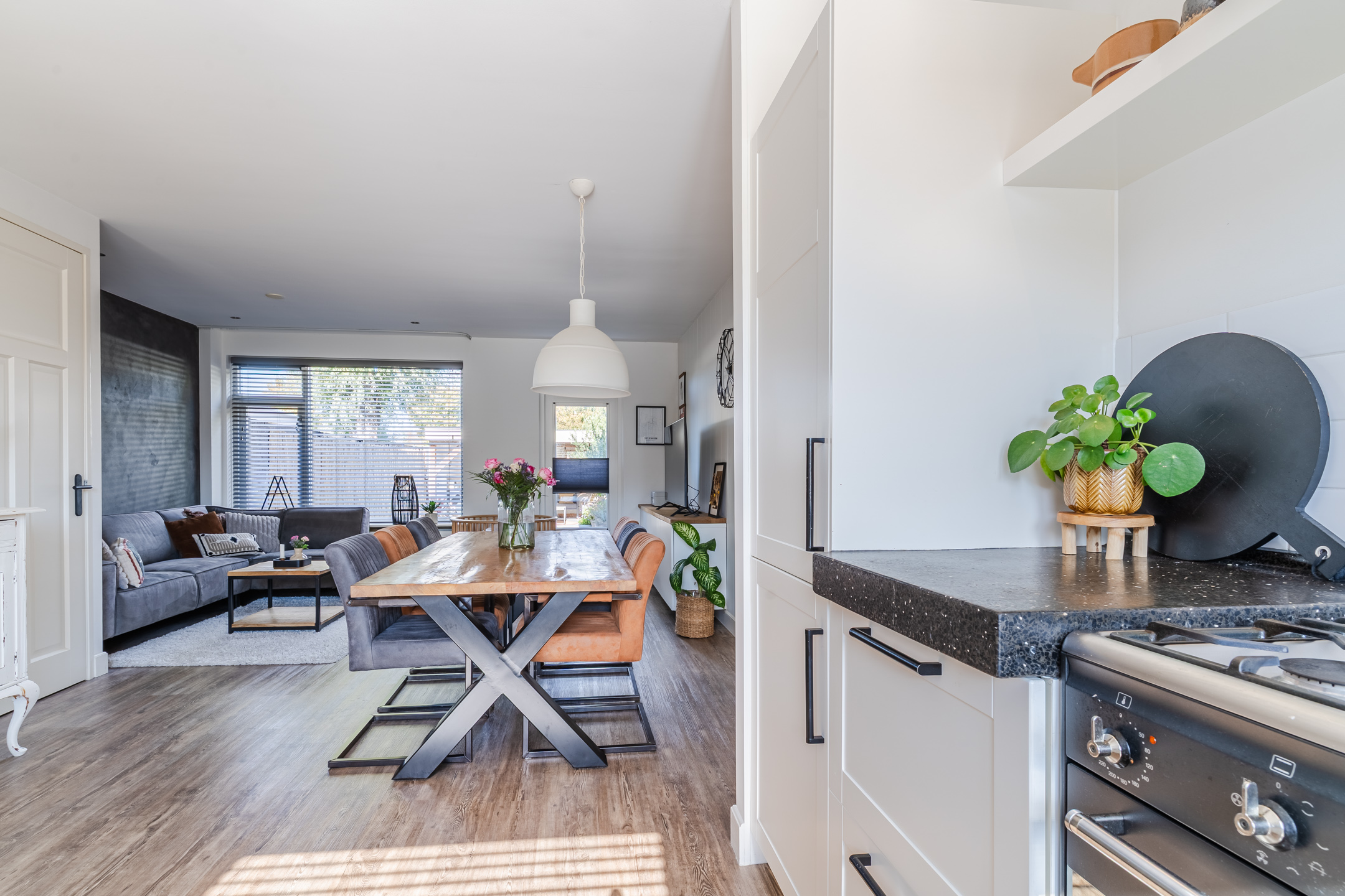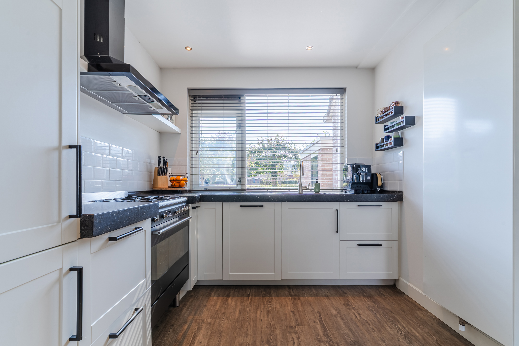 De open keuken bevindt zich aan de voorzijde van de woning en is uitgevoerd met een gaskookplaat, oven, koelkast vriezer en een vaatwasser.