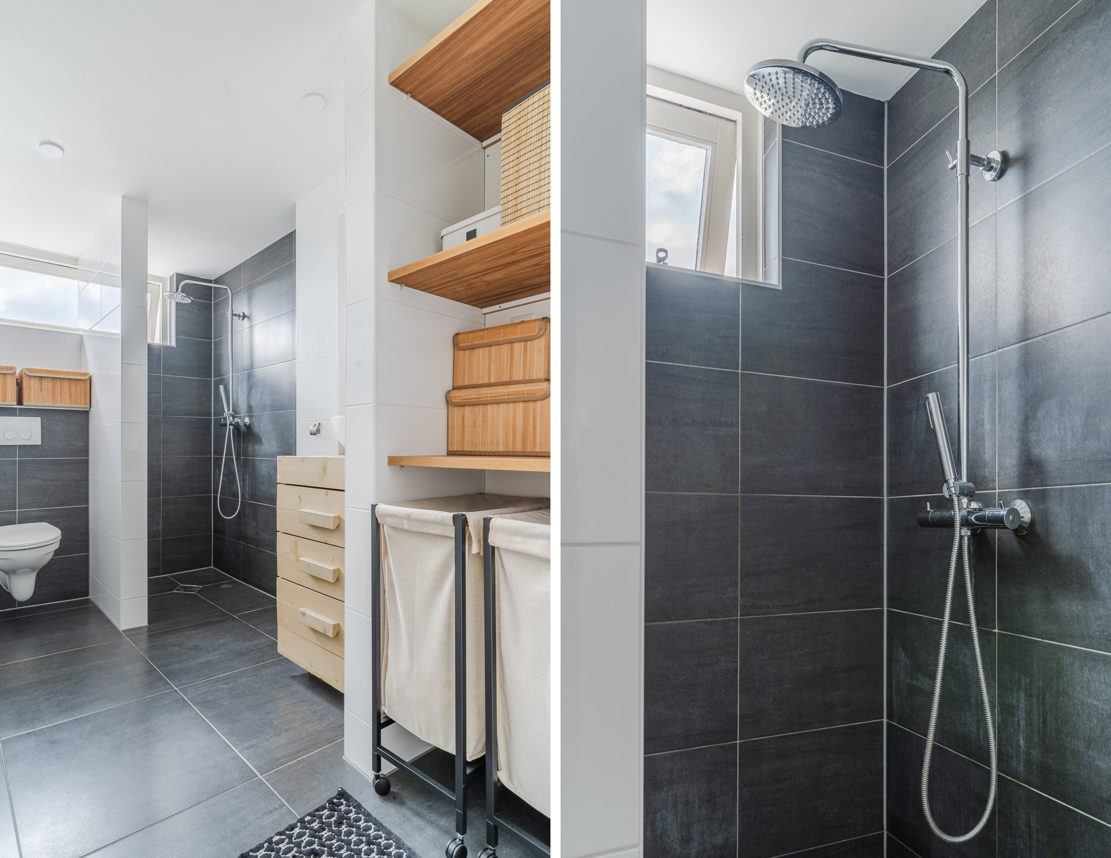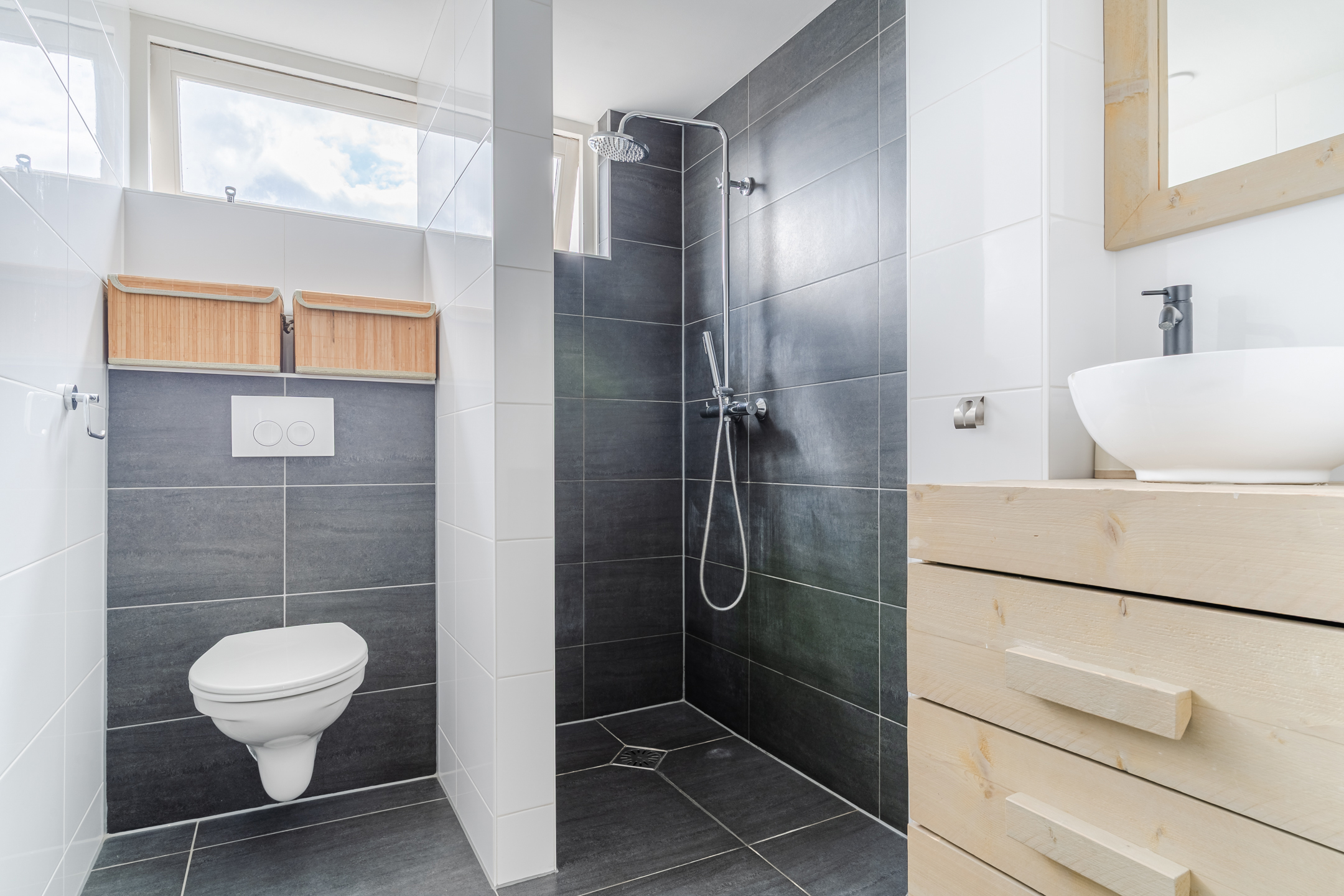 De moderne badkamer beschikt over inbouwspots, een tweede toilet, wastafel met meubel en een inloopregendouche.