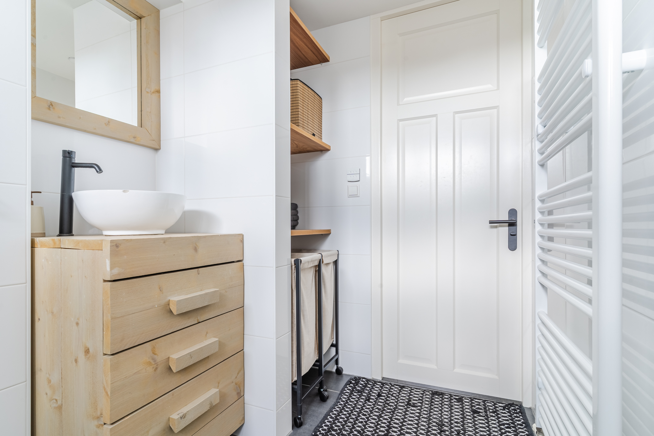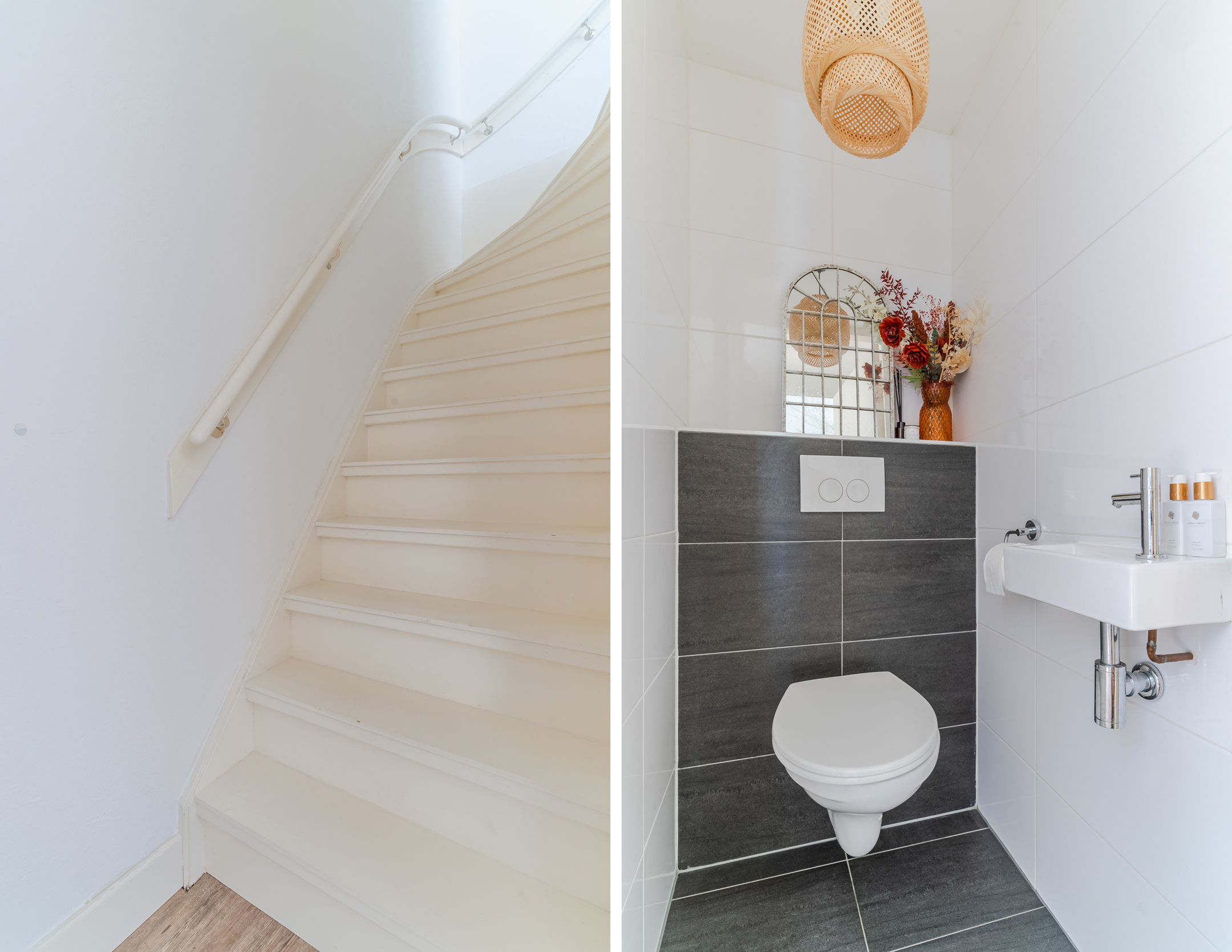 Een achterdeur biedt toegang tot de tuin en de benedenverdieping is netjes afgewerkt met een laminaatvloer. Er is een aparte hal met het gastentoilet met fonteintje en de trapopgang naar de eerste verdieping.