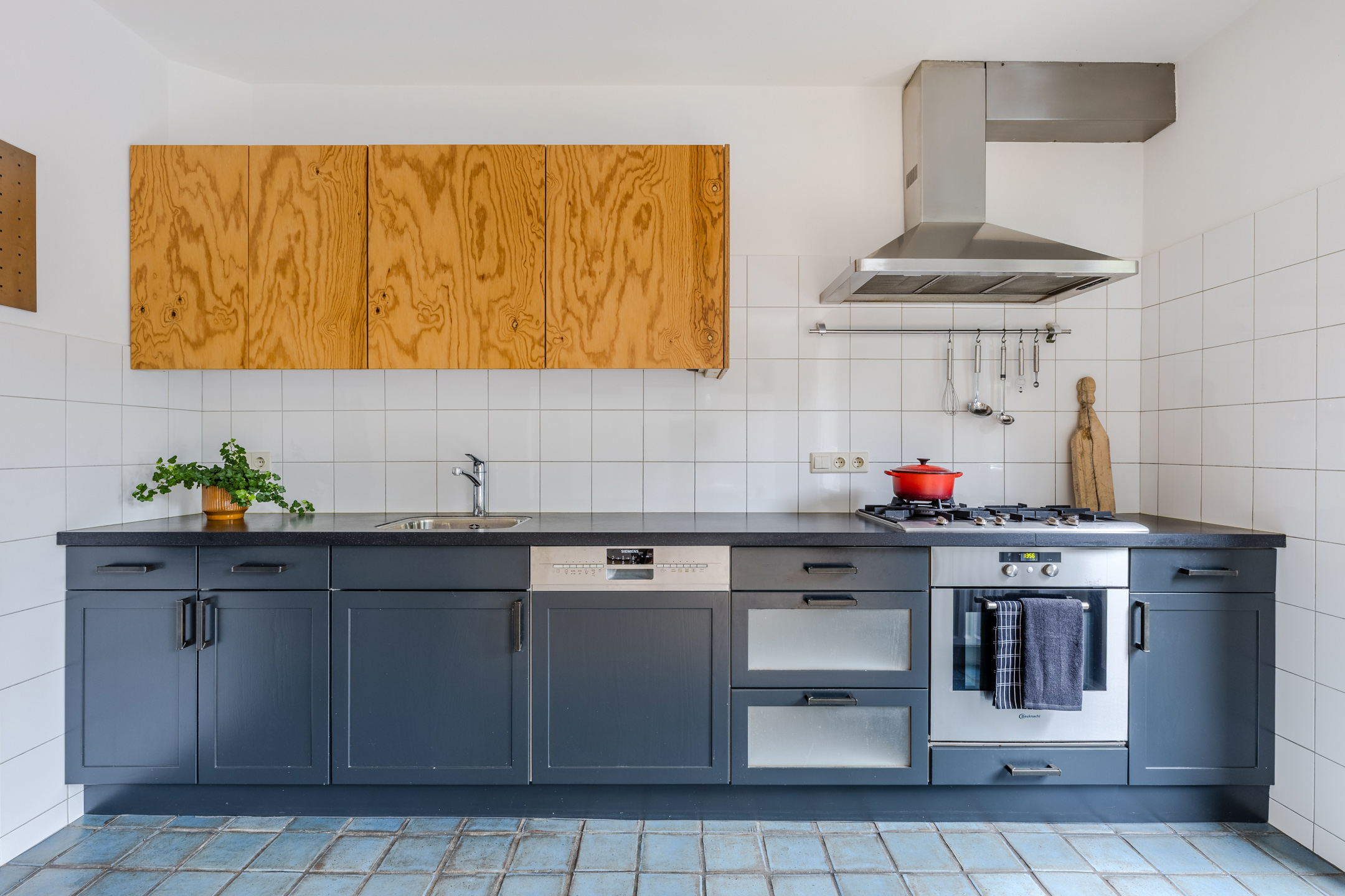 Vanuit de woonkamer lopen we door naar de open keuken die zich aan de tuinzijde van de woning bevindt en voorzien is van een gasfornuis, oven en een vaatwasser. Tevens is er een warmwaterboiler, de boiler zelf bevindt zich achter de kelderdeur.
