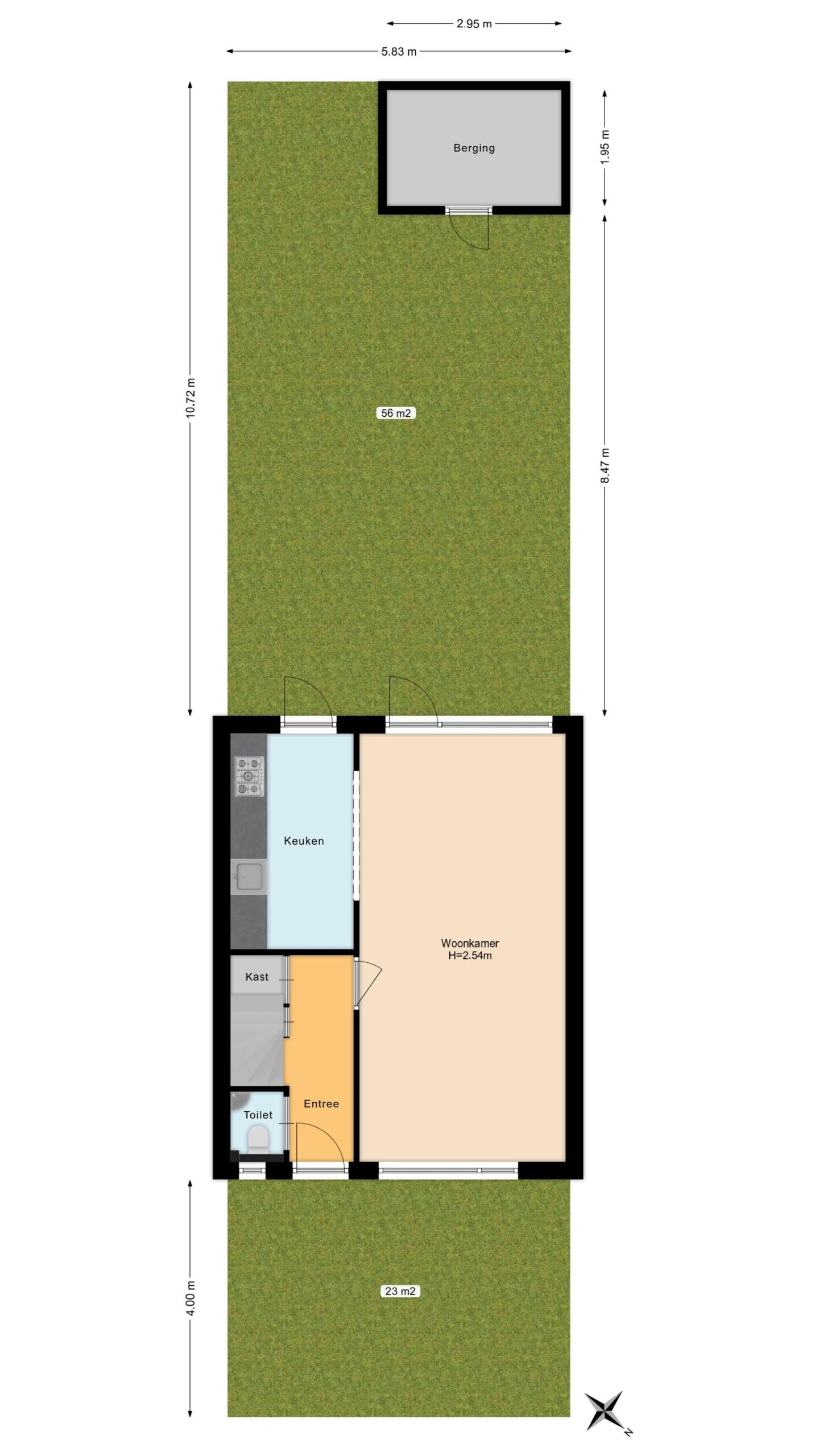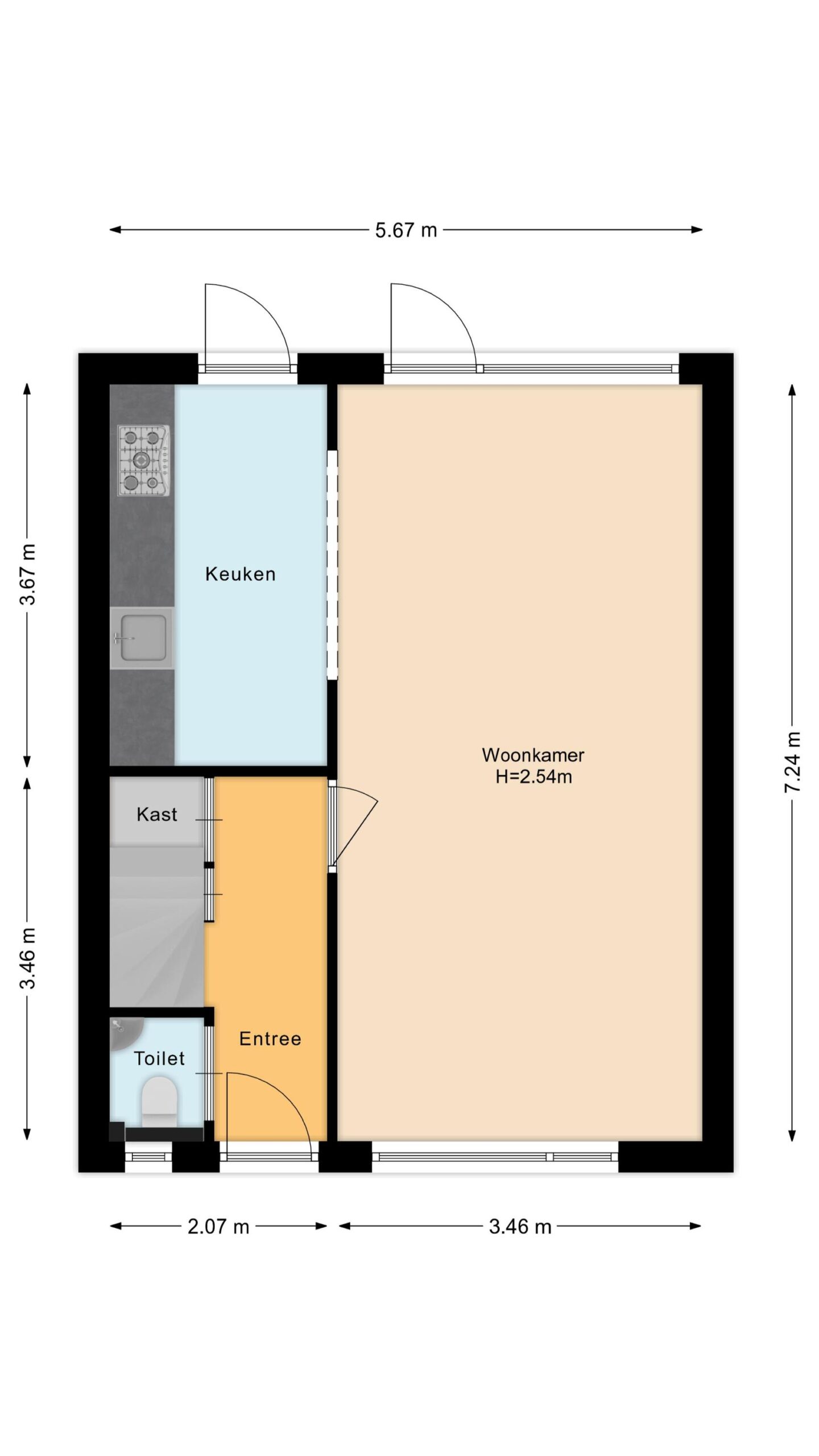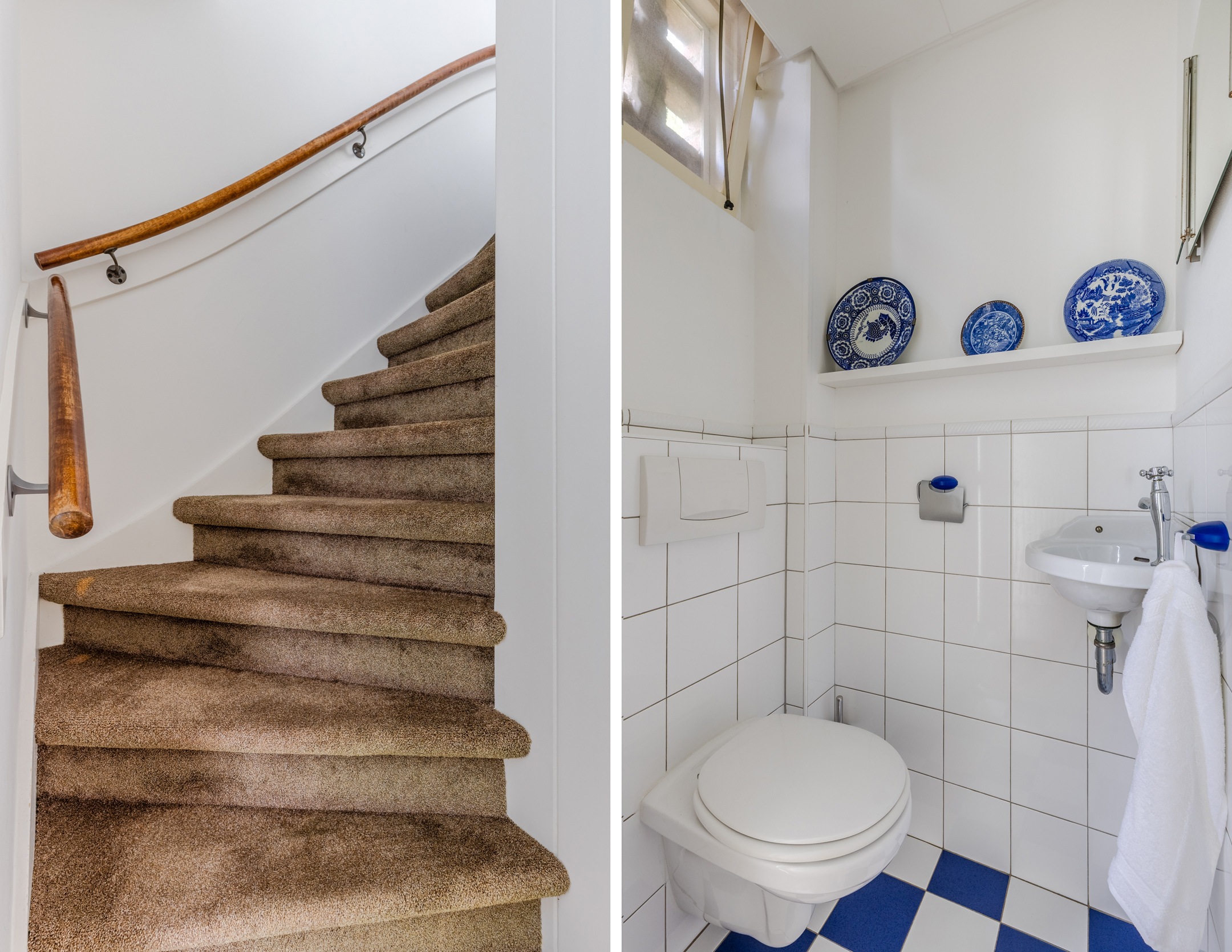 Achter de voordeur vinden we de entreehal met garderobe, gastentoilet met fonteintje, trapopgang naar de eerste verdieping, deur naar de kelder en de meterkast, incl. toegang tot de woonkamer met open keuken.
